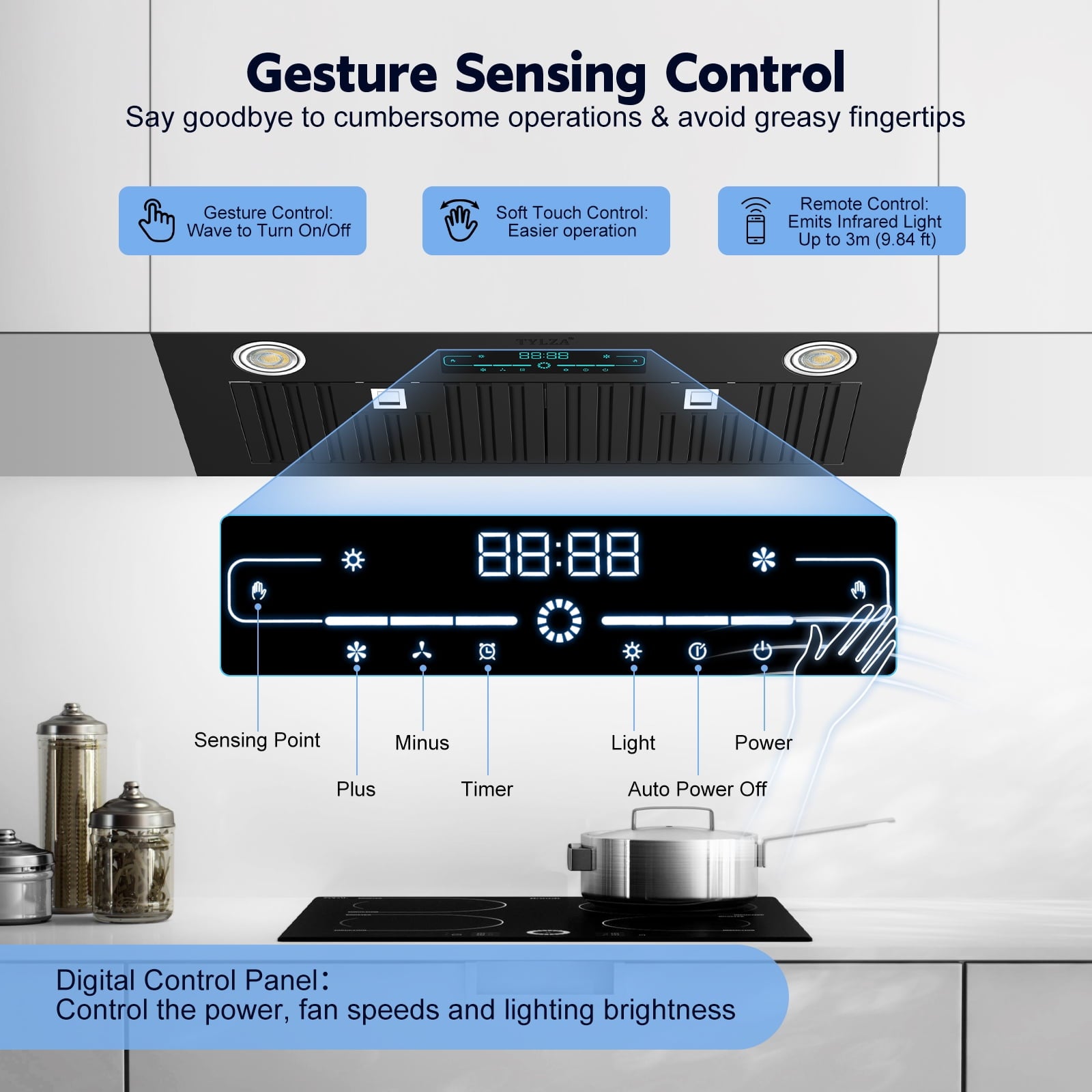 Touch & Remote Control: This insert vent hood adopts three optional control methods. The acrylic smart screen provides ease of use by simply touching to select the modes you need. It is also equipped with a remote control, gesture sensing which can be operated from a distance effortlessly. Thanks to these three labor-saving methods, it’s easy for you to adjust between 4 speeds, turn on/off the lights, and switch between clock & delayed shutdown function.