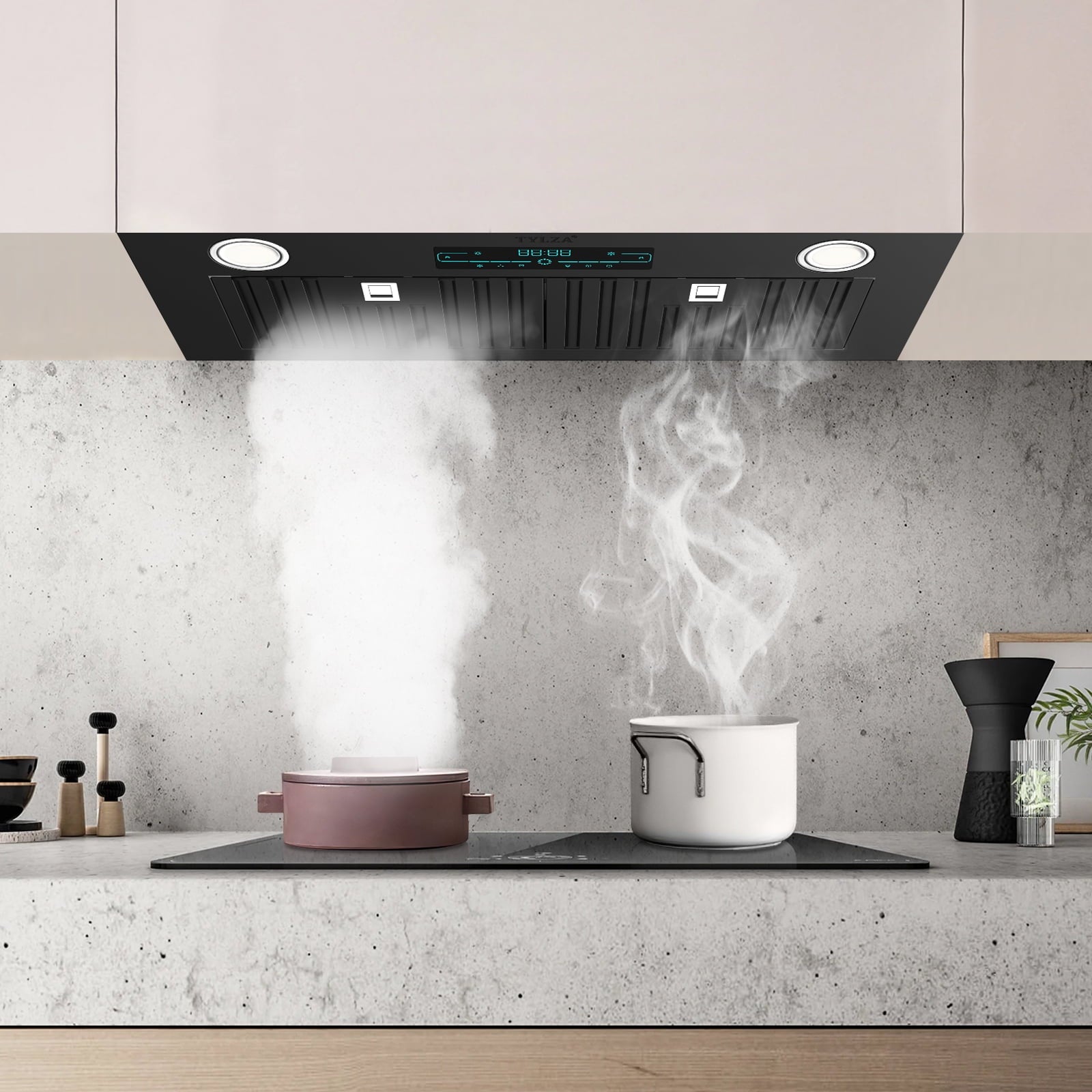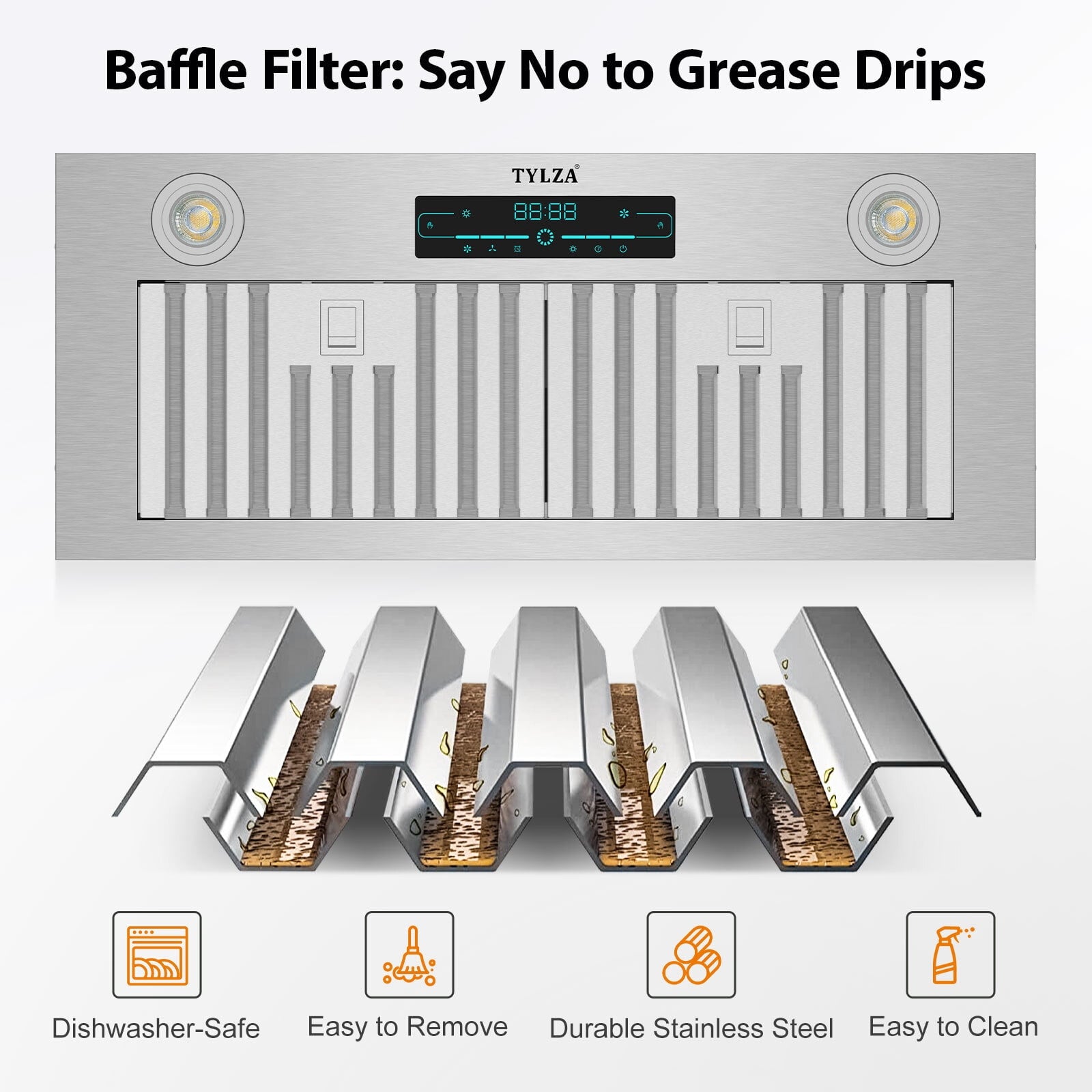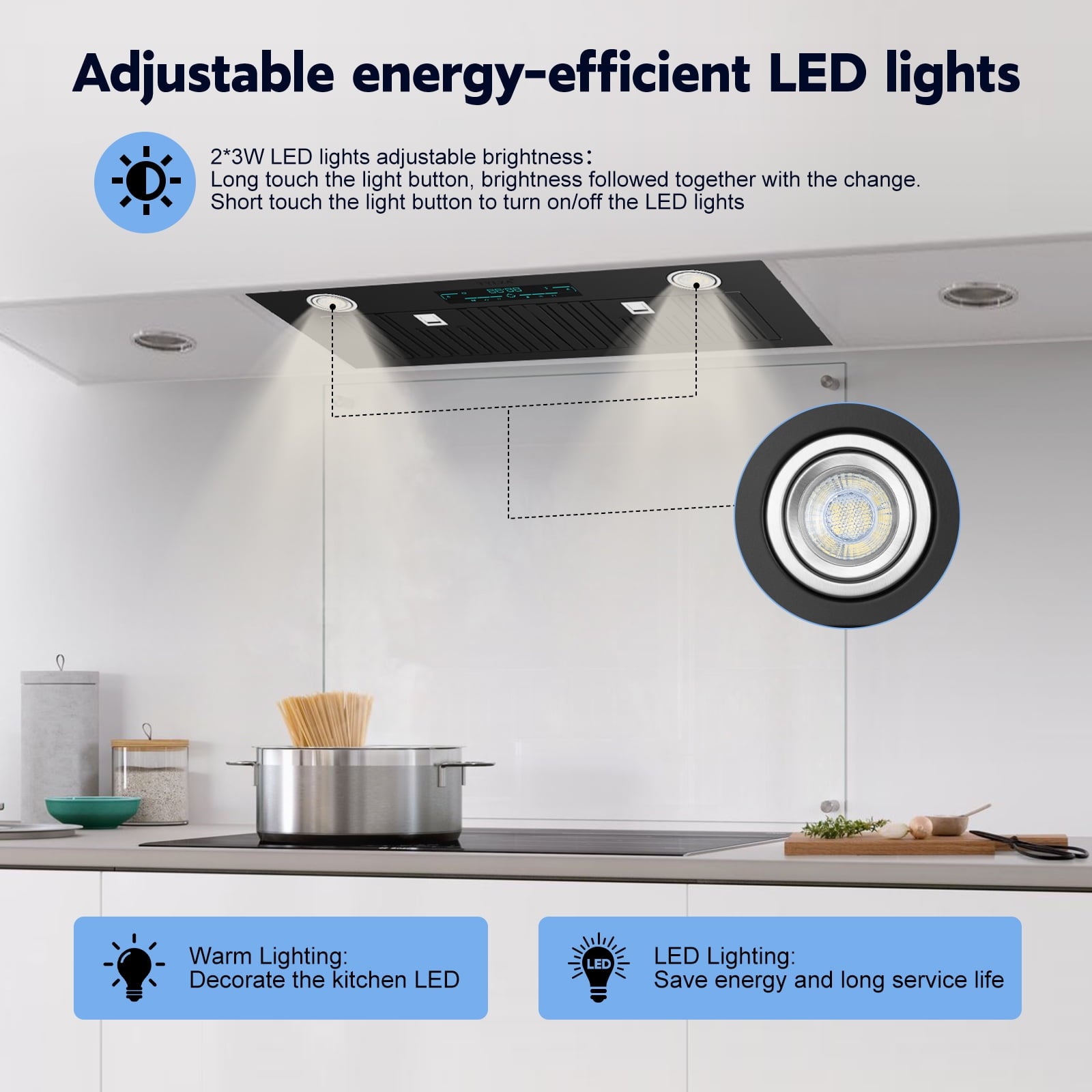 Humanized Design: With the built-in design, our range hood is easy to install and saves your kitchen space. It includes three 3W LED lamps with warm light, which are bright but not dazzling, and energy-saving.