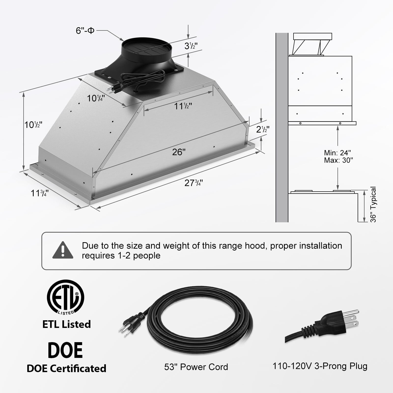 Powerful But Quiet: The main body of our built-in range hood is made of stainless steel, with ETL certification, providing high strength and durability. It is rust-proof and corrosion-proof for easy cleaning.