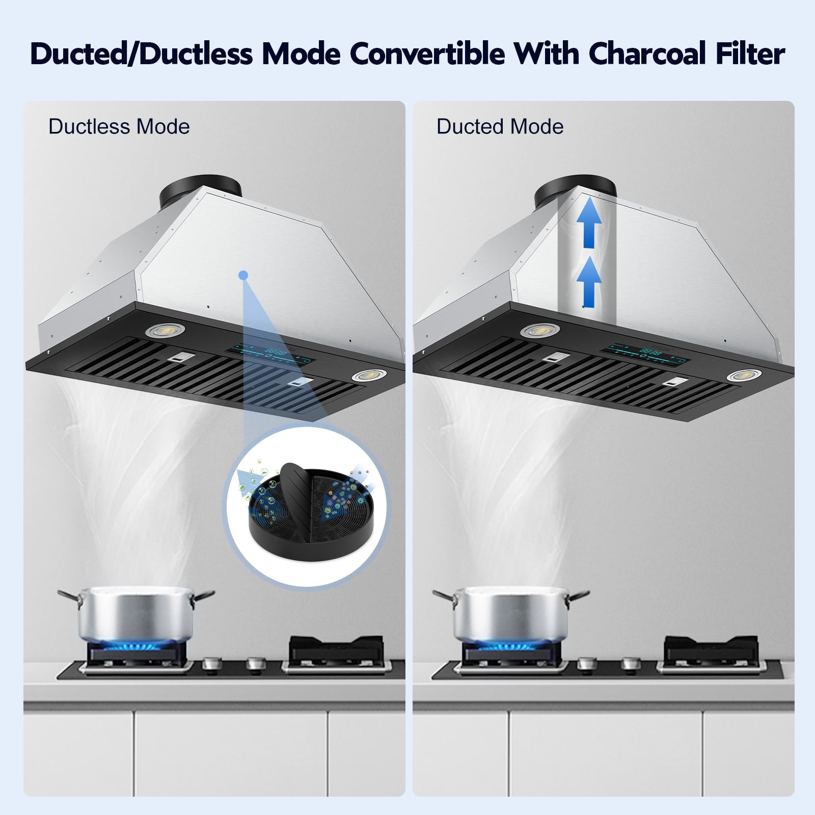 Ducted/Ductless Convertible: Our insert kitchen range hood is suitable for ducted and ductless kitchens. With an extra detachable duct, fully-filtered fresh air can be circulated indoors or discharged outdoors.
