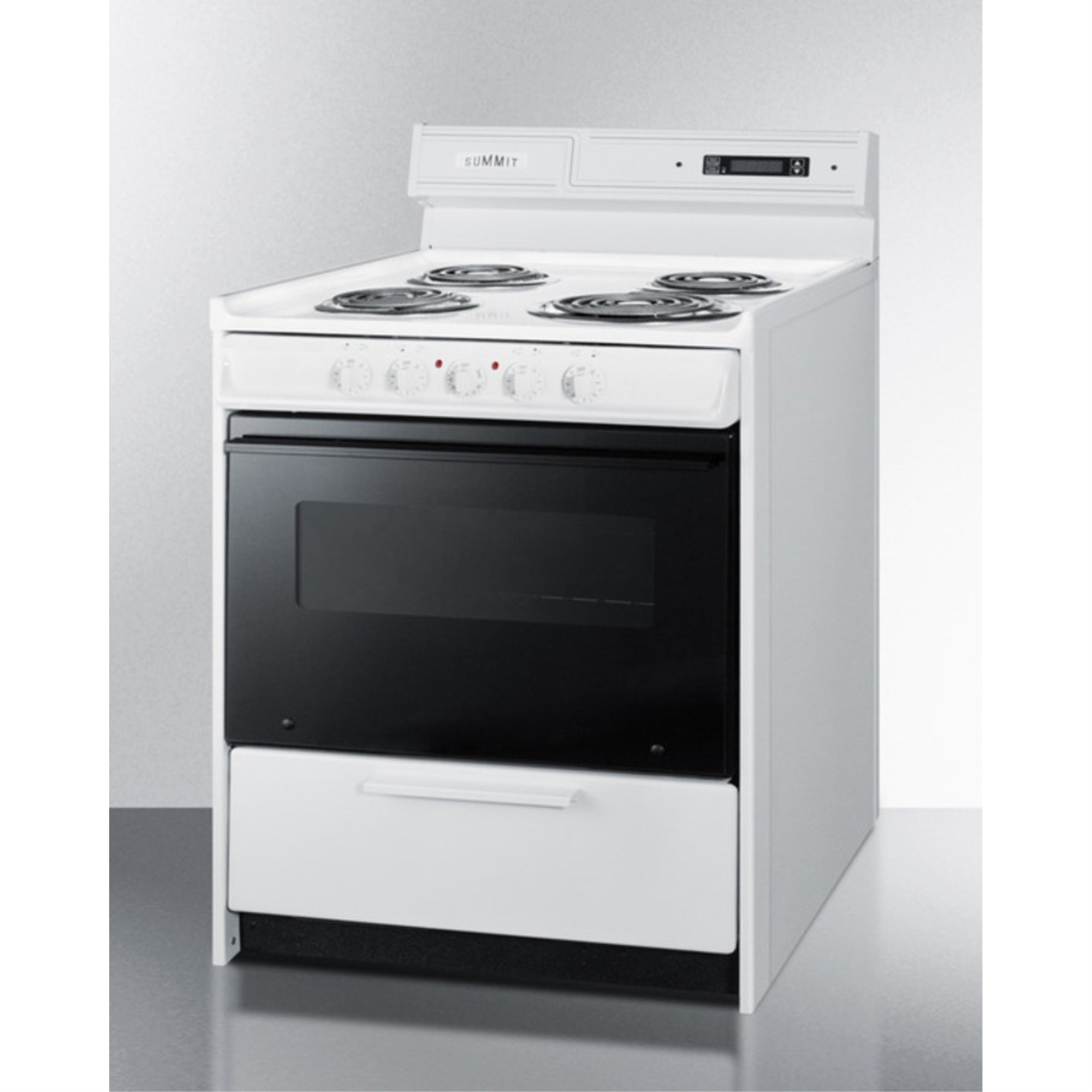 Summit Appliance offers a wide selection of American-made household ranges built for long-lasting durability in space-challenged kitchens. The WEM230DK is an apartment-sized 220V electric range sized at 30″ wide, with a generous 3.7 cu.ft oven interior that can accommodate large trays. The black glass oven window and interior light with an on/off switch make it easy to monitor your cooking without opening the door. Two adjustable oven racks are included. The waist-high broiler is located inside the oven, allowing you to switch functions without moving contents to a separate compartment on the floor. The lower drop-down storage compartment is ideal for keeping pots and pans out of the way in small kitchens. Designed to meet the most current UL safety standards, this unit features one 8″ 950W and three 6″ 650W coil elements. These operate at lower wattage than standard electric ranges, allowing for a slow but steady heating process that will not cycle off. Upfront push-to-turn knobs offer additional protection, ensuring users won’t reach over hot burners to adjust the heat. This unit complies with ADA guidelines.The WEM230DK comes in a classic white finish to suit any kitchen. It has a recessed oven door and is conveniently sized at just 24″ deep for a better fit in galley in L-shaped kitchens, where every inch counts. Porcelain and steel construction help the unit hold up to years of daily use. We include an anti-tip bracket for added safety. This unit does not include a line cord (a standard 40 amp 3 or 4-prong cord can be installed by your electrician). With its classic style and quality construction, Summit’s made in the USA cooking line offers reliable cooking for smaller homes. Additional choices are available in 20″, 24″, and 36″ wide fits.