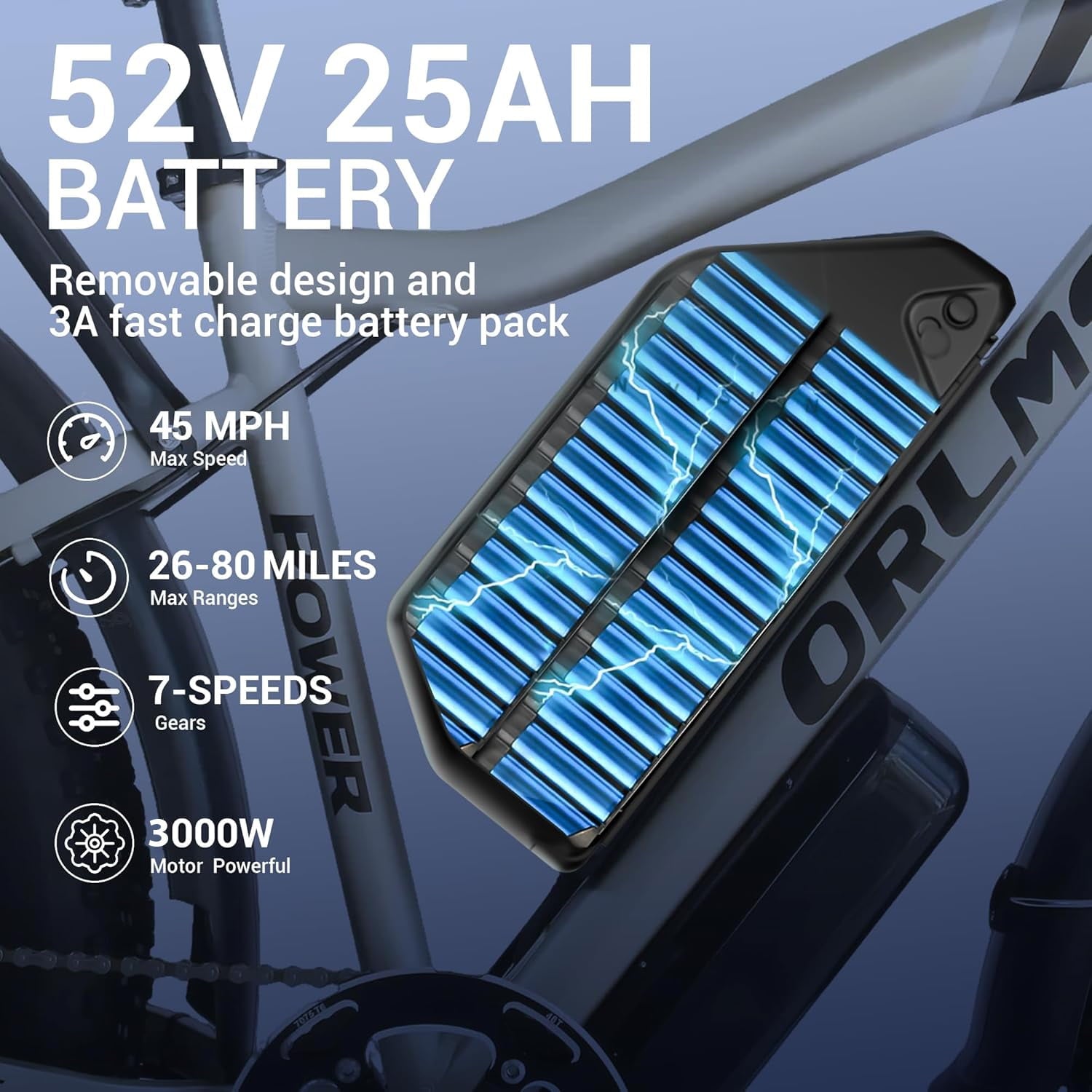 - 52V 25Ah High-Capacity Battery:Ride farther and longer with an extended-range lithium battery, offering up to 60+ miles per charge* (varies by terrain and riding mode).