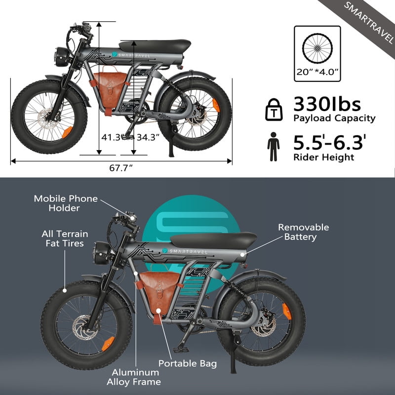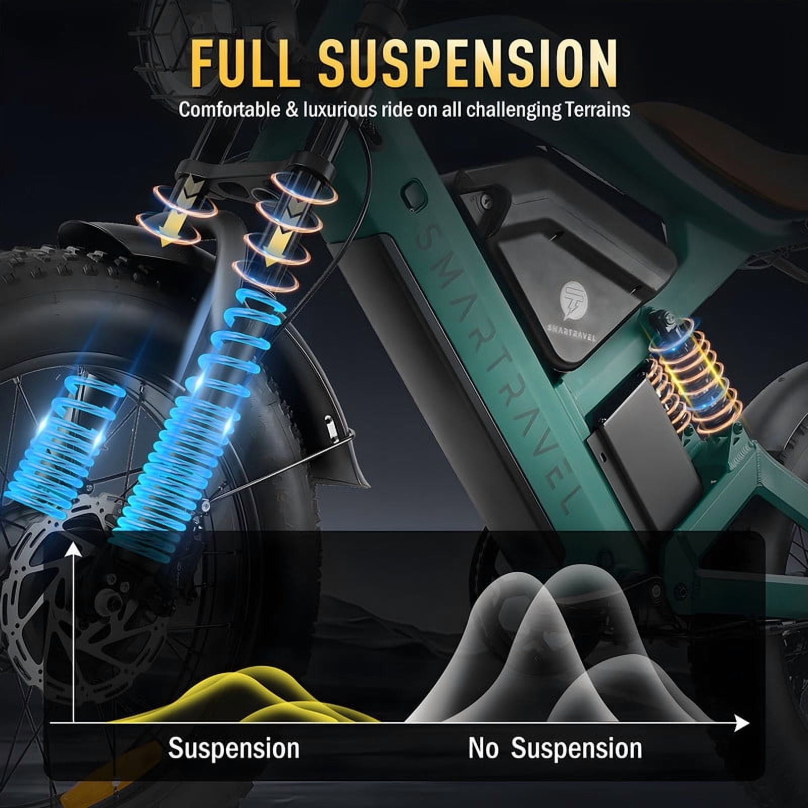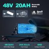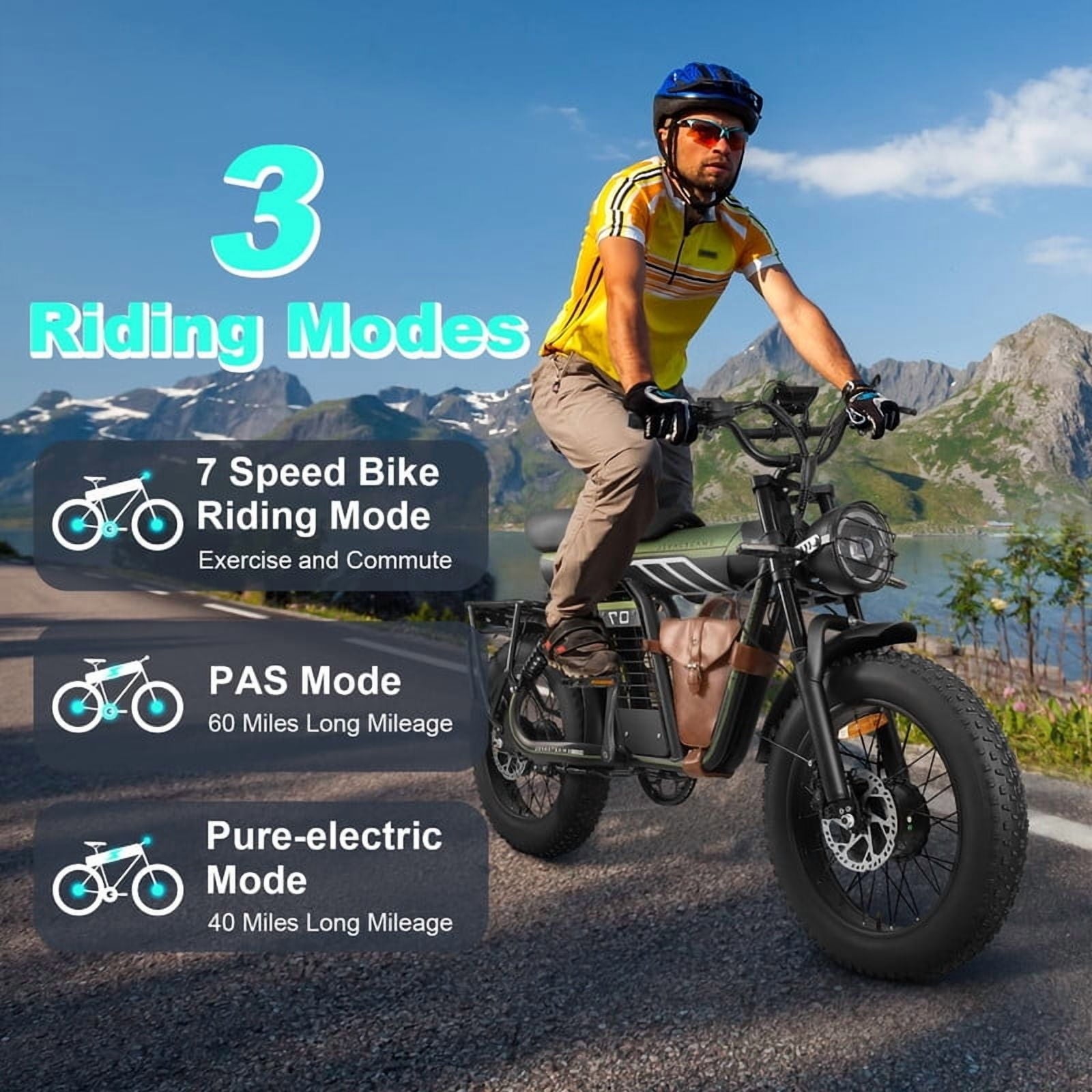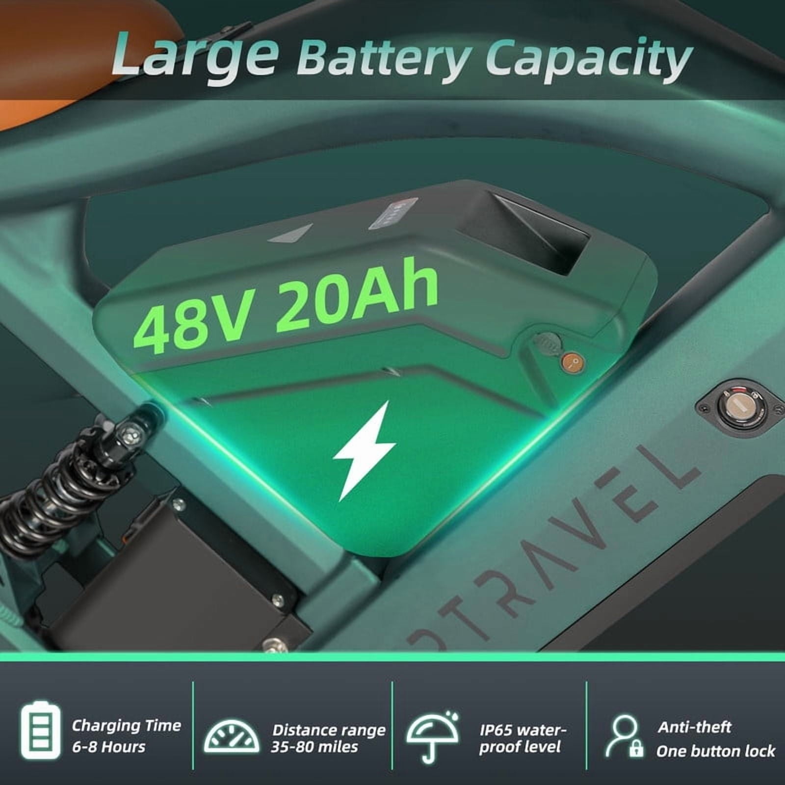 - 【52V 50Ah High-Capacity Battery】Equipped with a 52V 50Ah lithium-ion battery (1296Wh), this e-bike delivers extended range, stability, and safety compared to standard 2500mAh cells. Riders can travel up to 60 miles in full electric mode or over 92 miles with pedal assist. Designed for long-term performance, the battery maintains 80% capacity even after 800 charge cycles and includes smart protection features for safe, efficient power every ride.