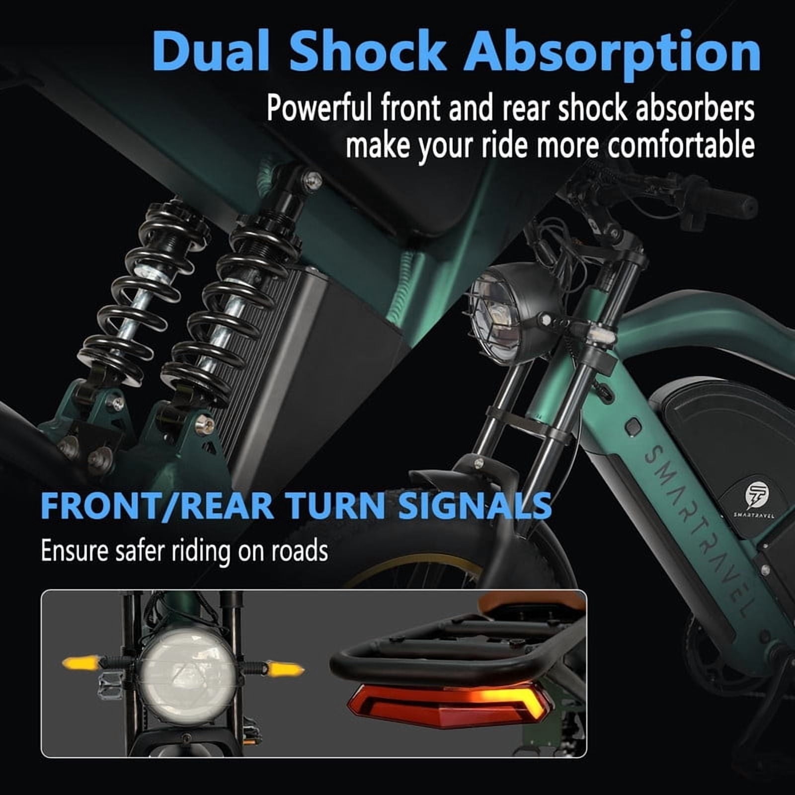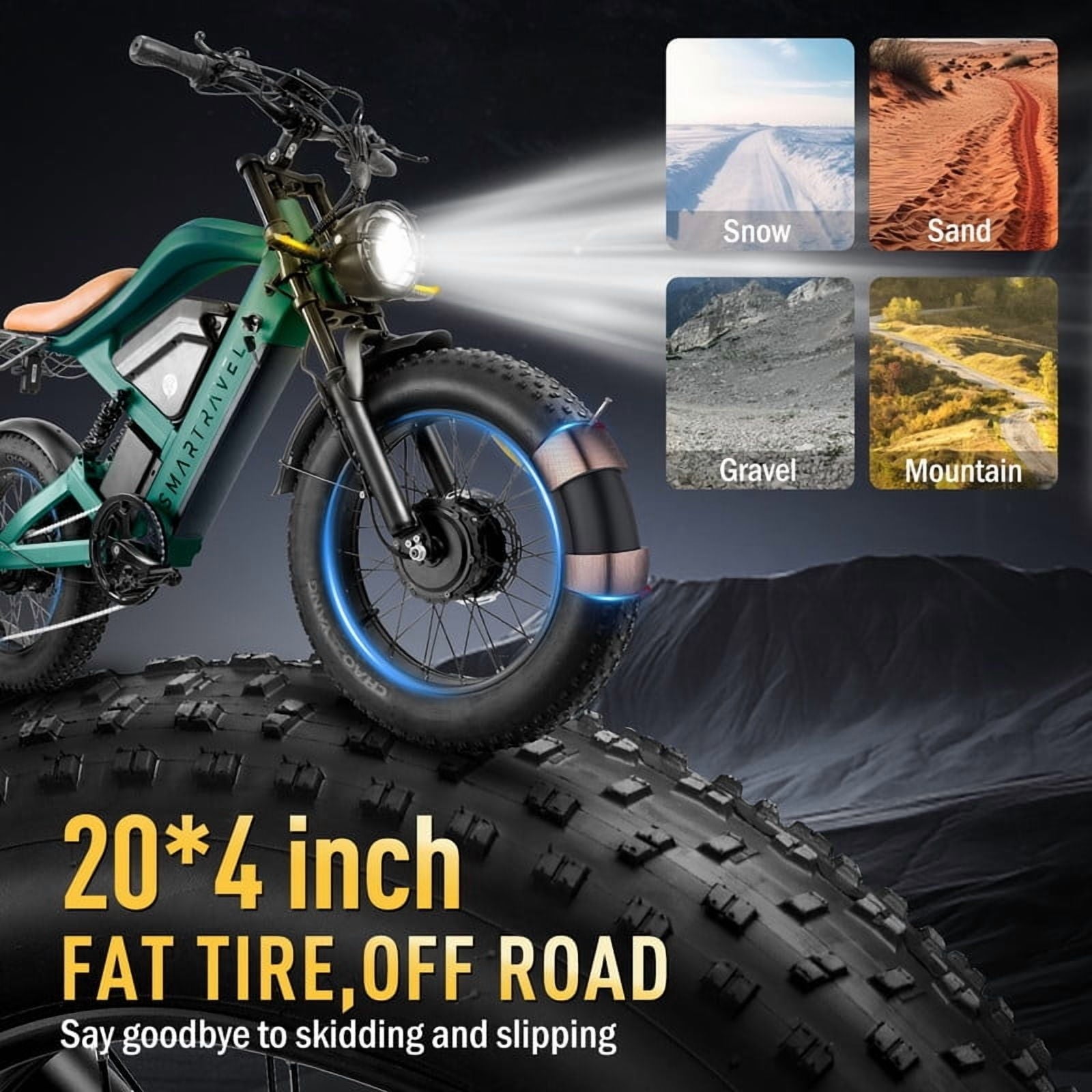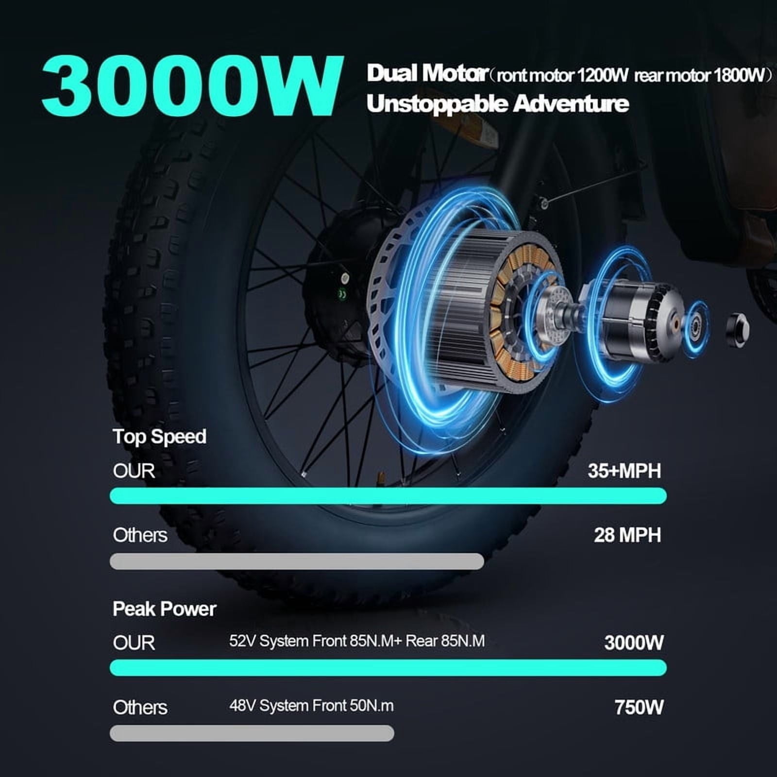 - 【Powerful Dual 1500W Geared Hub Motor】The upgraded Dual 1500W brushless geared hub motor delivers strong performance with 86 N·m torque, making it easy to conquer steep hills and tough terrain. Built with a heat-resistant inner ring and enhanced heat dissipation, it ensures durability and longer motor life. Equipped with advanced FOC technology, the system automatically adjusts to real-time riding conditions for smooth, efficient power and reliable performance on every ride.