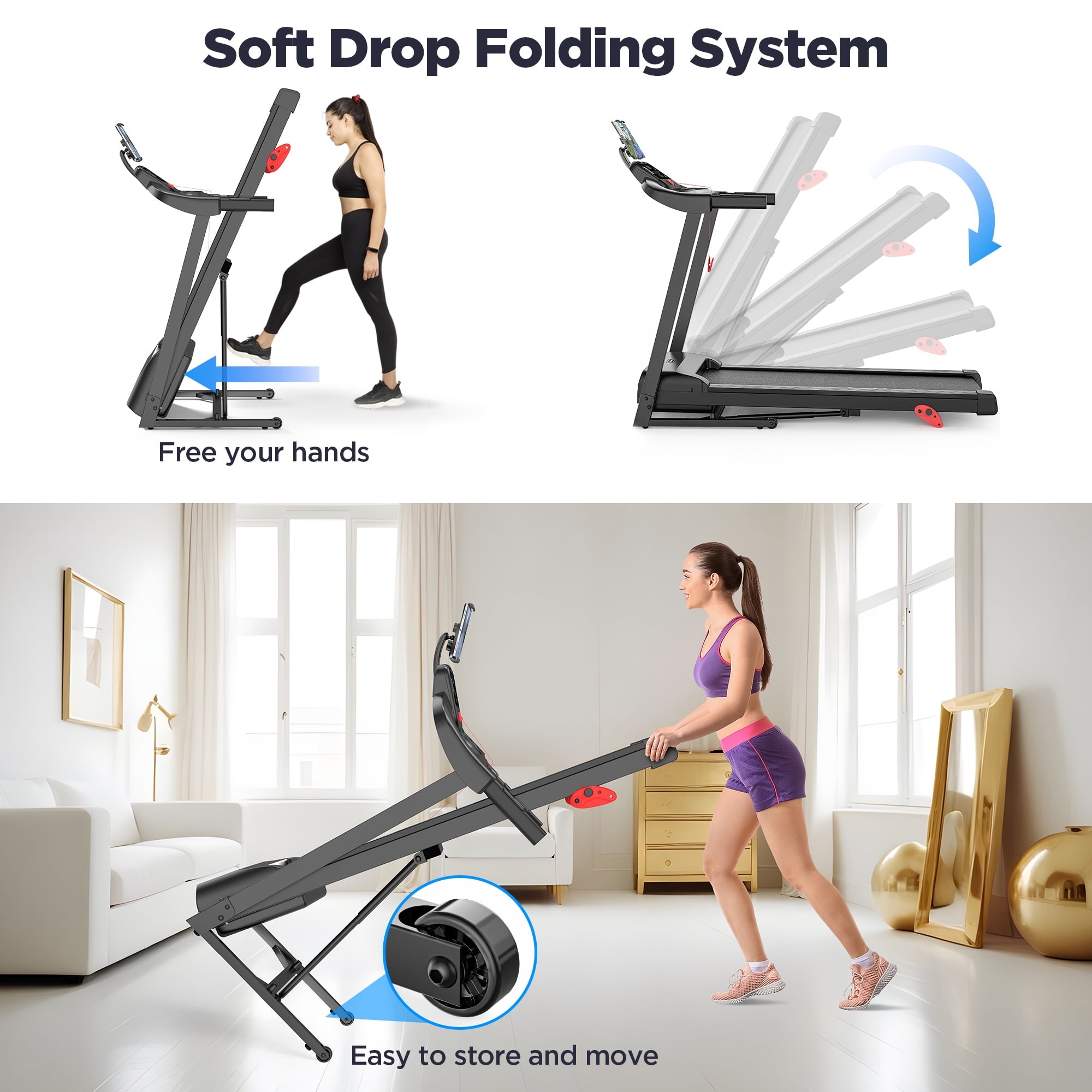 🔊Air Damping System & Soft Drop System: Ensures smooth operation and easy folding, minimizing noise and floor damage, a standout feature for treadmills for home.