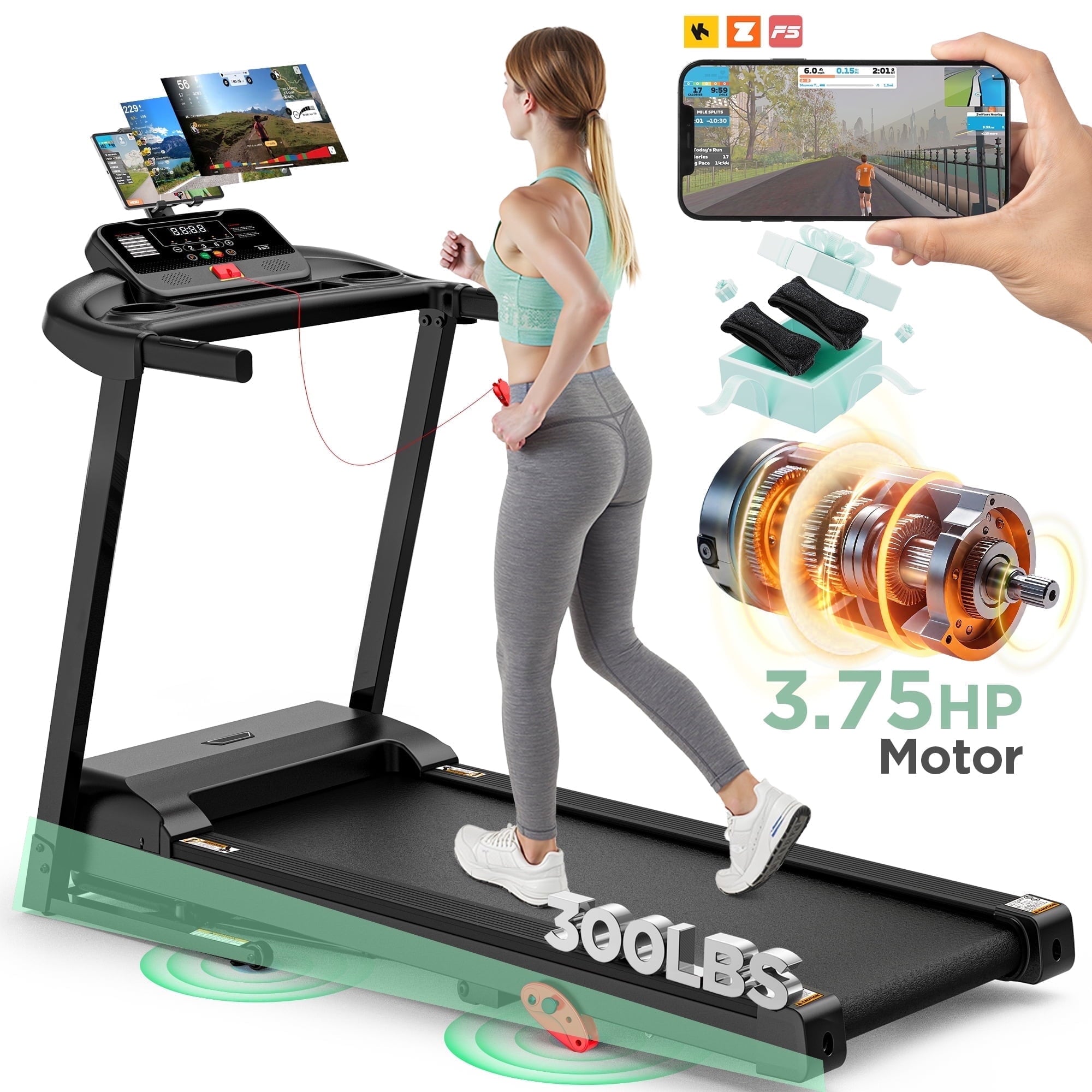 Home Exercise Treadmills 300LBS Capacity Folding Treadmill w/ Incline for Home, 3.75HP Portable Treadmill, 64+3+3+1 Program, Wide Shock Absorption Belt, Walking Running Exercise Machine