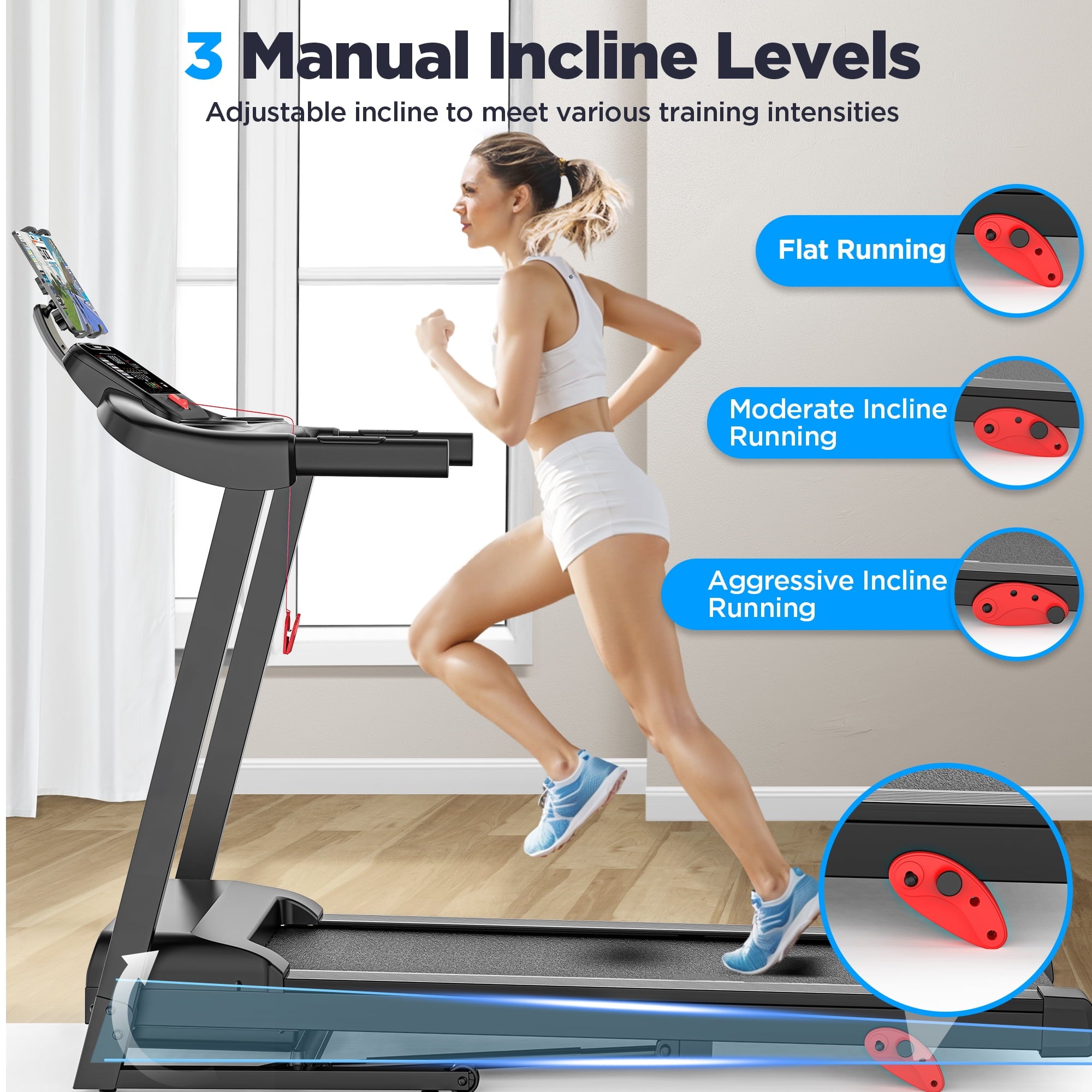• This treadmill with 3 levels of manual incline and a maximum speed of 7.5MPH can flexibly adapt to various exercise intensities and link to multiple APPs for more interesting exercises. It is the first choice for home treadmills. Its noise-canceling motor and cushioned running belt ensure a comfortable and quiet workout, while the foldable treadmill design makes it easy to store and move. Whether you’re walking, jogging, or running, this exercise equipment is your ultimate fitness companion.