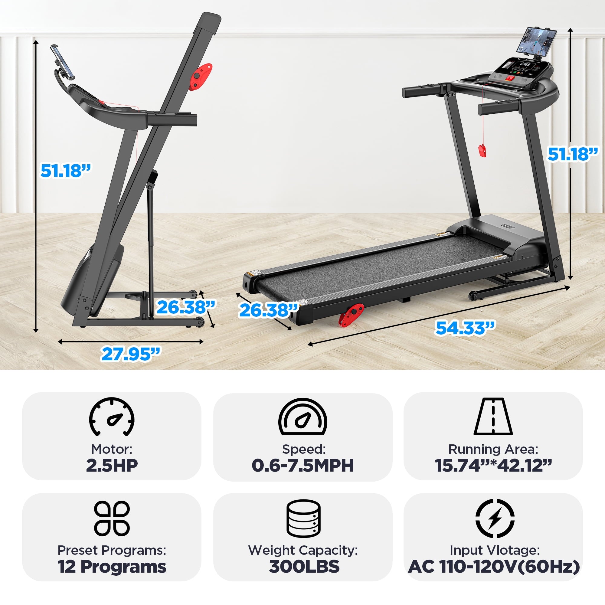 • Folding Size: 27.95*26.38*51.18 Inches (perfect for folding treadmill storage)