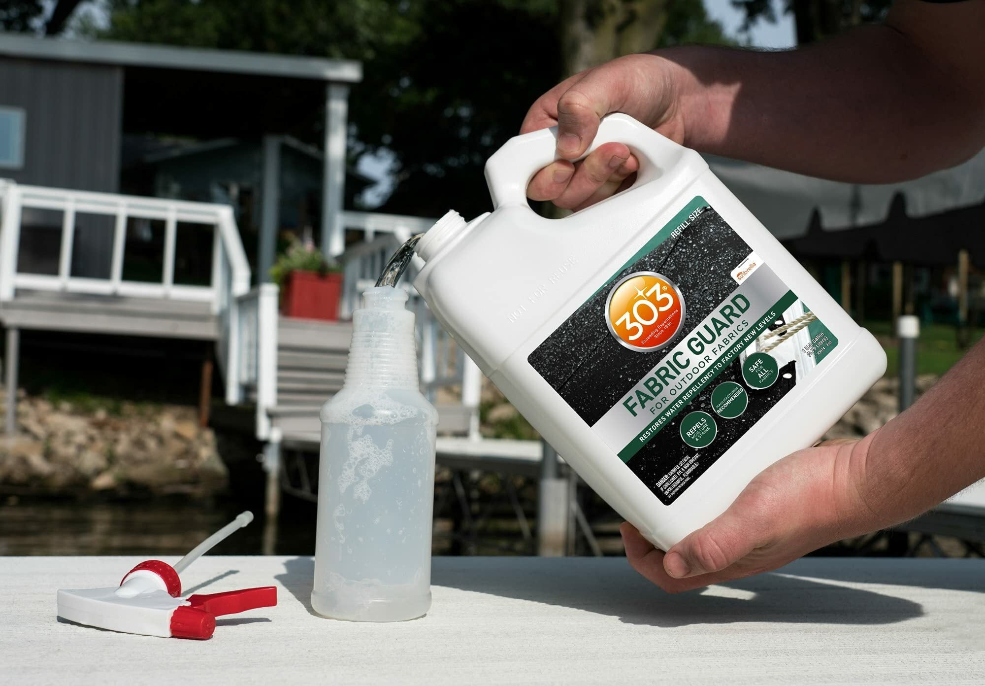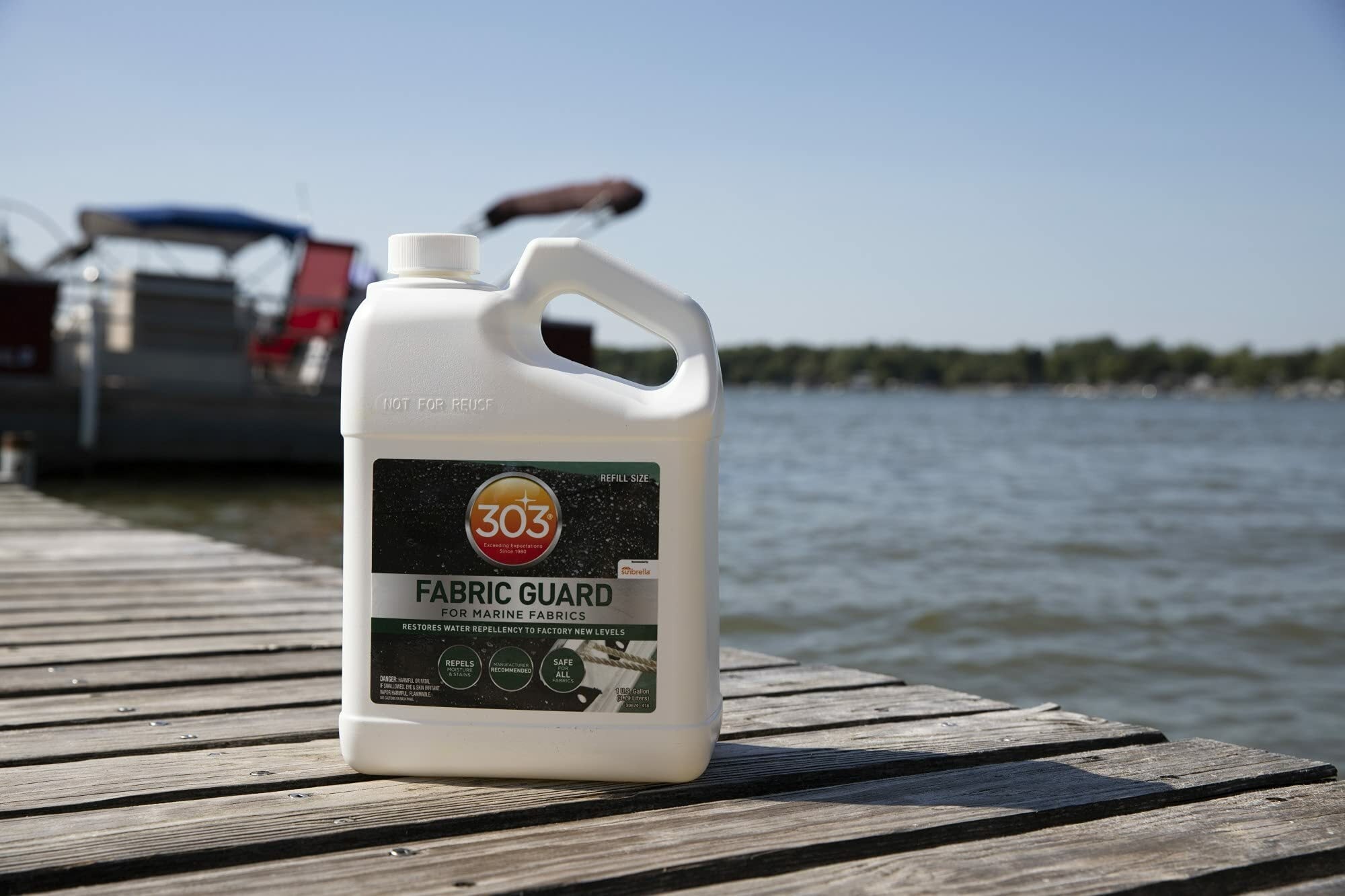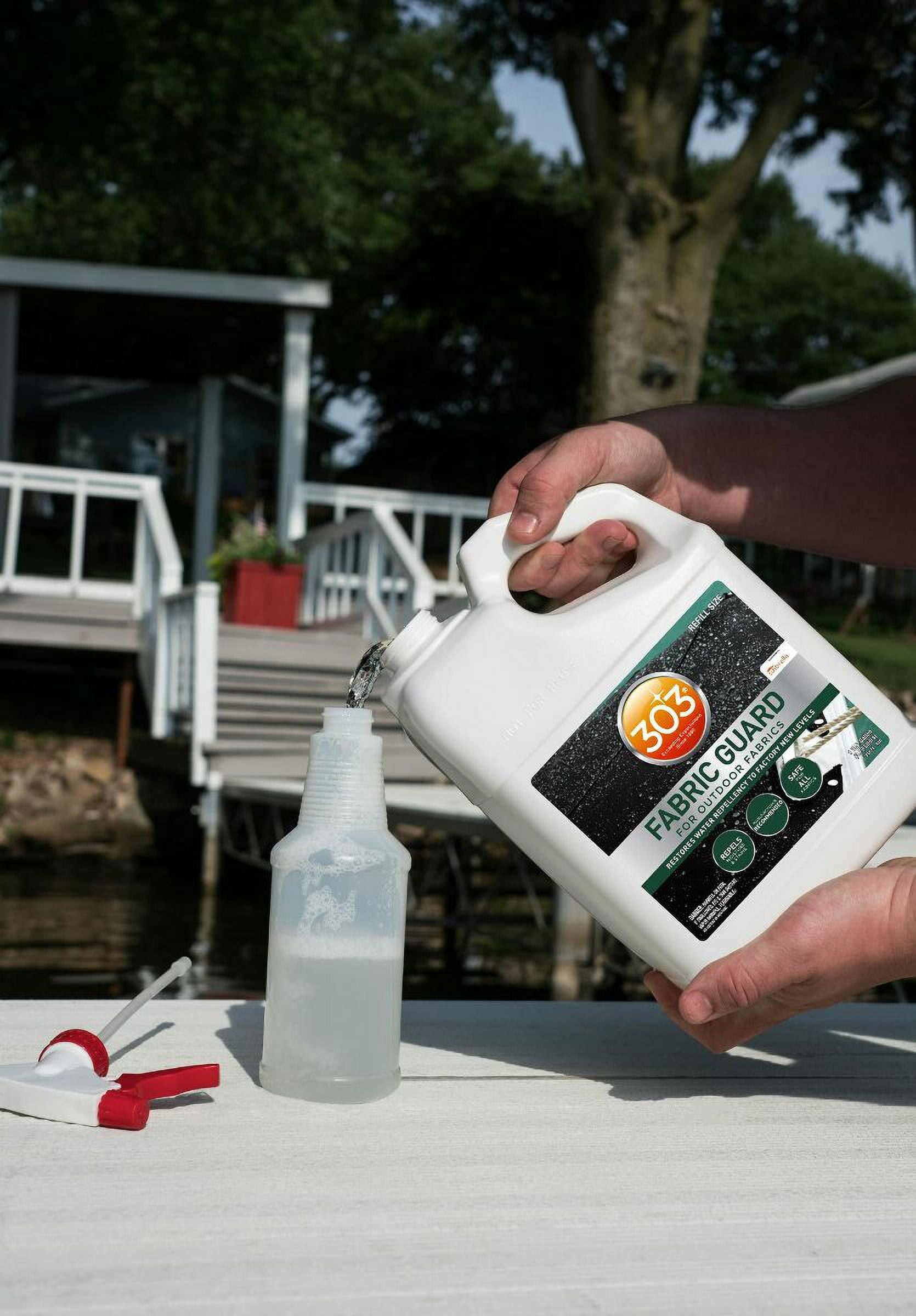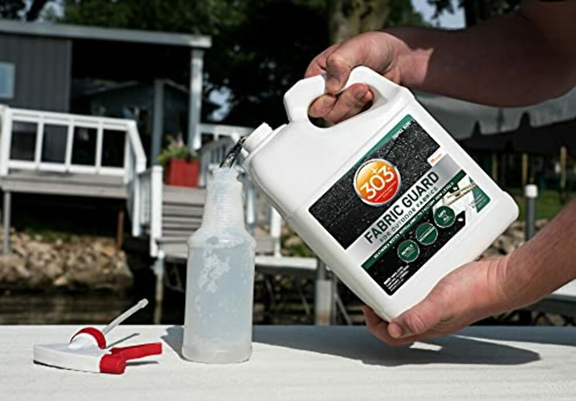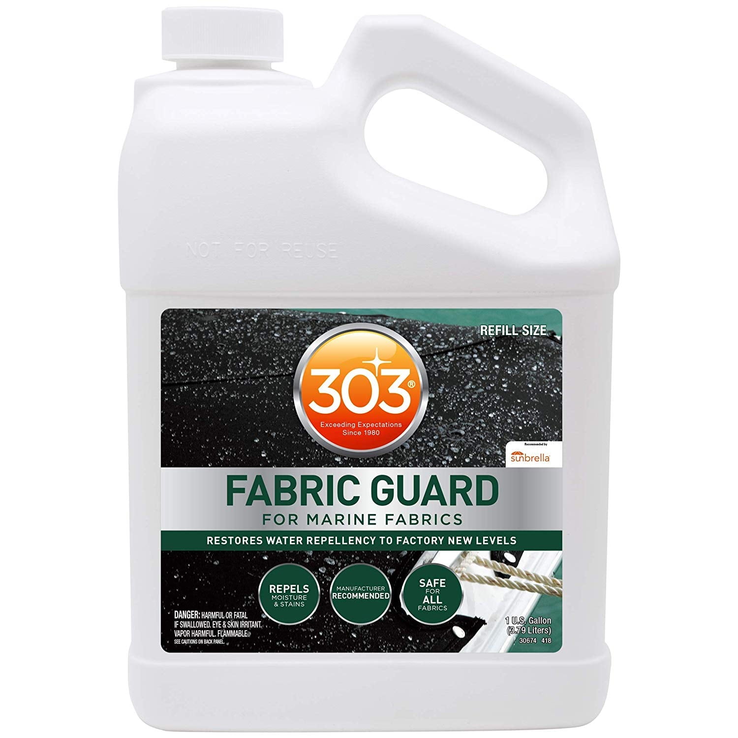 303 Marine Fabric Guard is the only product recommended by and for Sunbrella, as well as other fabric manufacturers, to restore lost water and stain properties to fabrics. Resist water, even when you’re on the water. 303 Marine Fabric Guard creates a powerful shield to greatly increase water properties and protect against oil and water-based stains. Spray it on fabric boat covers, awnings, Dacron sails and more! When applied to clean and dry fabrics, 303 Marine Fabric Guard restores lost water and stain properties to straight-from-the-factory levels. Keep all your favorite fabrics crisp and clean for years to come.