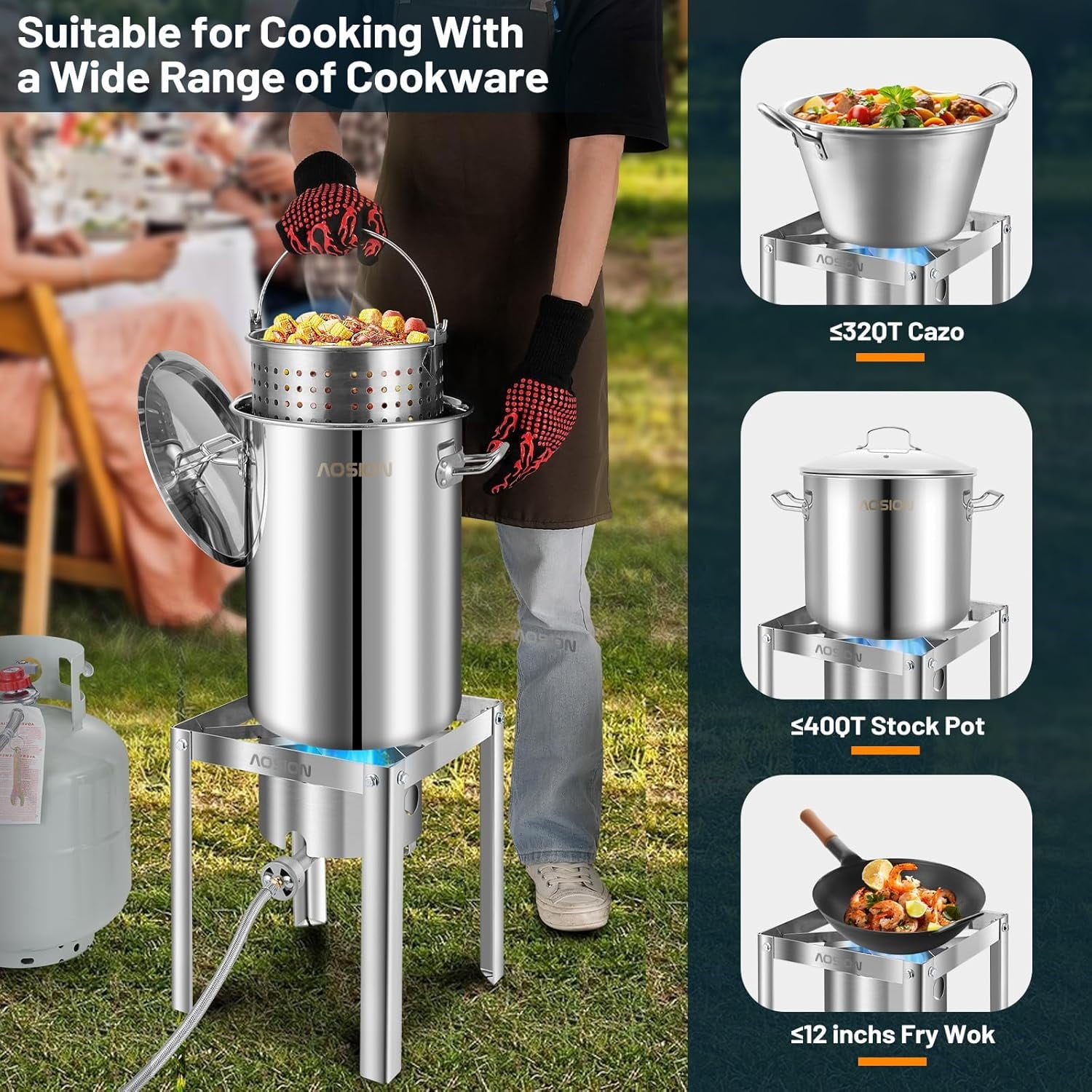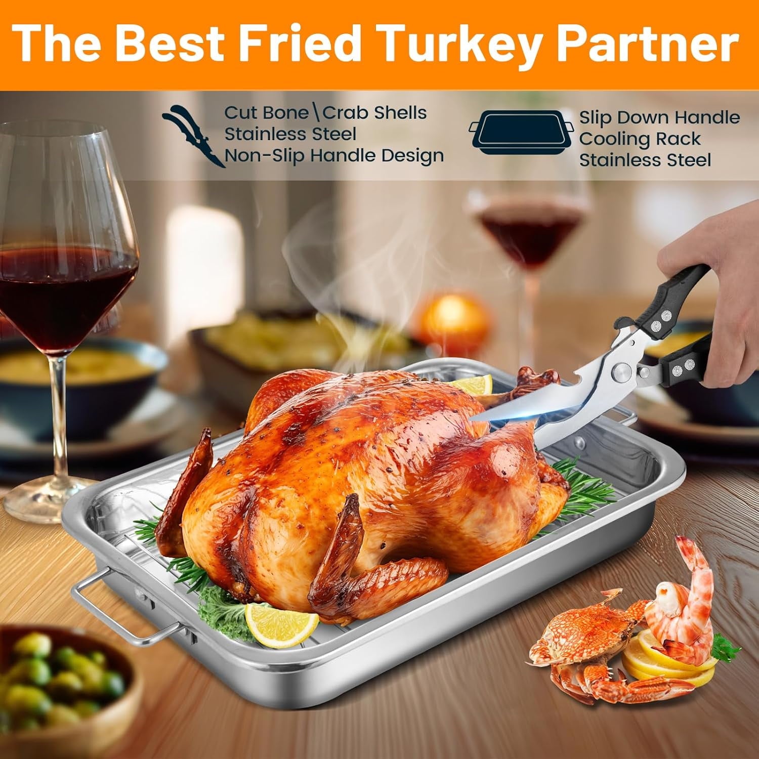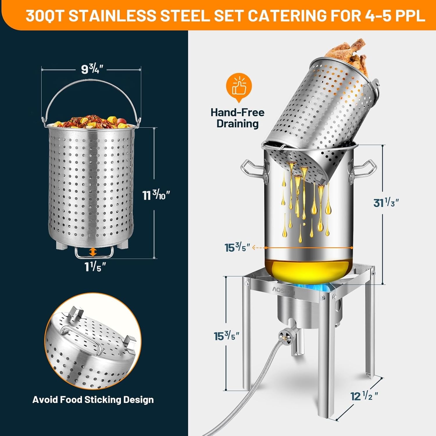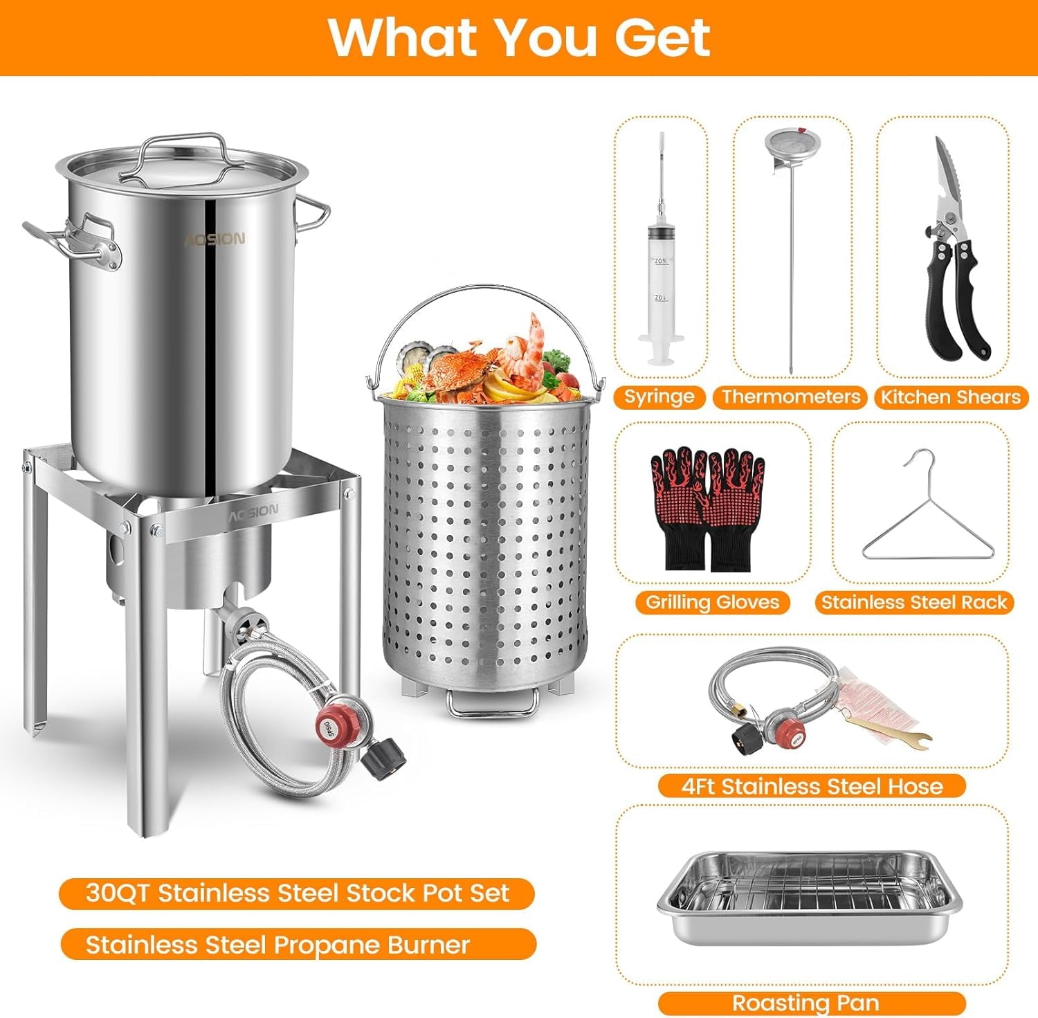 - 【Turkey Fryer Set】Including 55,000BTU Propane Burner,30QT Stainless Steel Pot with lid,Baskets,Roasting Pan, Kitchen Shears,Thermometer, Marinade Injector,Turkey Lifter,Grilling Gloves.