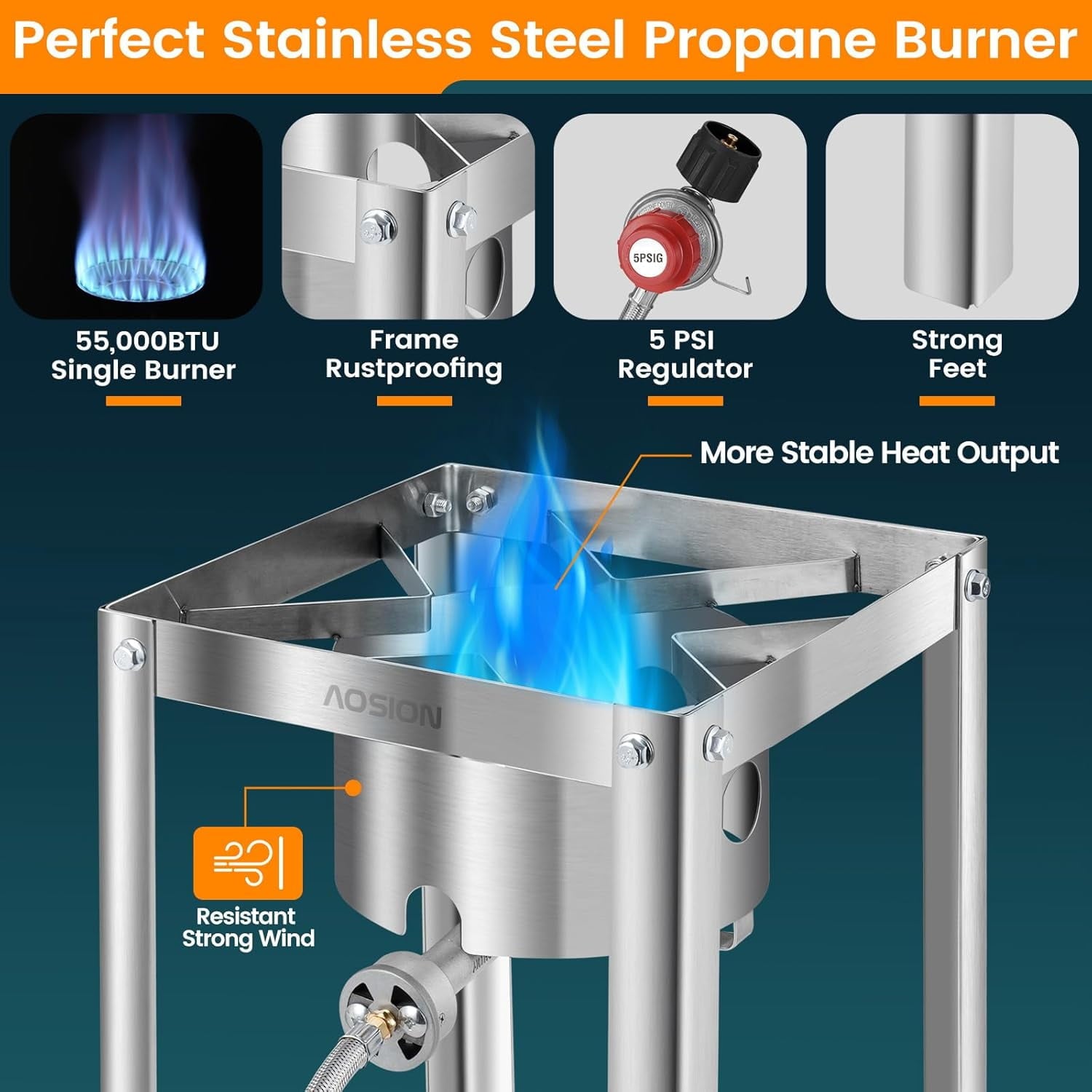 - 【High Output】55,000 BTU burner guarantees the great power for frying a heavy turkey or a full-filled with seafood. Comes with a 5PSI “CSA” Certificate Regulator with 4ft stainless steel hose that controls the amount of oxygen or gas consumed to give the burner safer and stability.