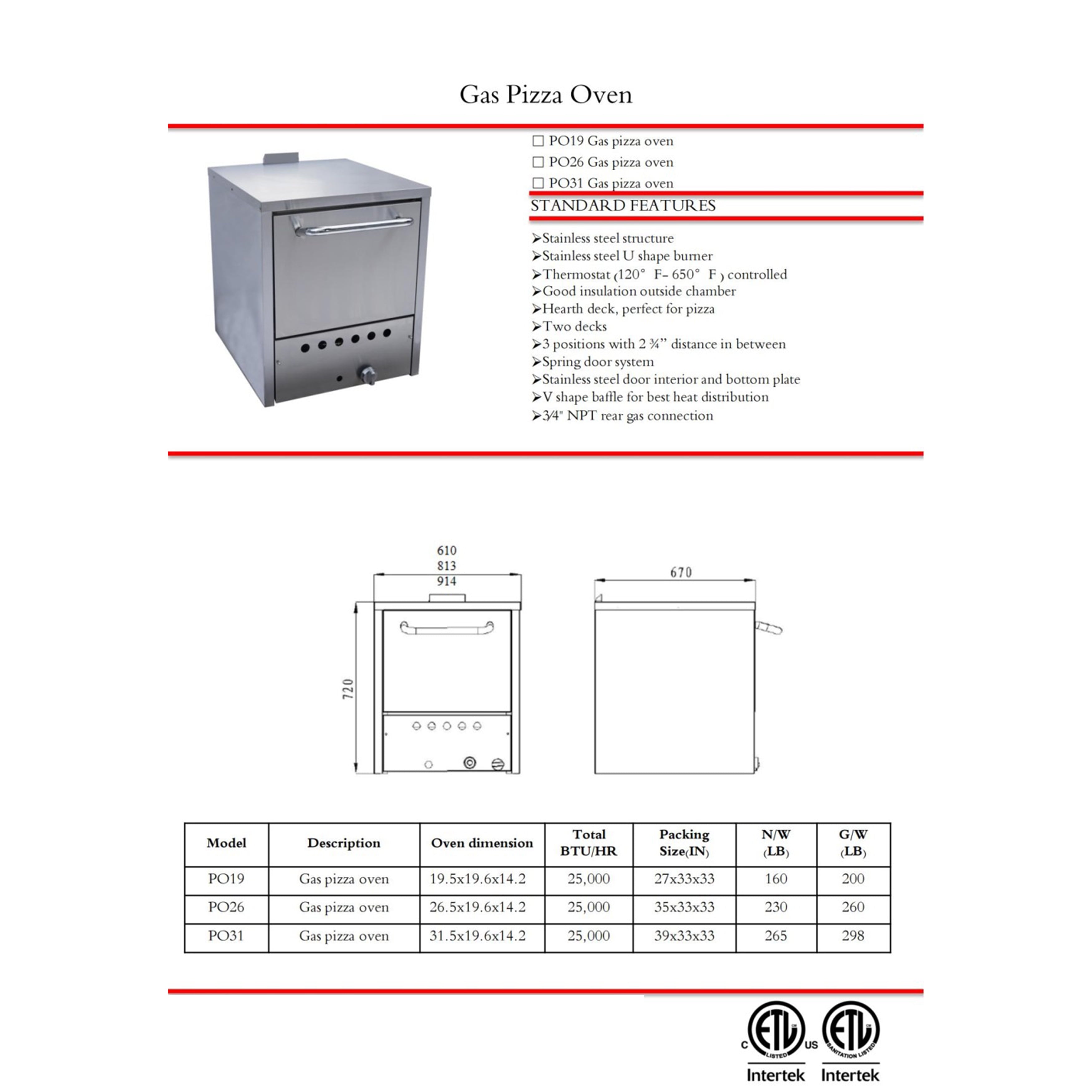 Number of Decks: 2Gas Type: Natural GasPower: 32,000 BTU/HrTemperature Control Range: 120°F-650°F