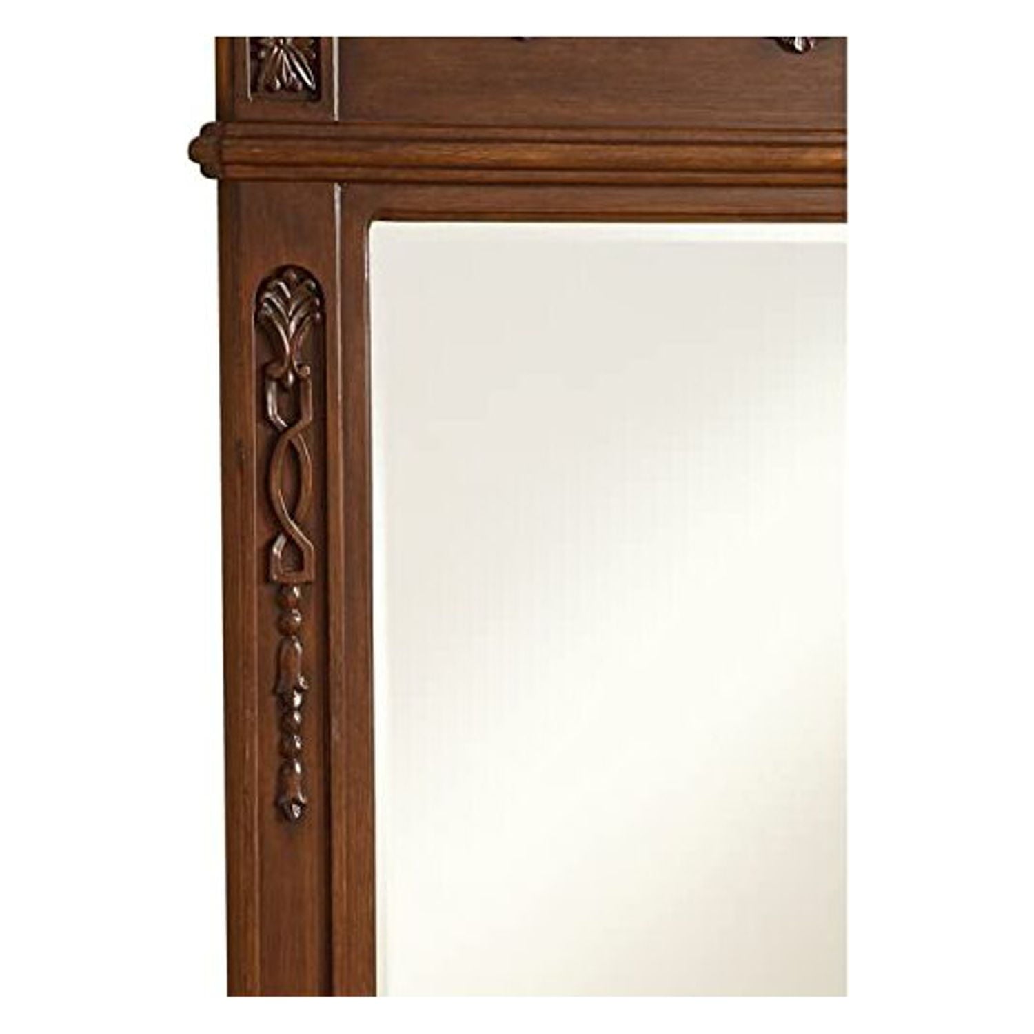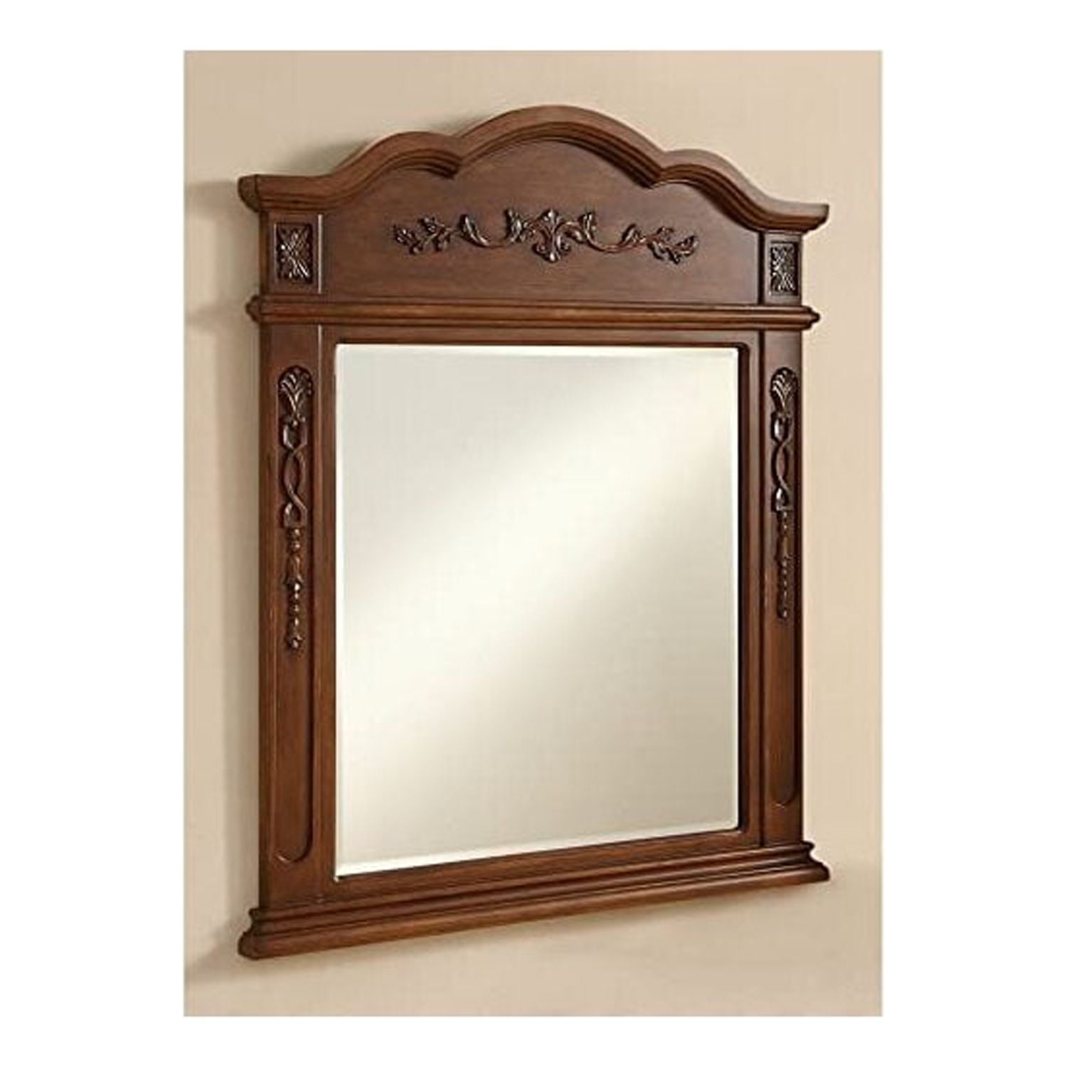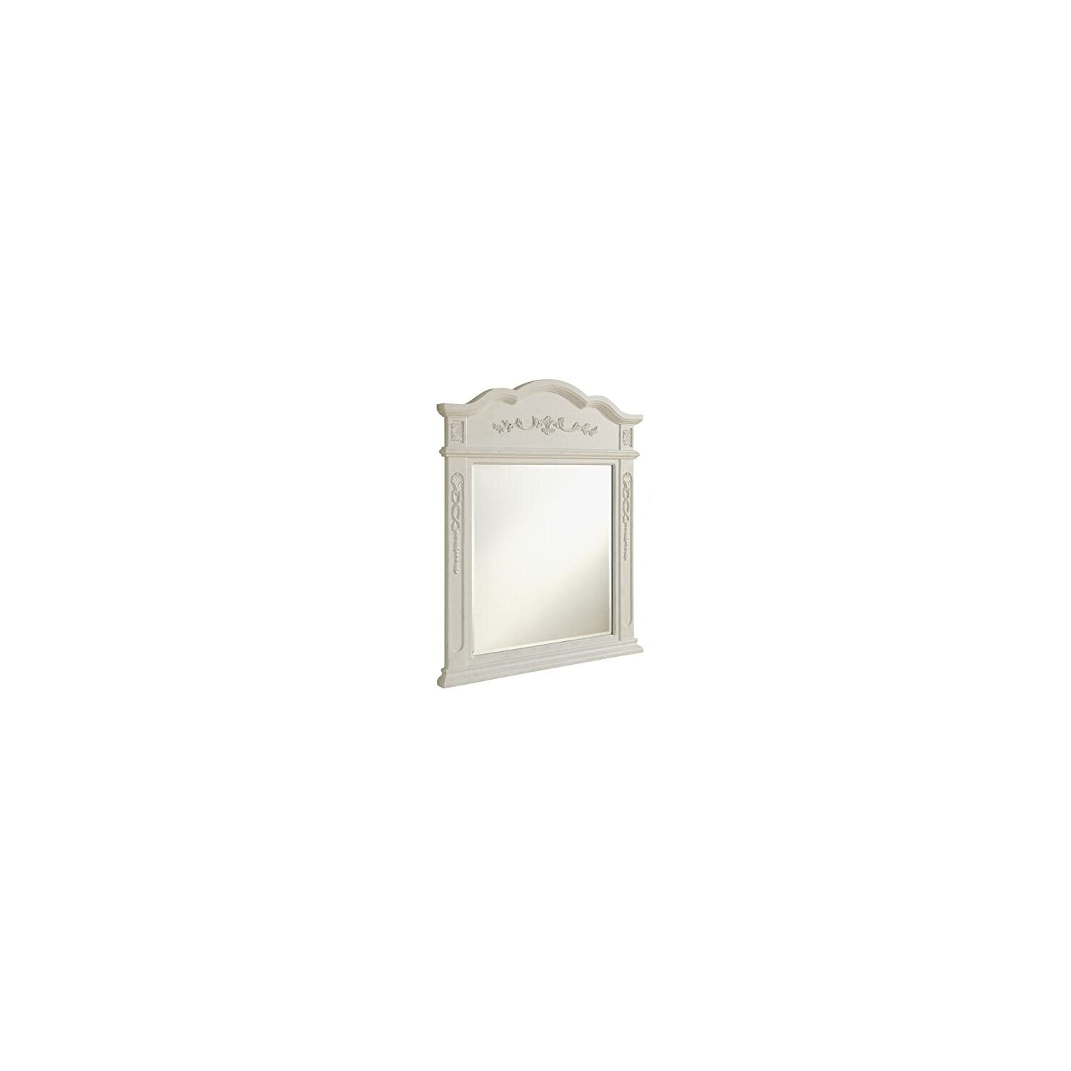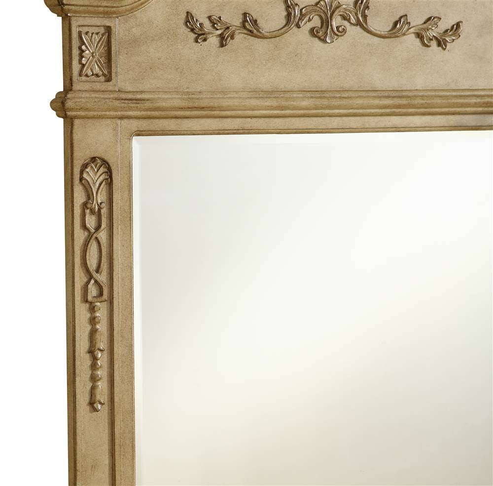 Elegant and refined, this traditionally designed, floral carved mirror frame is hand painted in an antique beige finish with a clear beveled mirror—a splendid match for the opulent “Danville” vanity. Measurements: W32”xH38”