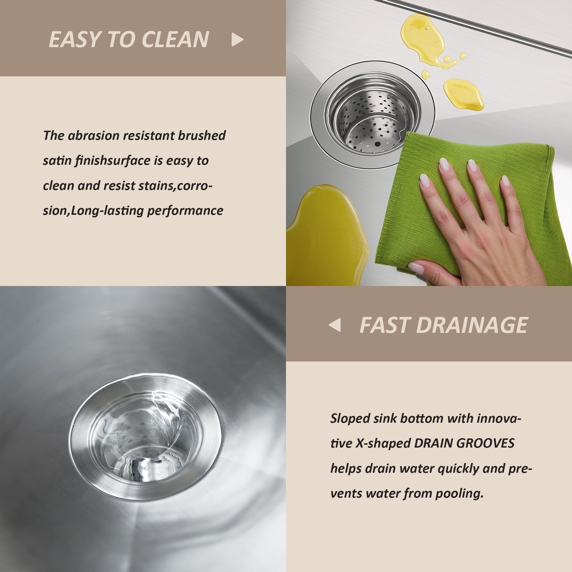 - Premium 16-Gauge Stainless SteelConstructed with:• Surgical-grade SUS304 stainless steel that resists dents and scratches• Thermo-shield undercoating prevents condensation under the sink• Brushed finish hides water spots and fingerprints