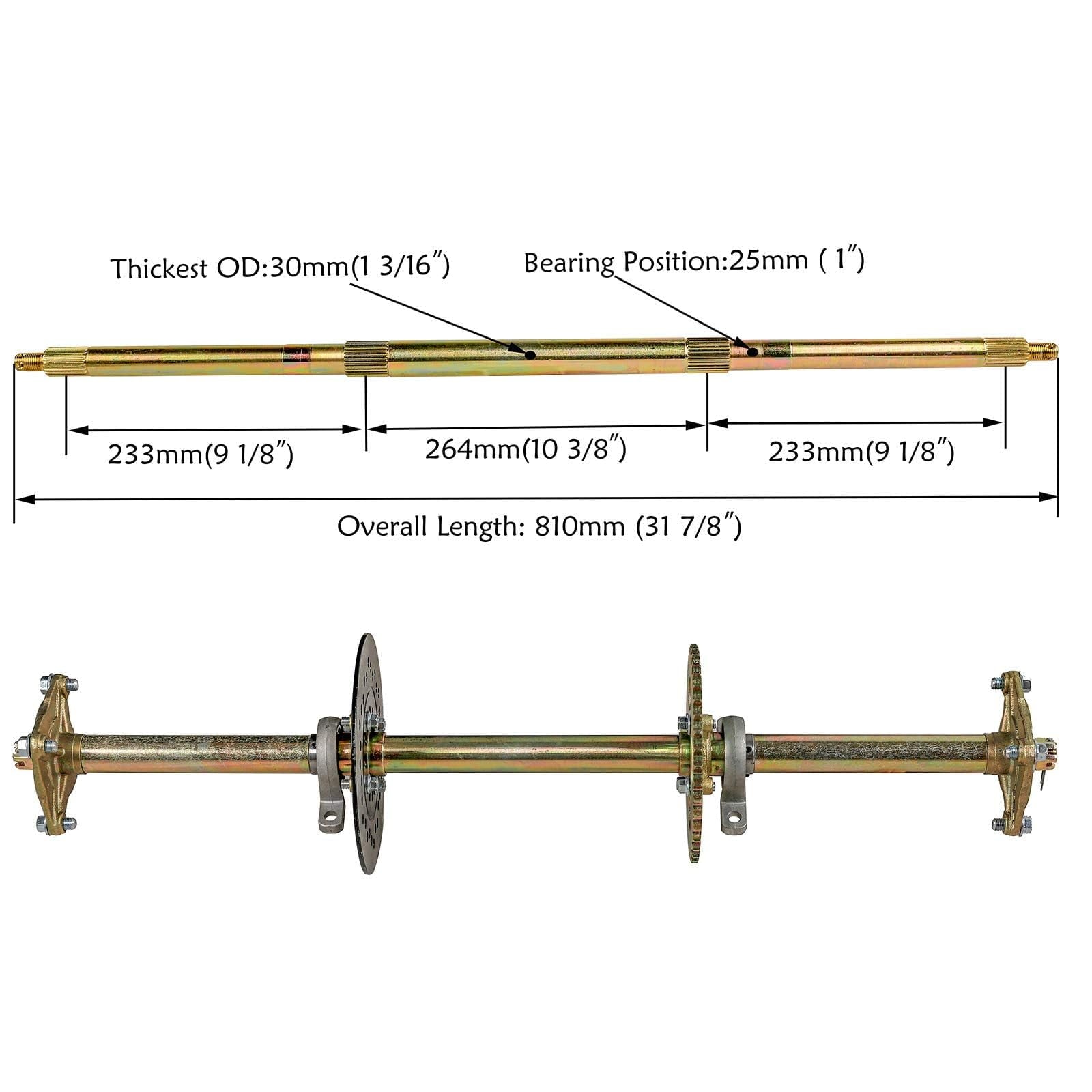 - Axle overall length 32 inch (810mm), 1″ in diameter and the thickest part of the axle is 1 3/16″ (30mm)