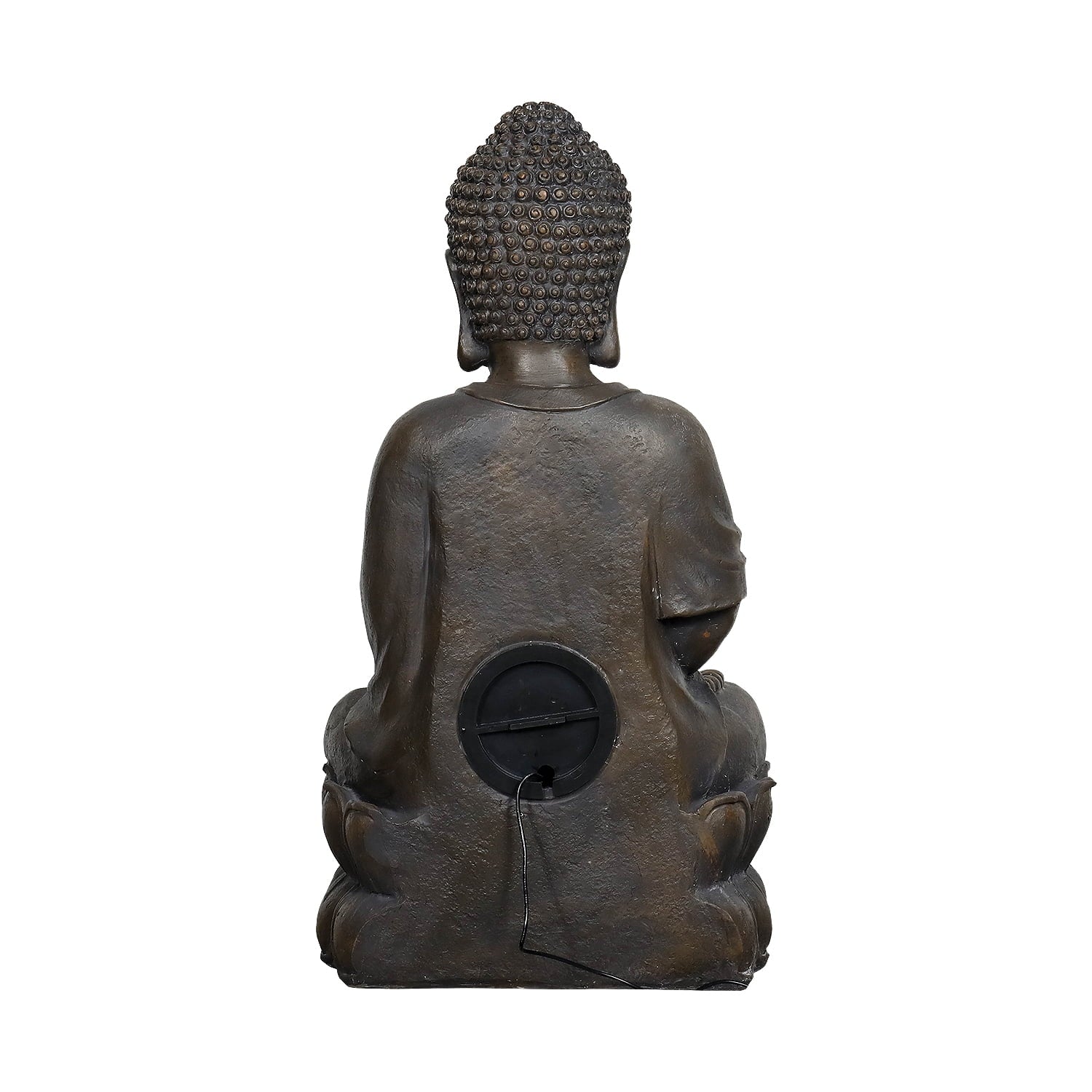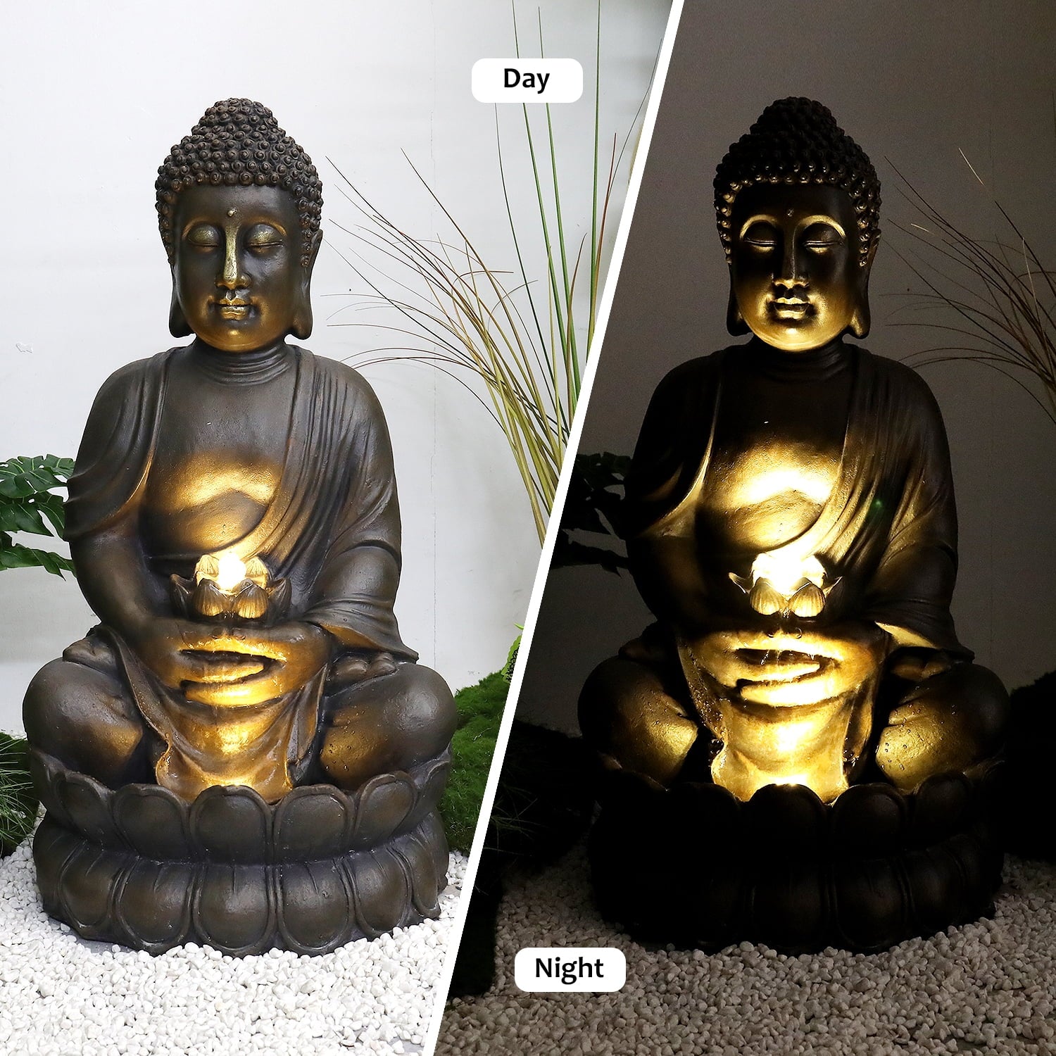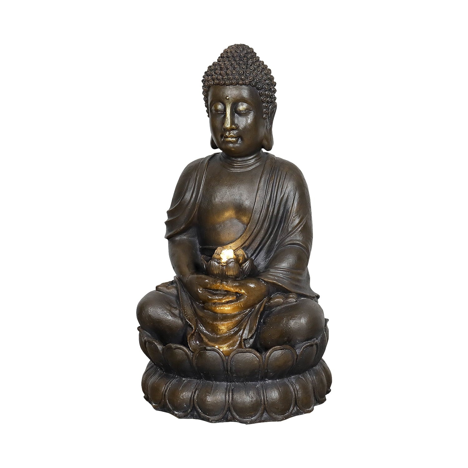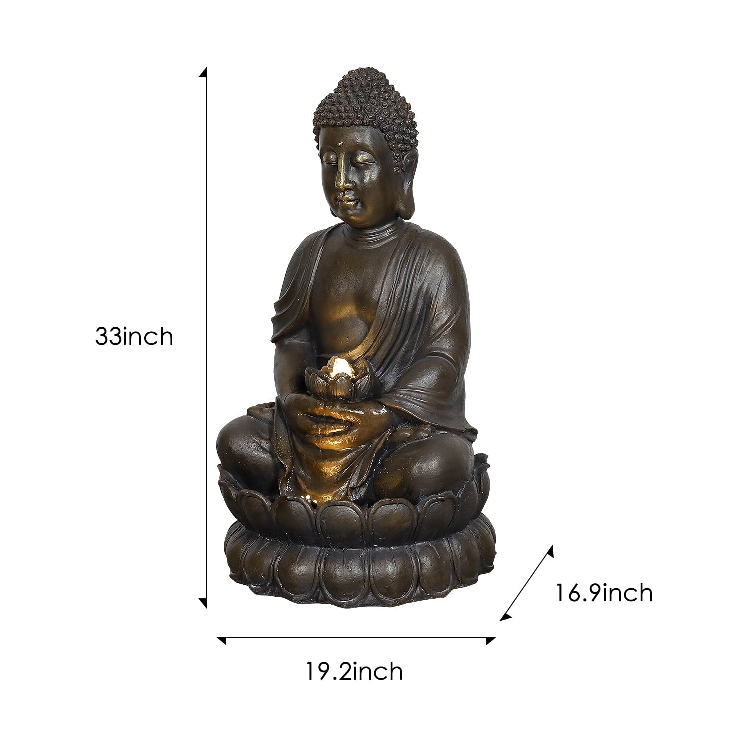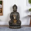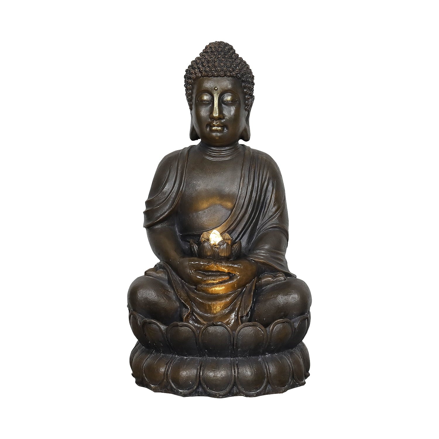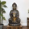 - This Buddha fountain features a serene Buddha seated on a lotus base, holding a lotus flower from which a gentle waterfall flows