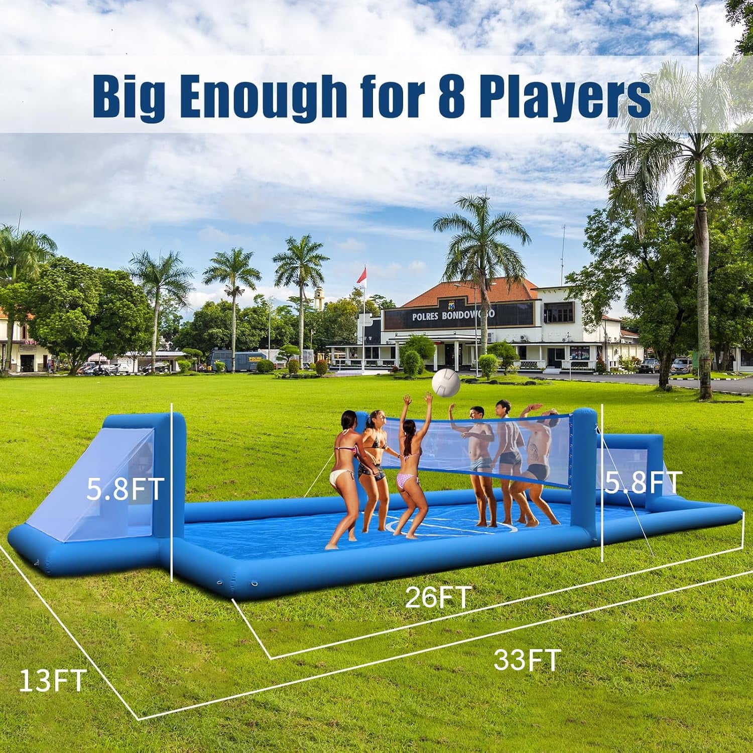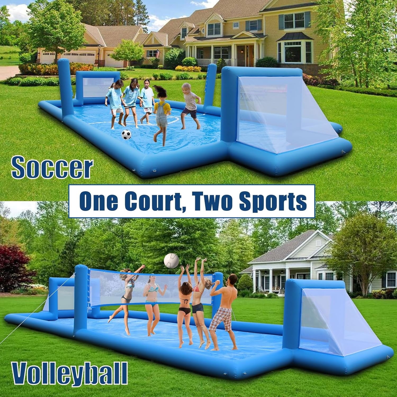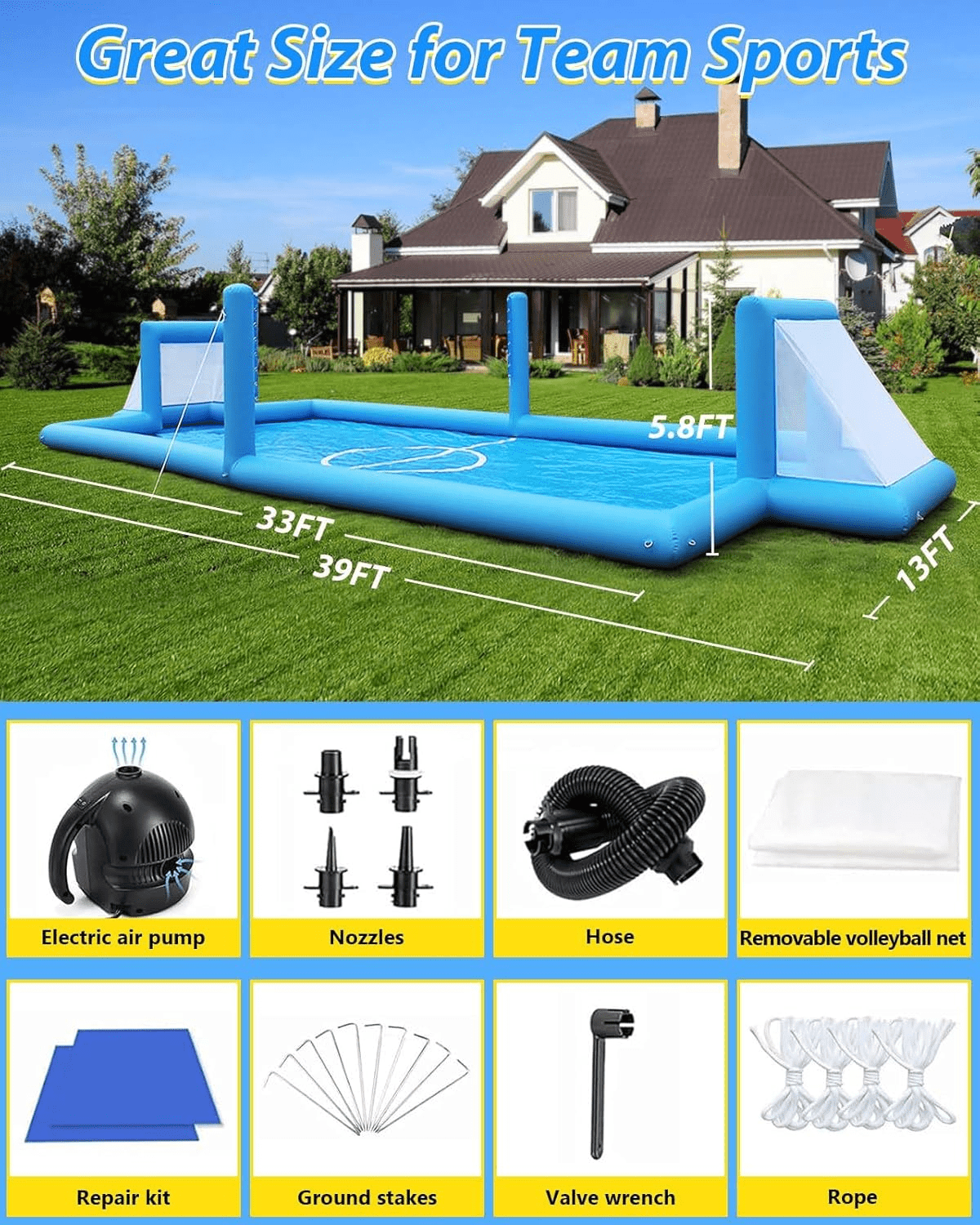 - LARGE INFLATABLE WATER VOLLEYBALL COURT – 33 x 13 x 5.8 Feet, pool depth about 1 Feet (11.81inch) , volleyball court package weight is 132 LBS, Within minutes you and your friends are off playing a nice game of volleyball or football. For volleyball or football, this playing field is perfect; PPXIA 2 in1 volleyball football court is Ideal for At-Home Entertainment & Recreation.