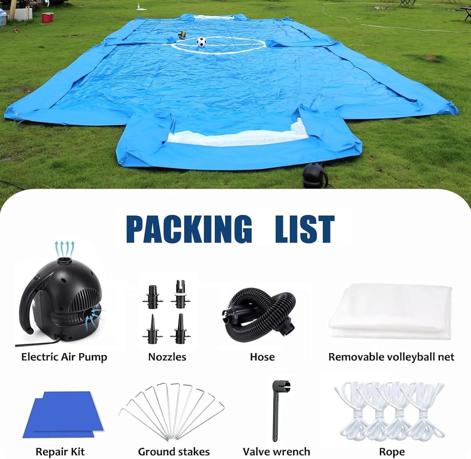 - PACKAGE INCLUDES – This set includes a large inflatable volleyball football court + volleyball net + 1pc air pump(800W) + Ground stakes + PVC repair cloth(Volleyballs NOT include). So it is convenient for multiple people to play football together! or playing volleyball on the water, your children will also be able to quickly learn to swim. We have a variety of colors and styles, you can contact us if you need.
