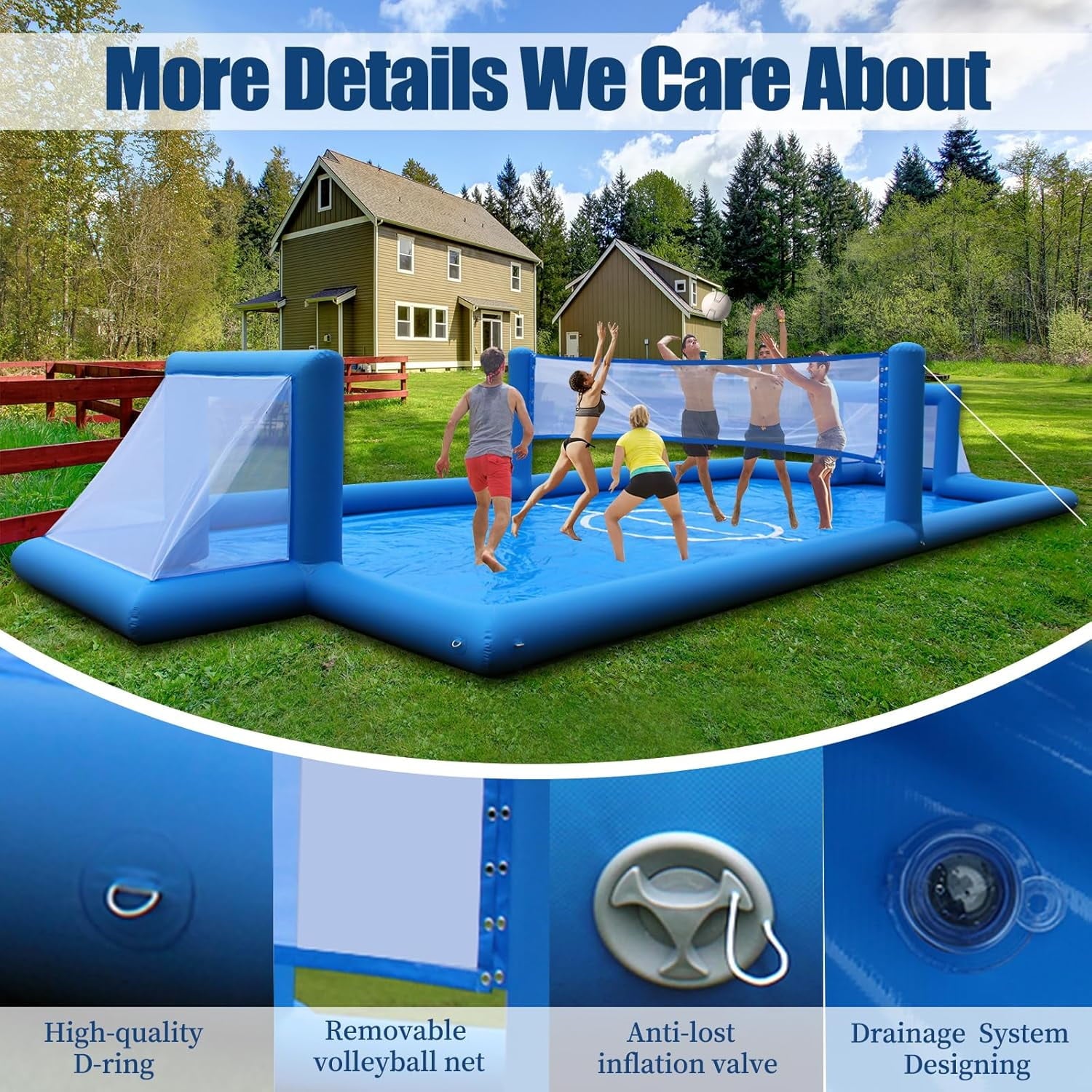 - HIGH QUALITY MATERIAL – The material of inflatable volleyball pool court is high-quality PVC tarpaulin, with better air-tightness and durability since reinforcement whose material is all seams. It’s extremely safe when you using it because this air volleyball court is leak-free and it is no smell because high-grade material.So you can safely play with your children!