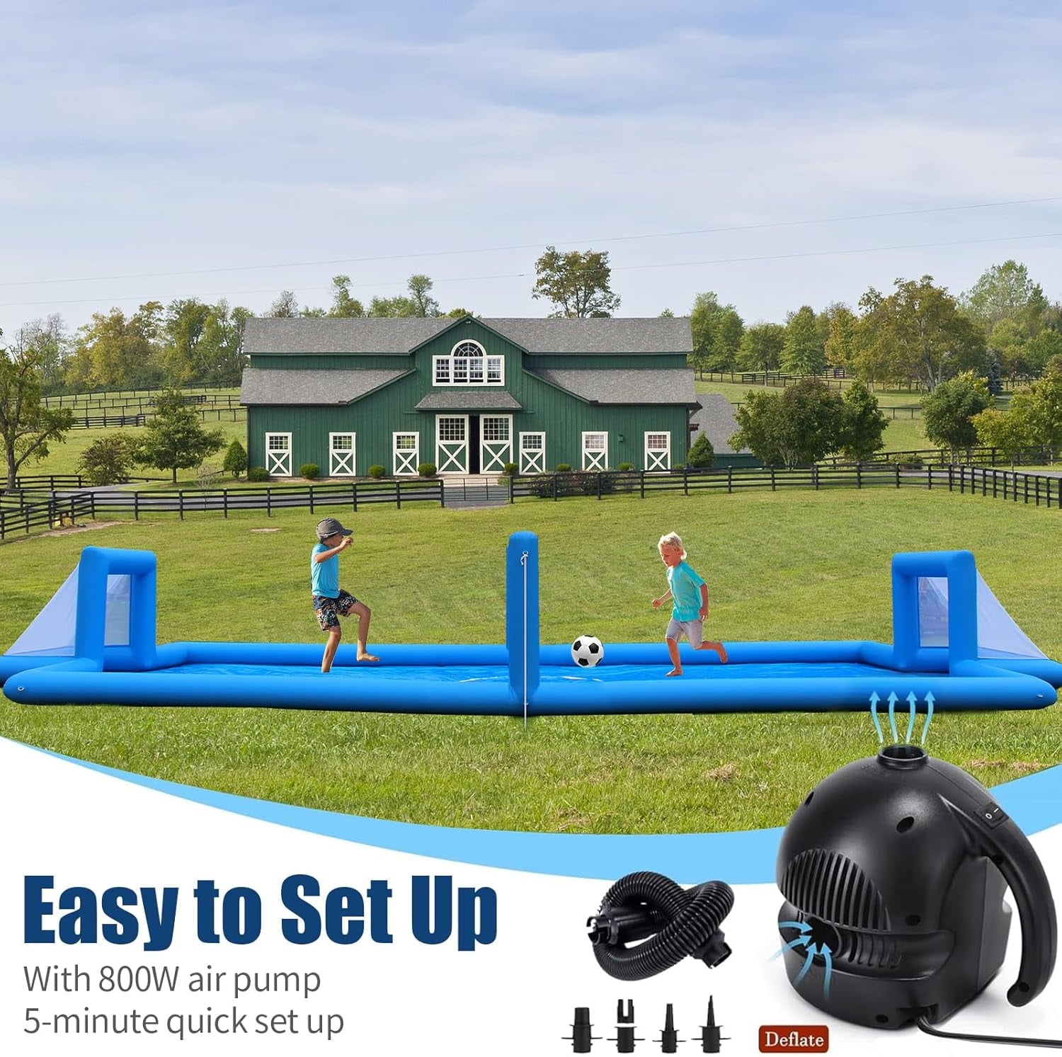 - QUICK, EFFORTLESS SET UP – Our inflatable volleyball pool comes with free 800 watt electrical pump. blows up in minutes with electric blower. No noise during game. After inflation, the volleyball court will maintain its pressure for days. Inflatable pool volleyball set is easy to be carried to everywhere after deflating.