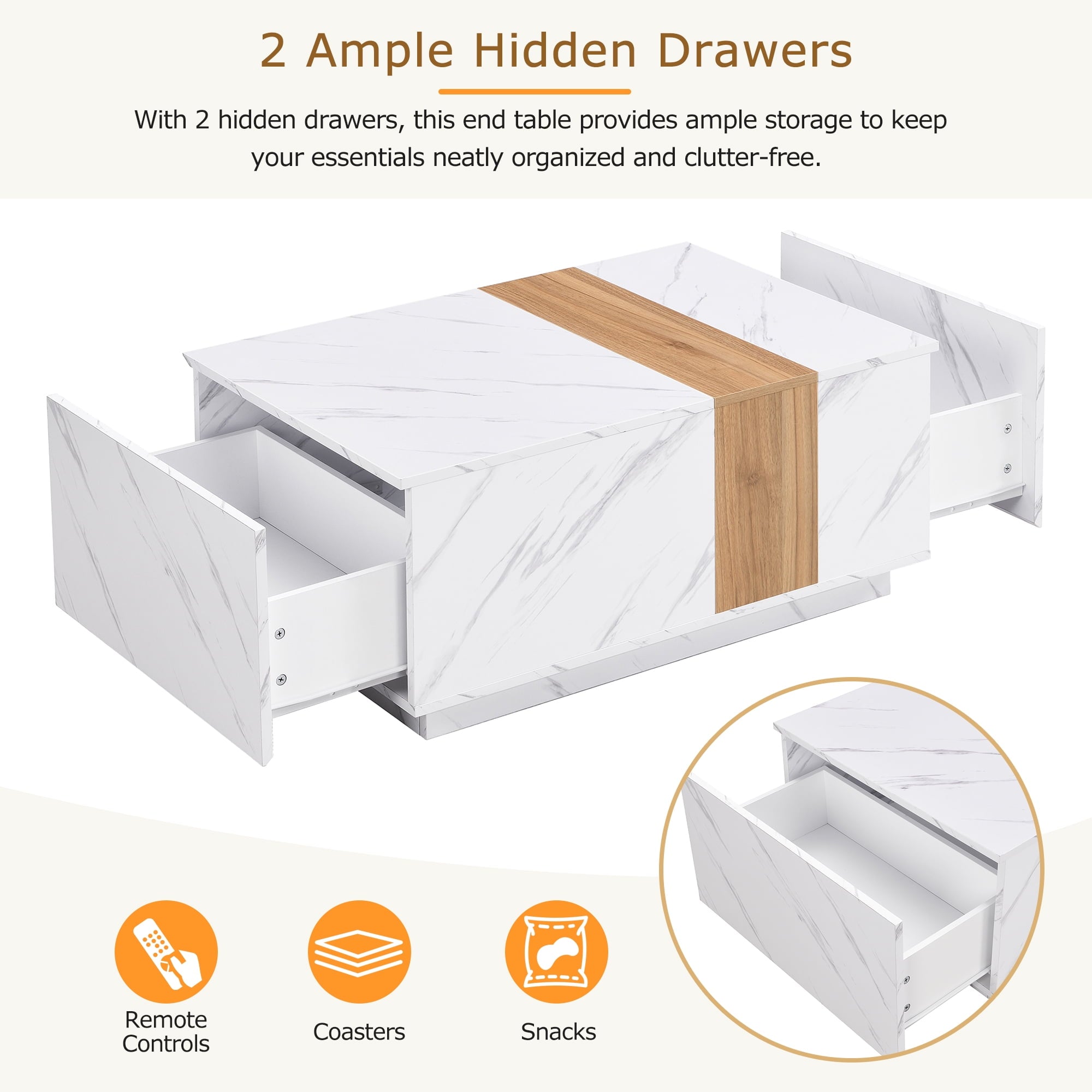 - 【2 Ample Hidden Drawers】With 2 hidden drawers, this end table provides ample storage to keep your essentials neatly organized and clutter-free. Whether it’s remote controls, coasters, or snacks, the drawers can both accommodate, allowing quick and convenient access to items whenever required.