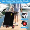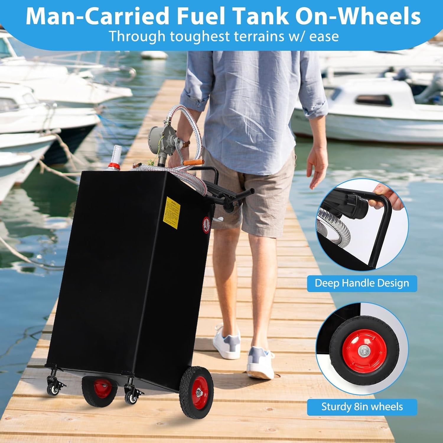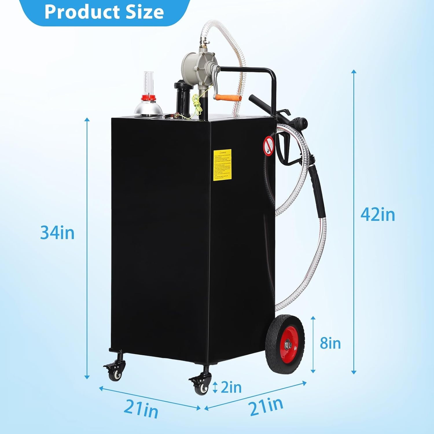 - Portable and All-Terrain Design–With 4 all-terrain wheels and an ergonomic handle, this diesel fuel can is easy to maneuver over rough and uneven surfaces, making it ideal for use on construction sites, farms, docks, and other outdoor locations.