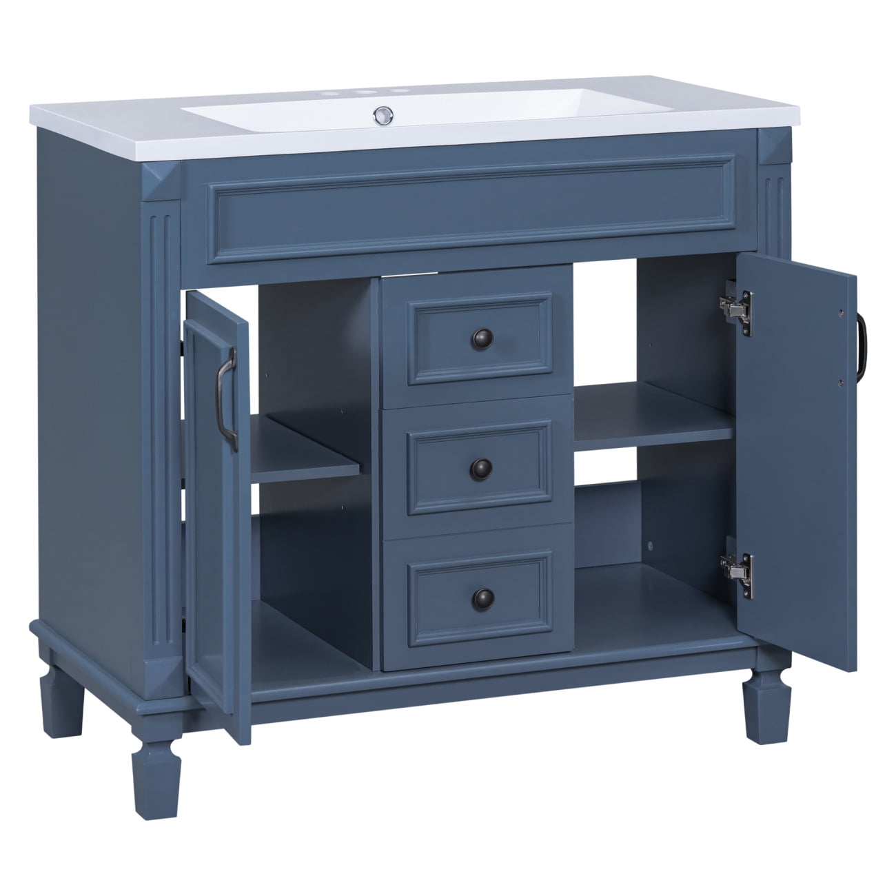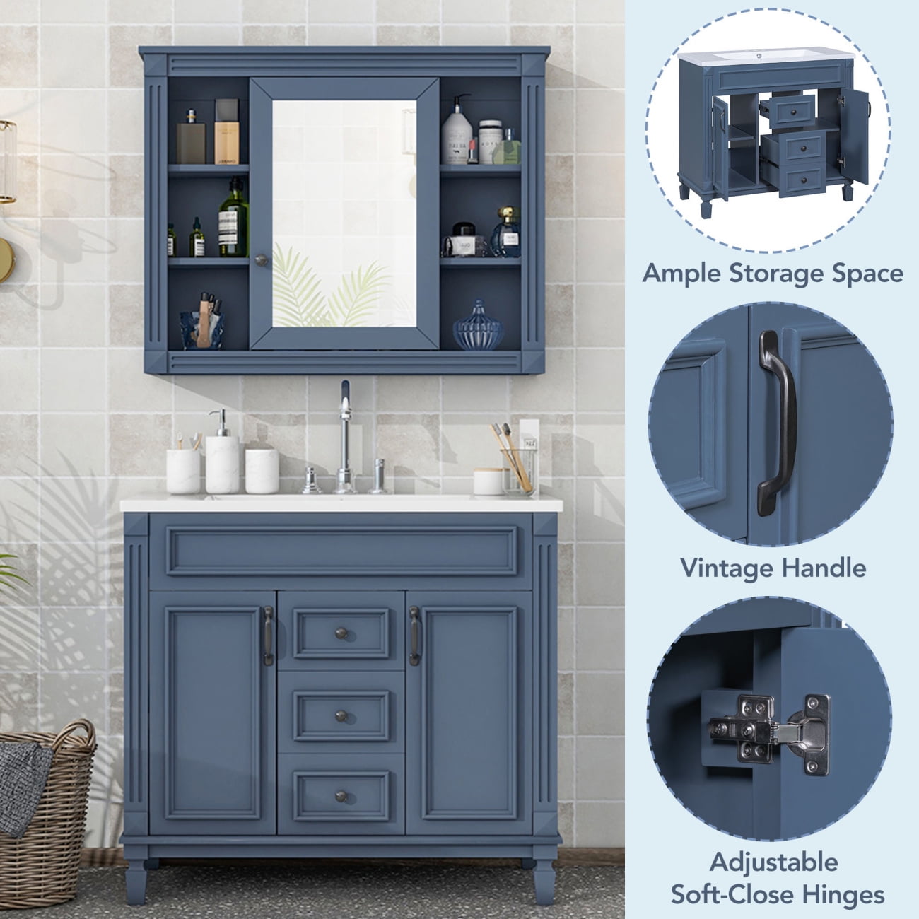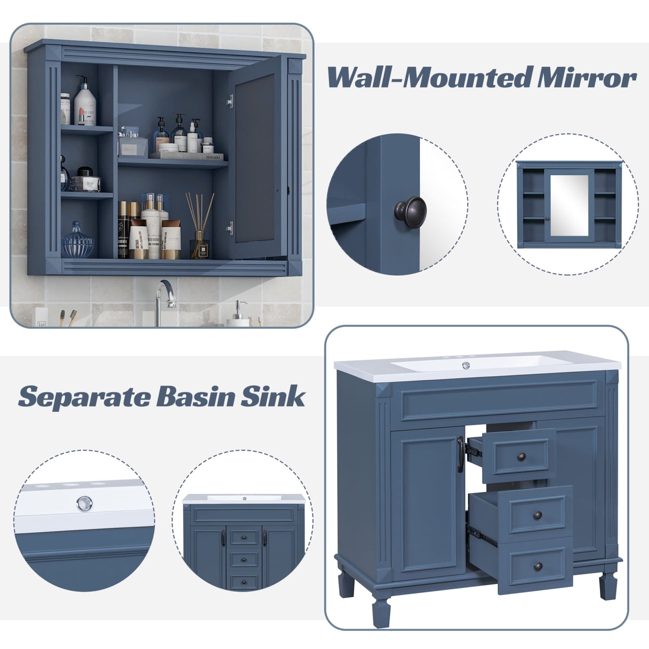 • [Multi-Purpose Cabinet & Concealed Storage] – Our bathroom vanity provide ample space for all your toiletries and bathroom essentials. The combination of the cabinet body and the drawer perfectly stores all kinds of bathroom products and keeps the necessities away from water stains and dust. Soft-close doors and drawer fronts feature a water-resistant paint finish for durability.