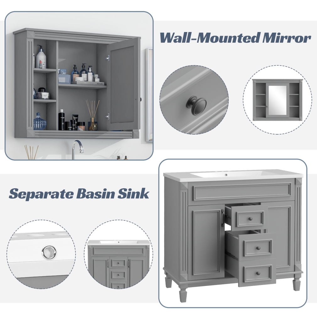 36” Bathroom Vanity Set, Undermount Bathroom Cabinet and Mirror Cabinet, Ceramic Sink Top, Storage Cabinet with 2 Soft Closing Doors and 2 Drawers, Vanity Cabinet Set, Suit for 4” Faucet, Gray