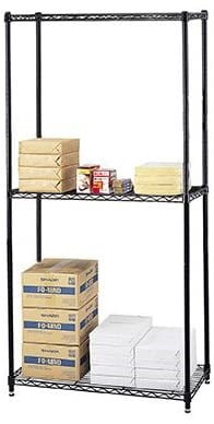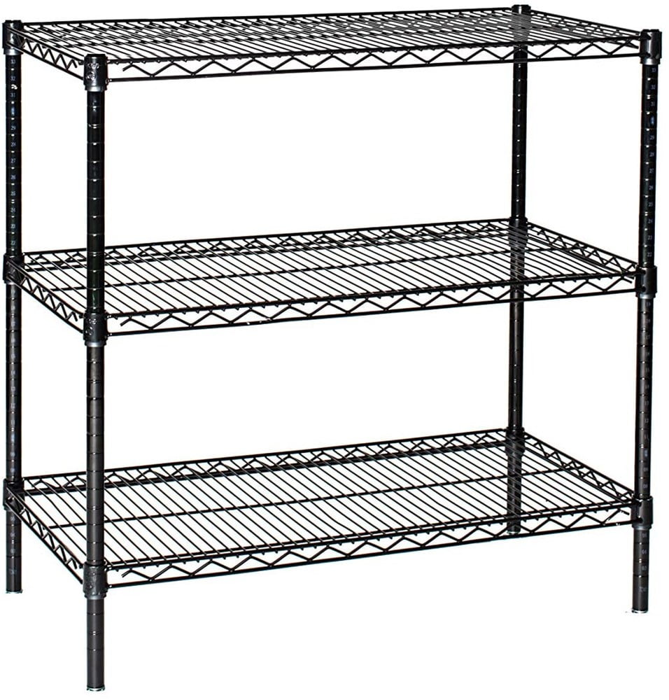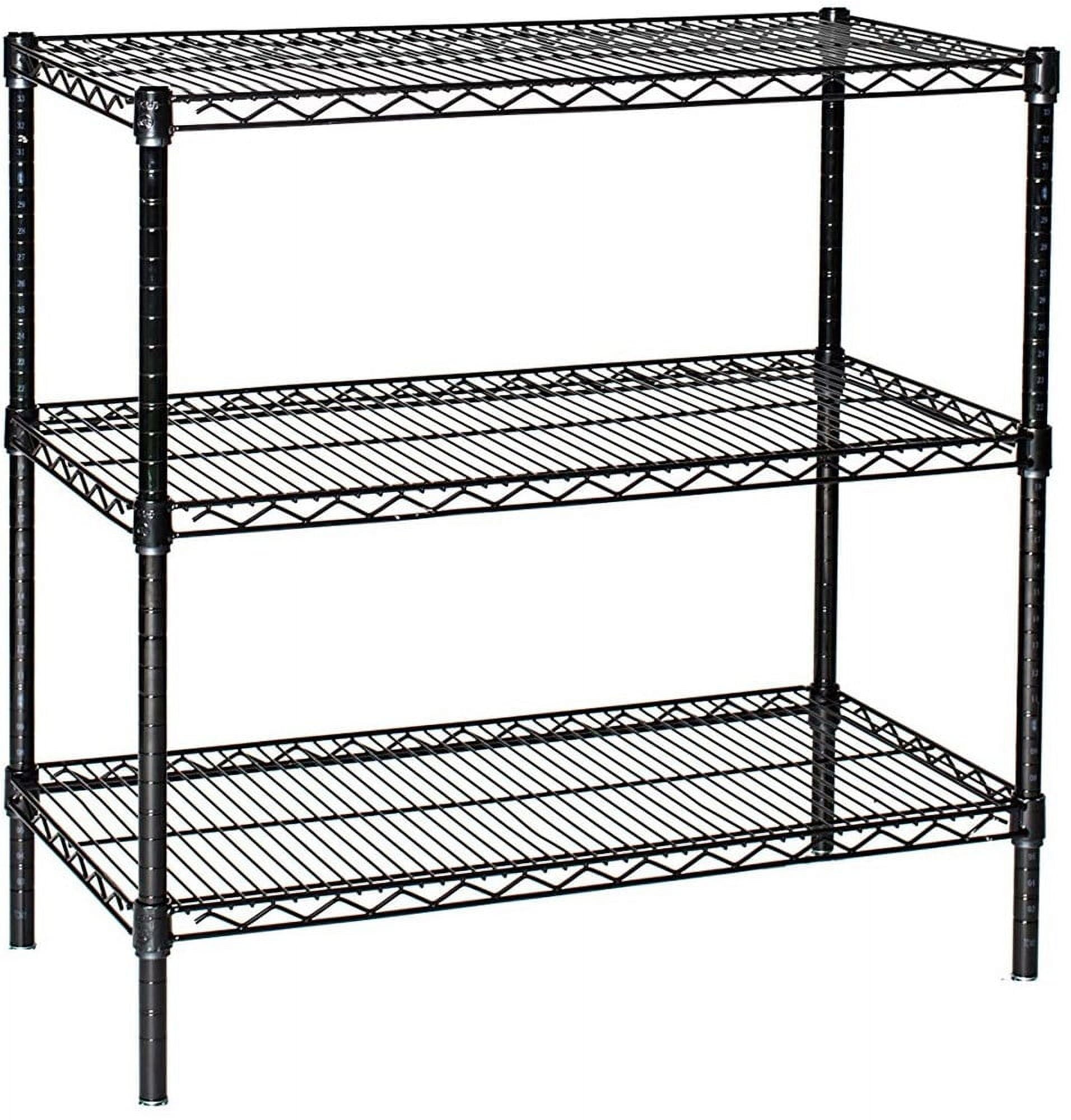 Adjustable wire shelving units offer a stylish dust free storage solution. Wire is coated with corrosion and wear resistant baked epoxy. Comes with 3 heavy-duty reinforced wire shelves. Shelves heights adjust every 1″. Up to 800 lbs per shelf.