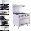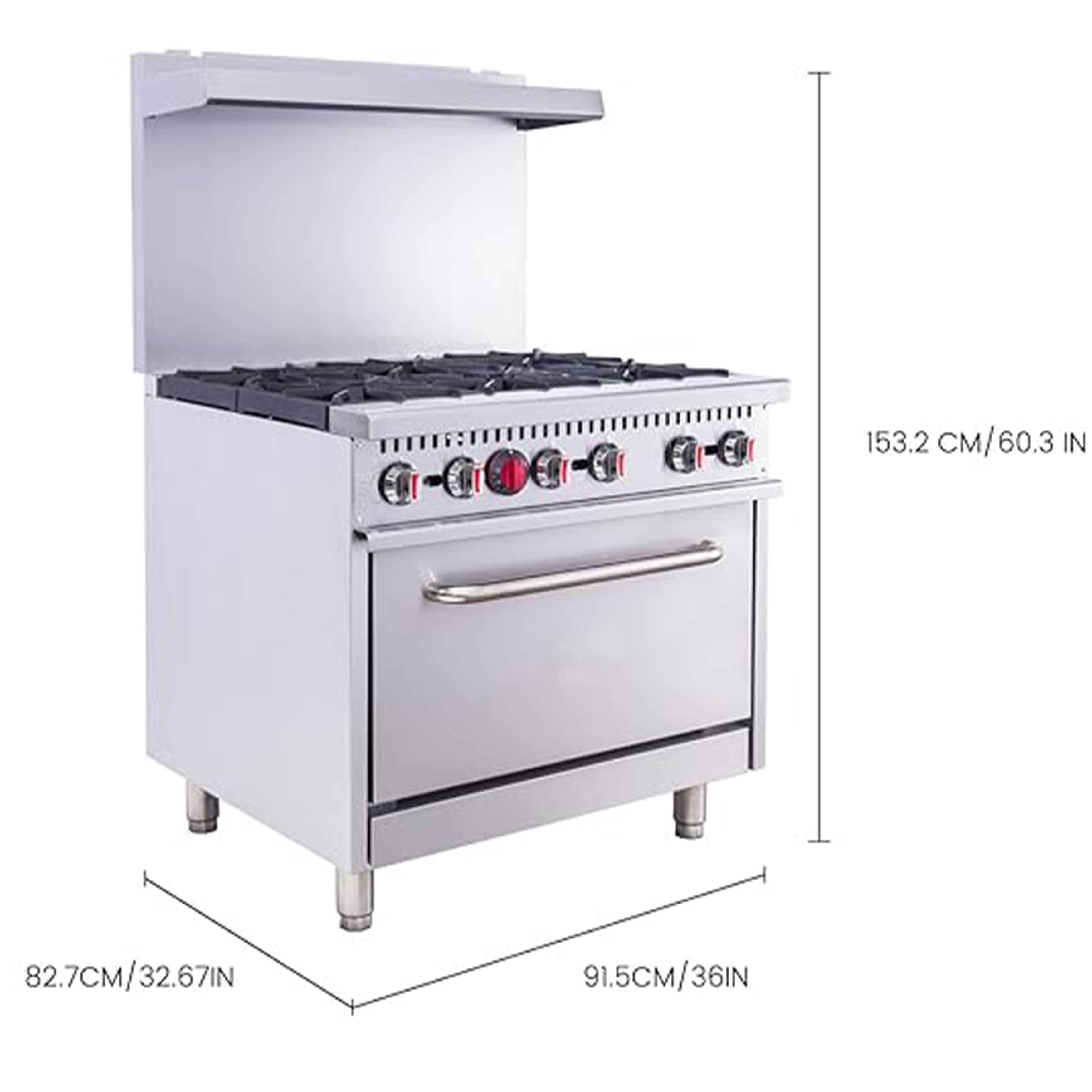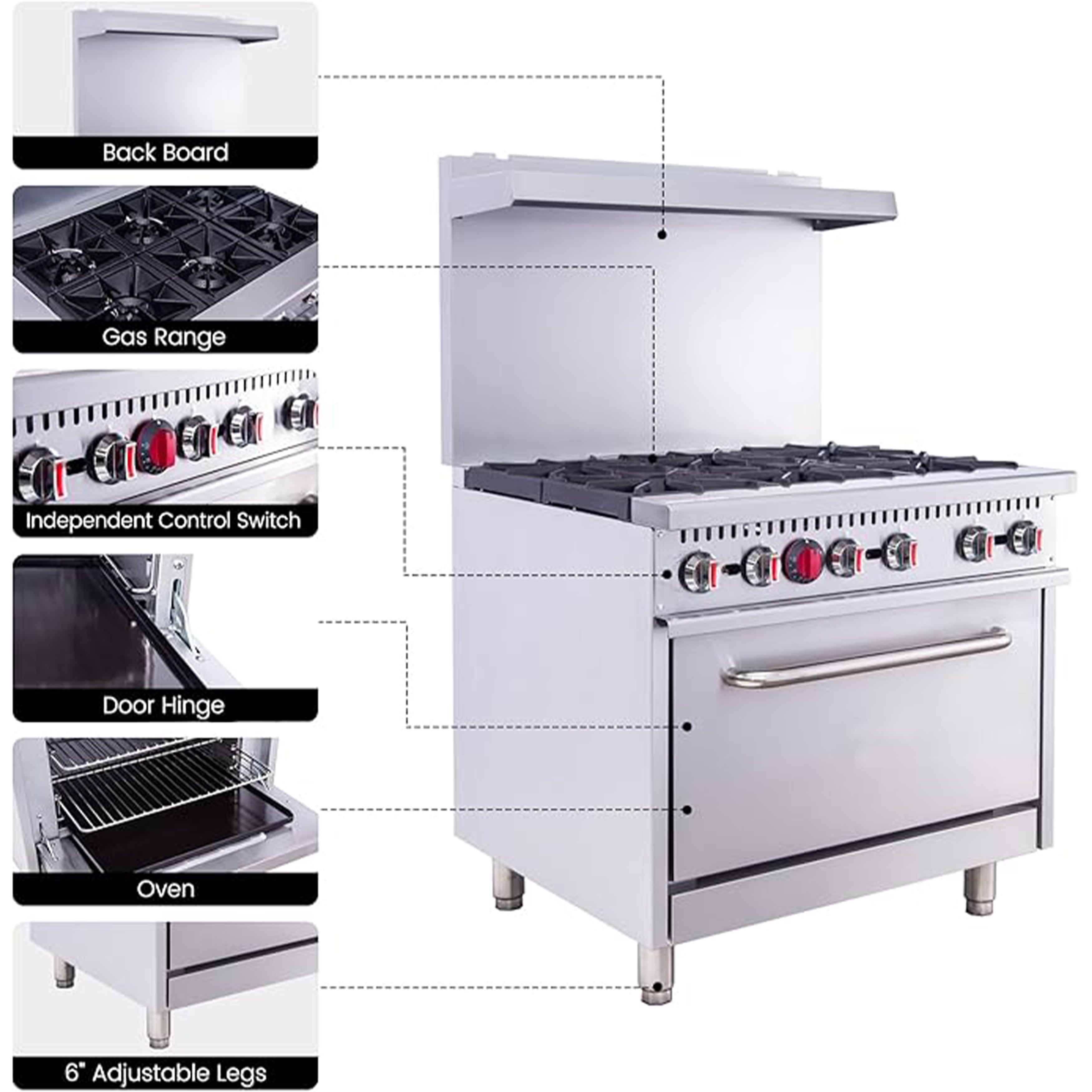 【 Product 】You will get a gas range stove, the overall size is 36″W X 32.5″D X 61″H, this freestanding range has 6 burners, each burner provides 30,000 BTU/hour of heat, giving you a steady fire. Heavy-duty cast iron grates can support pans, frying pans and other cookware, each burner has an independent controller to adjust the heat, you can fry, boil, saute, stew and many other cooking methods at the same time.【 ETL Certification】Oven range is made of high-quality stainless steel, high-temperature resistance, firm, anti-rust, and long service life. Independent metal knobs. Grates are made of Cast Iron. Stainless steel stove is manufactured with high-quality production technology, adopt a polished design, with a high-grade and professional appearance, and can be integrated into any kitchen design.【 Standard Oven 】 Equipped with a spacious oven, the temperature can be adjusted from 250-550°F. Oven burners are rated at 30,000 BTU/hr. The oven has 2 adjustable racks that can be adjusted as needed.【 Easy to Clean】Stainless steel structure gives the gas ranges superior cleanability, the food is not easy to stick, so the cleaning is simple. The removable tray captures food particles and crumbs for quick and easy cleanup.【 Wide Applicability 】6″ Stainless steel adjustable heavy-duty legs that can be adjusted according to your needs. Rear shelf can be placed for spices and other supplies. Range oven can be used in cafeteria, stores, snack bar. With this kitchen range is indispensable to any busy kitchen where space is at a premium. This unit ships ready for a natural gas connection, but can be converted to accept liquid propane, equipped with regulator.