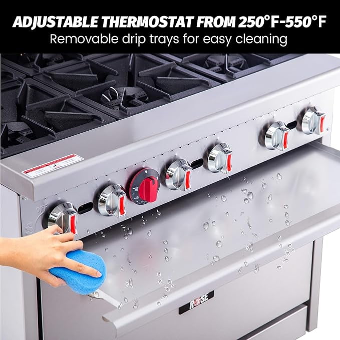 Thermostat-controlled oven: 250℉ to 550℉BTU:210,000Burners: 6NSF cetified
