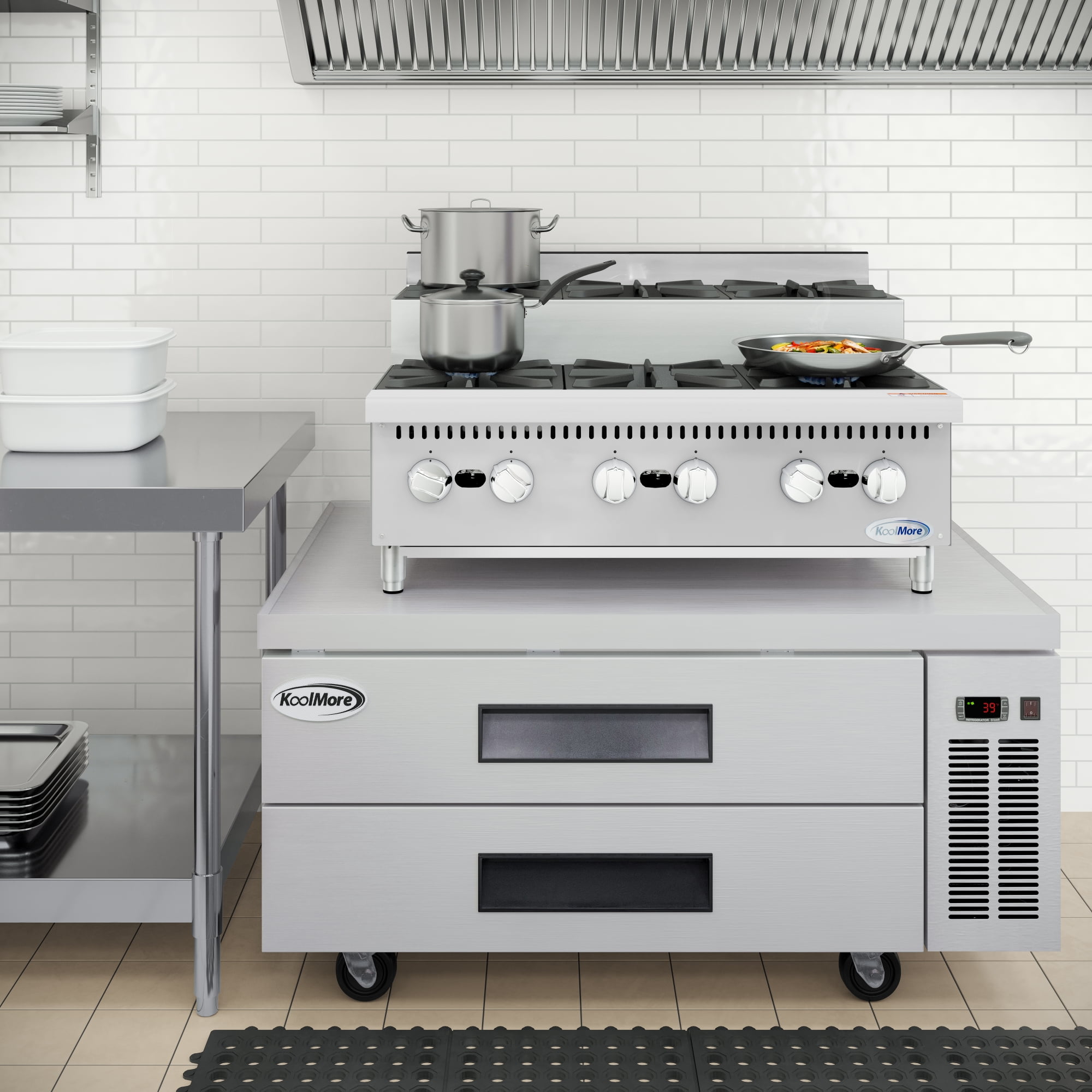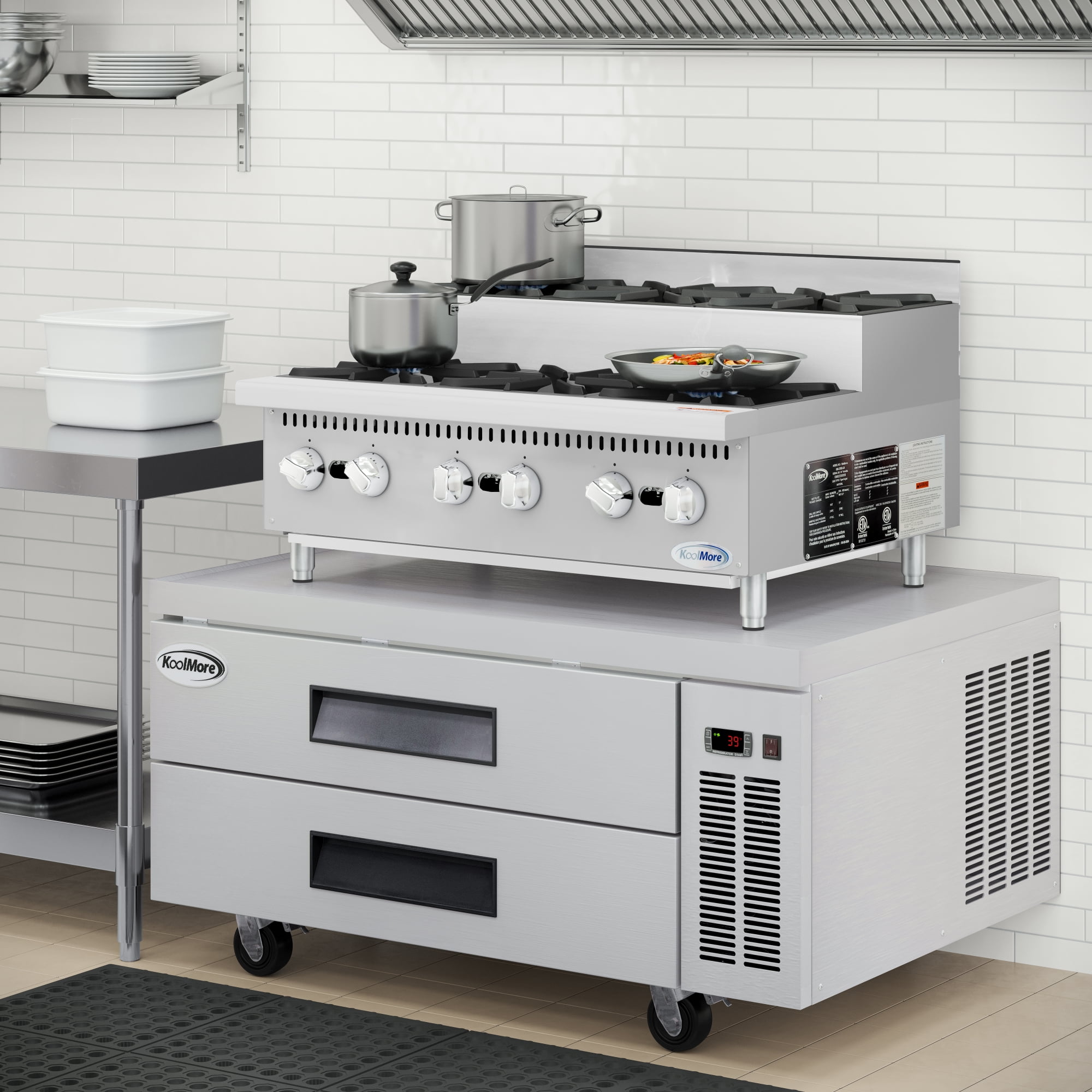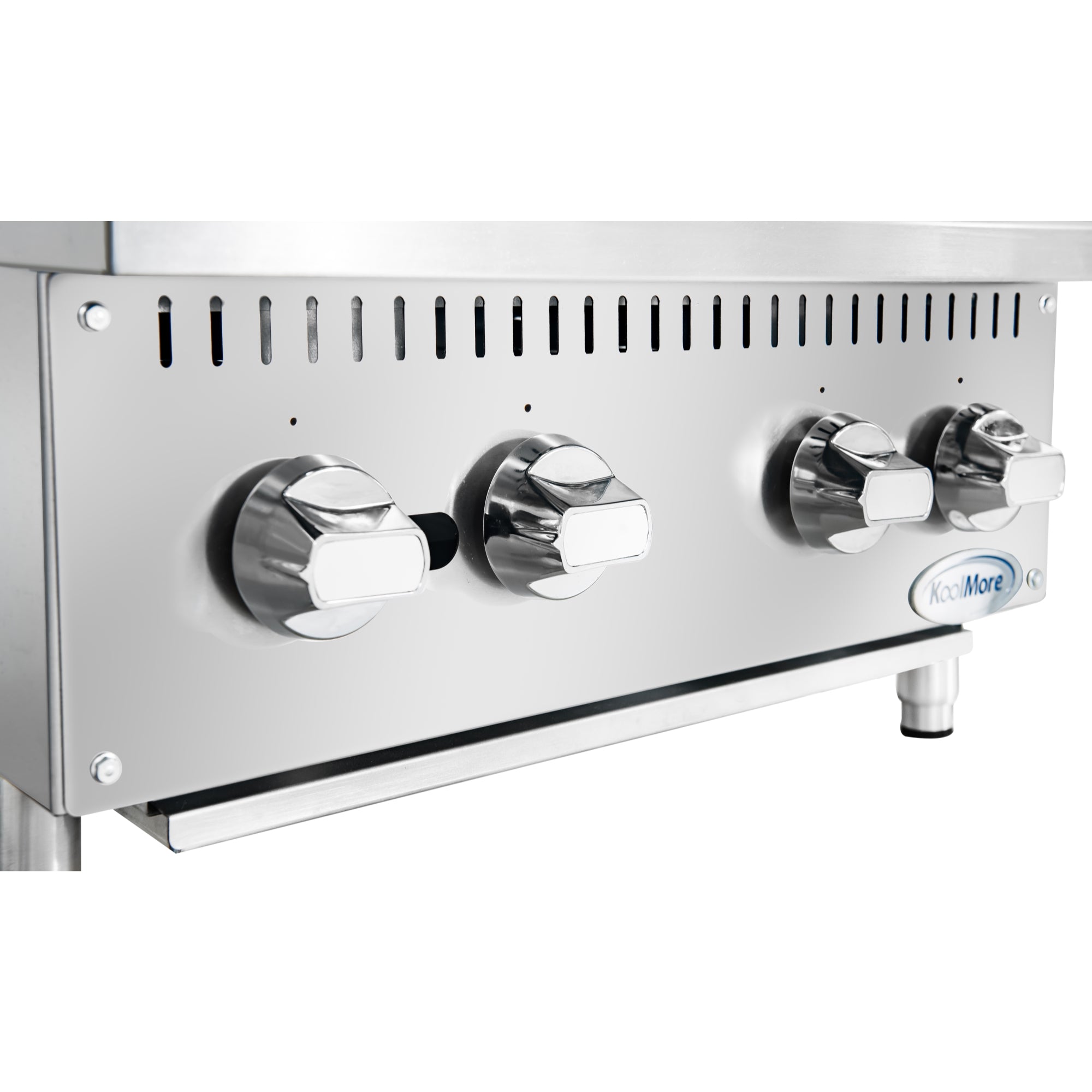 Introducing the KoolMore 36 In. Commercial Step-Up Gas Range that combines efficiency, durability, and user-friendly features.