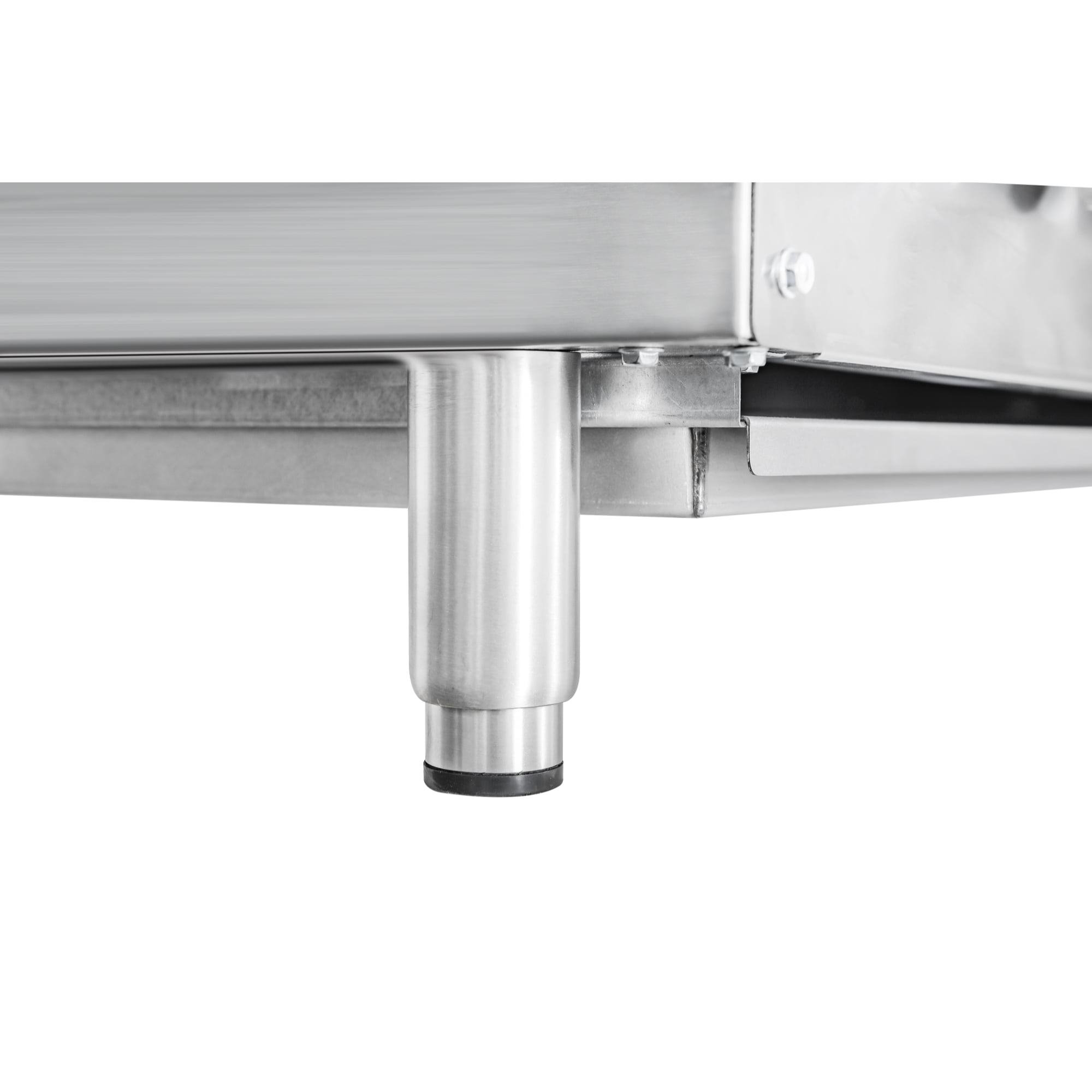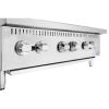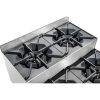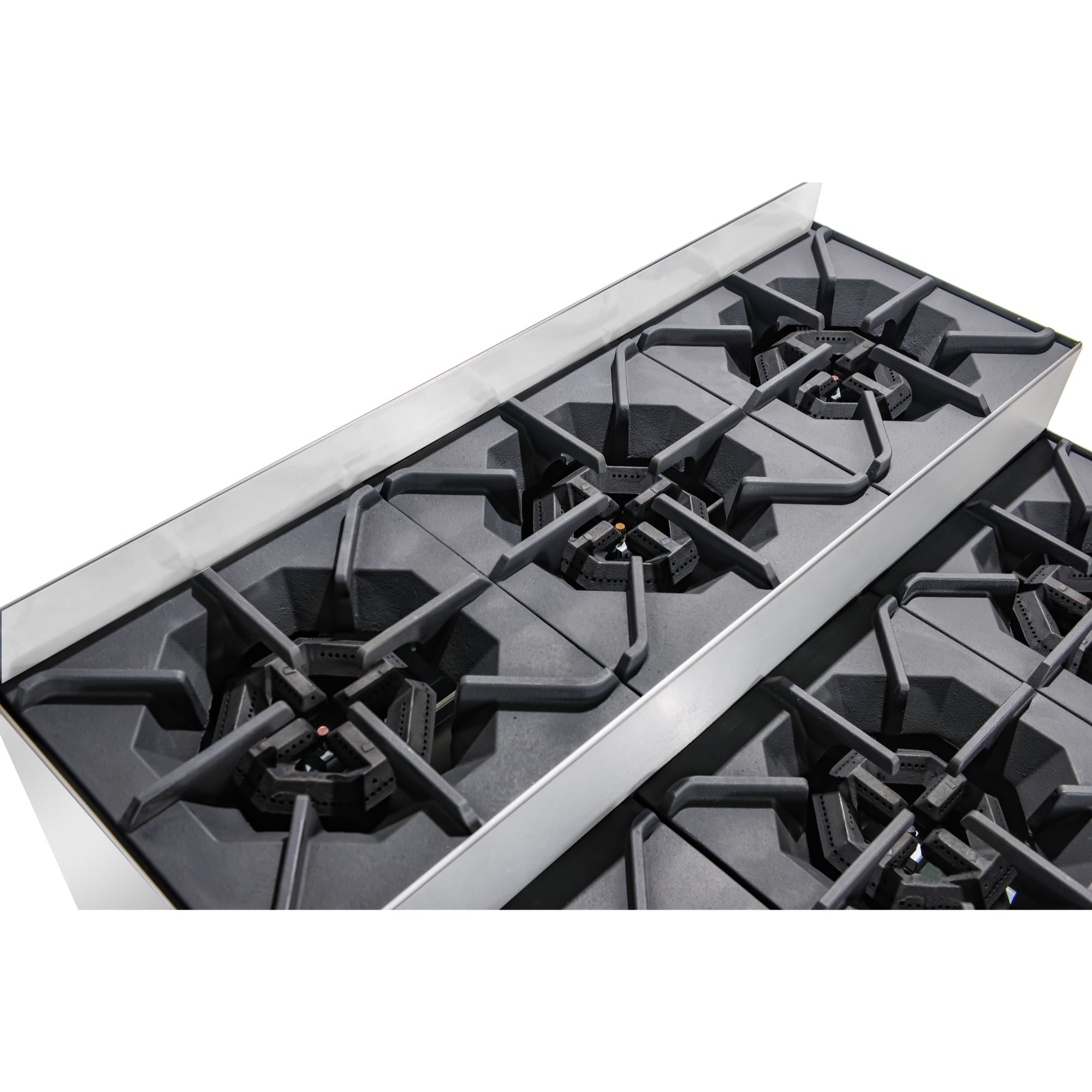 The full-length seamless drip pan simplifies cleaning, while the heavy-duty cast iron grates ensure excellent heat retention. Designed for countertop use, this range also includes adjustable legs for ergonomic flexibility and a convertible gas system for various kitchen setups.