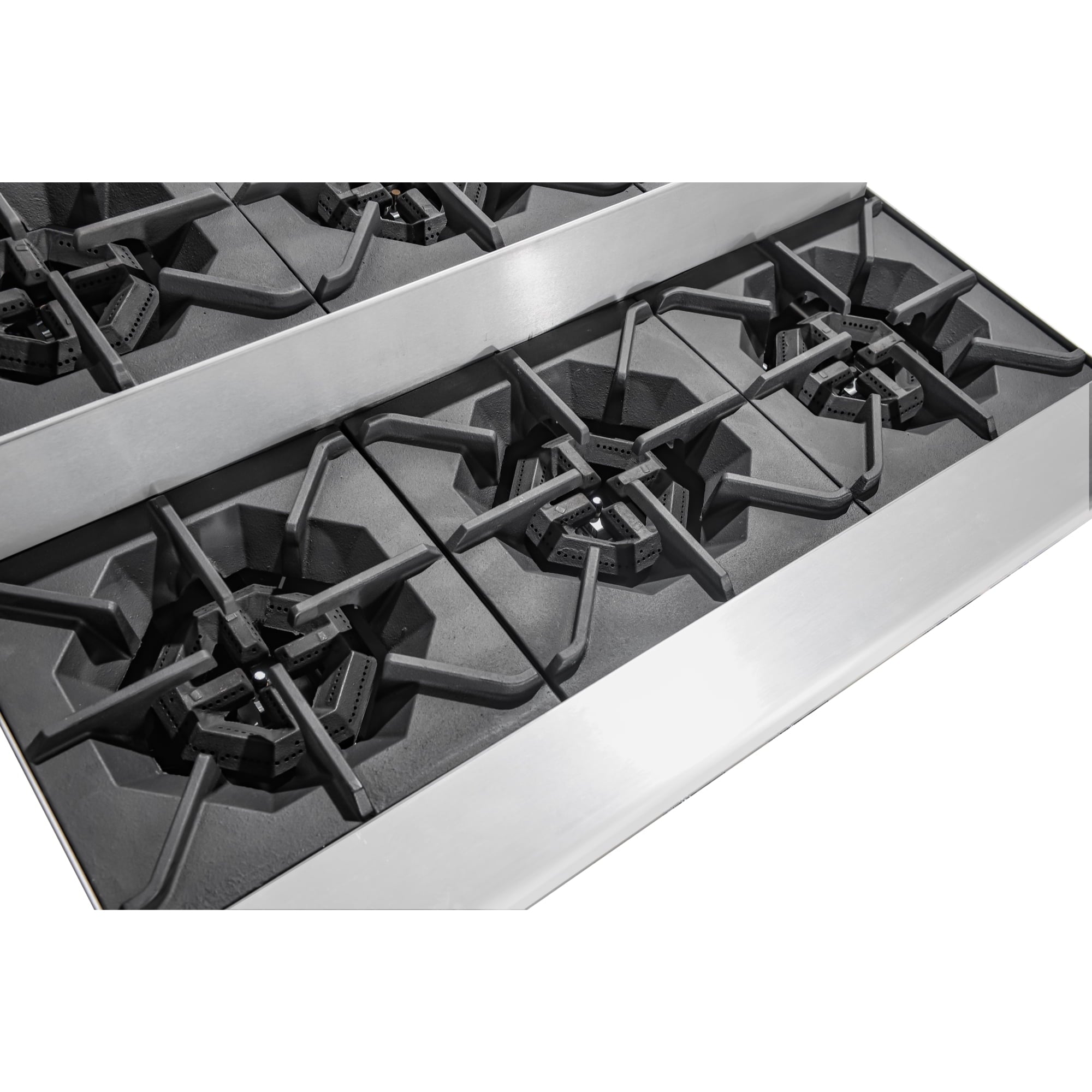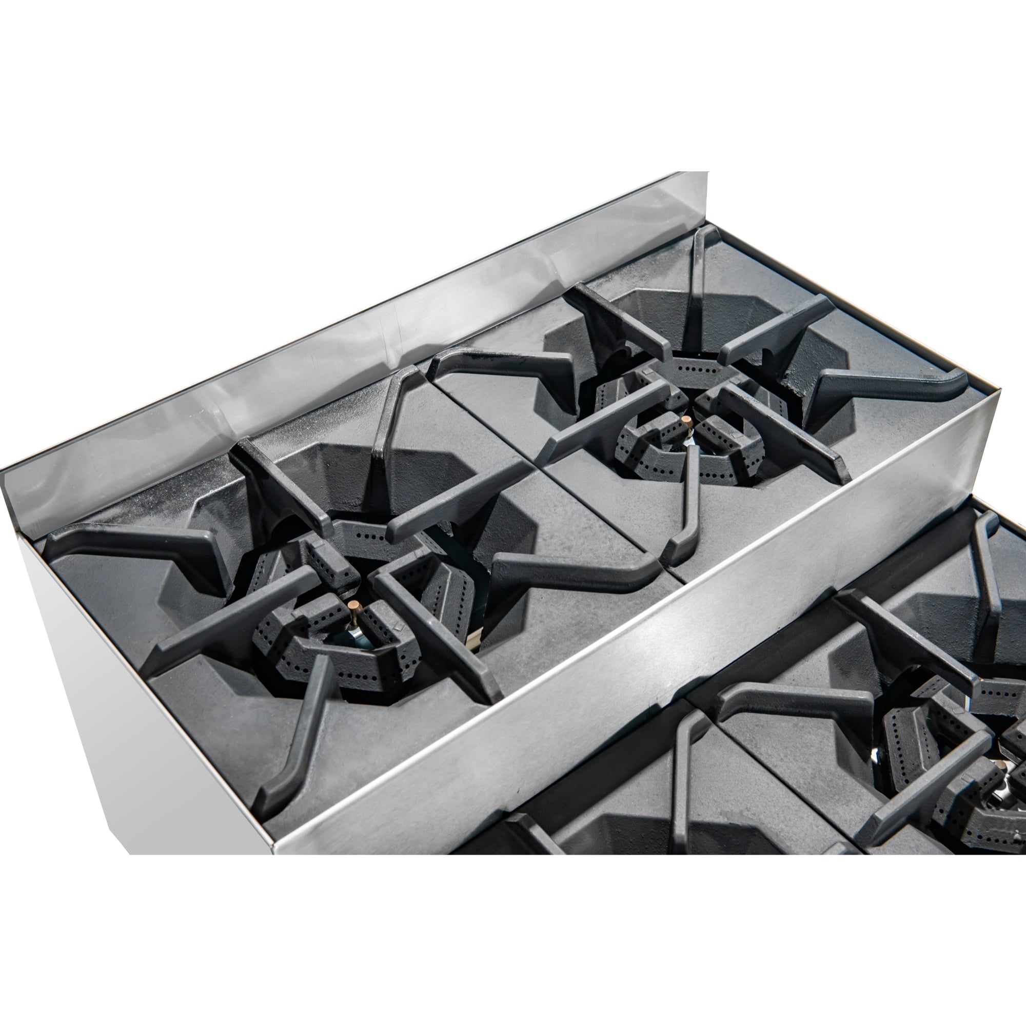 It features six powerful burners, each delivering 26,000 BTU, perfect for high-volume cooking needs.