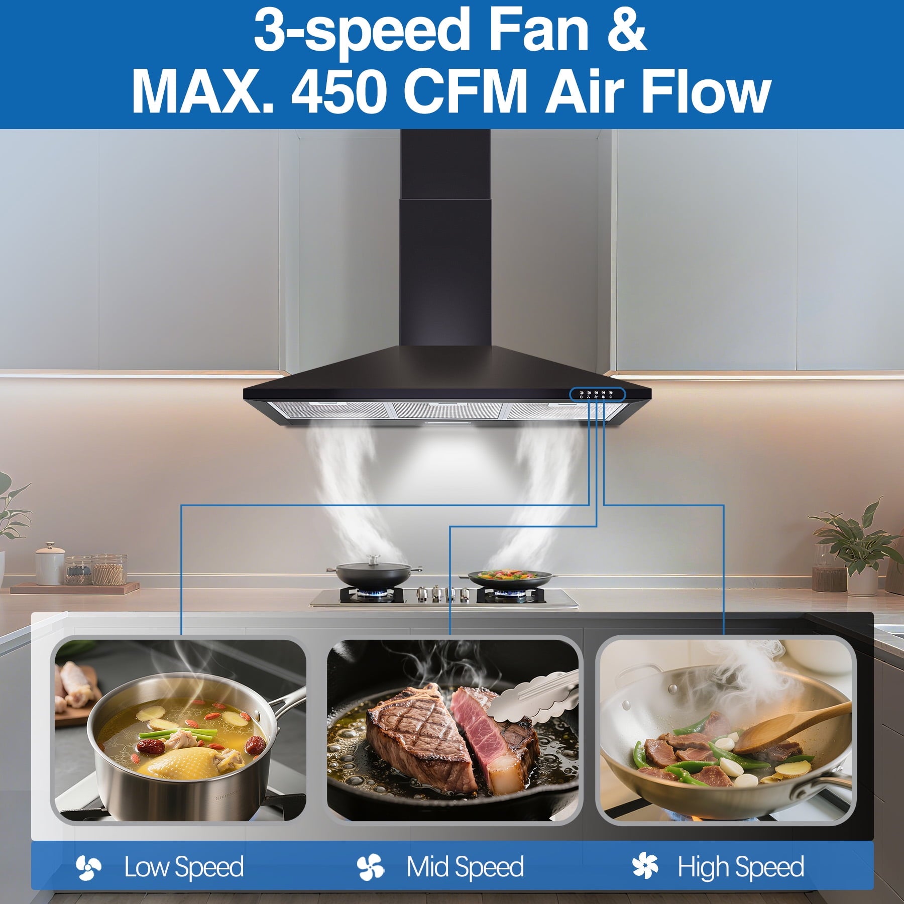 【450 CFM Powerful Suction & Quiet 3-Speed Fan】The 3-speed exhaust fan delivers 450 CFM suction power, efficiently removing smoke and odors while operating under 55dB. Perfect for frying, grilling, or boiling without noise disturbance