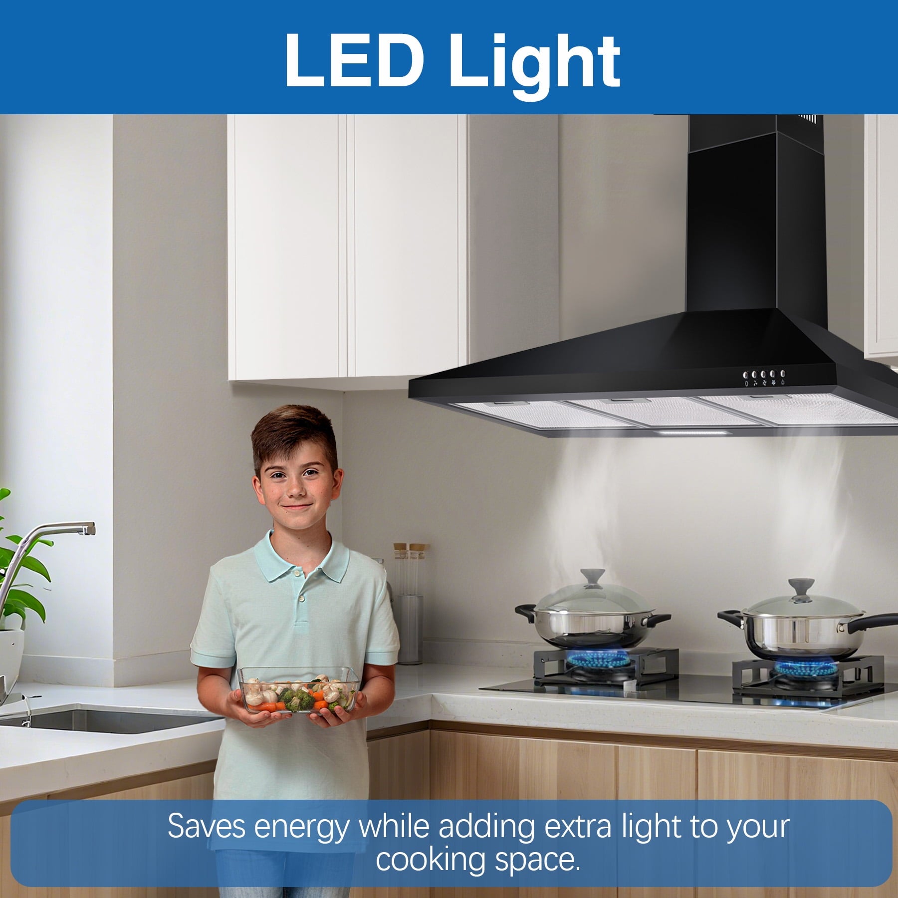 Durable and reusable aluminum mesh filters match with strong motor will keep your kitchen clean and fresh, remove grease and cooking odors efficiently.Energy Saving LED Light