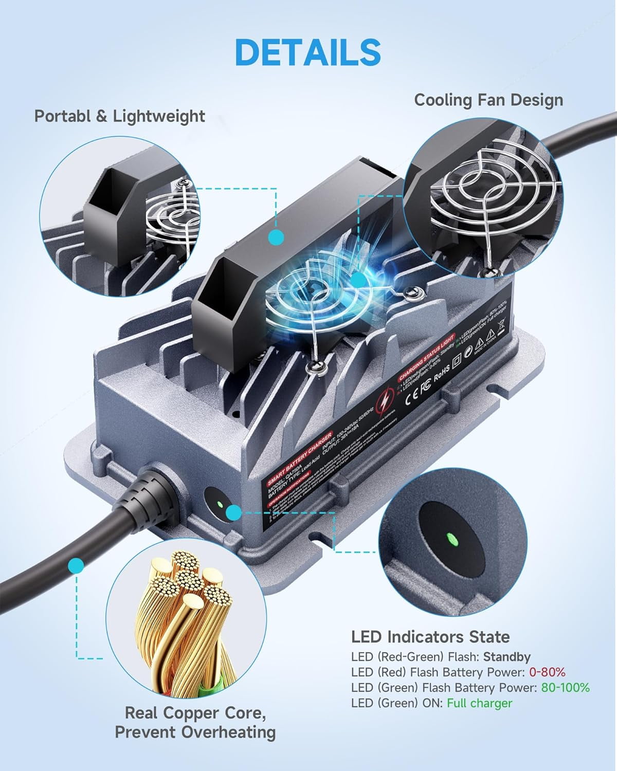 - Smart Protection Features: Offers multiple safety functions, including low-voltage and over-voltage protection, overheat and empty-load protection, short/reverse protection, and automatic shutdown when fully charged.