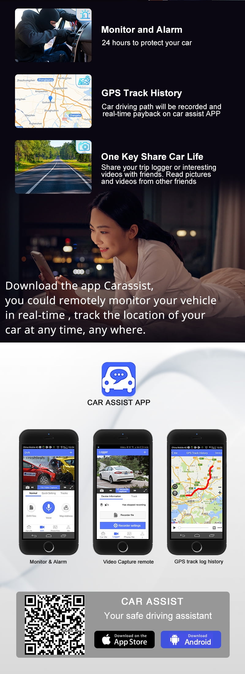 when something happens to your car, the dash cam will send alarm message to your phone via the app car assist.