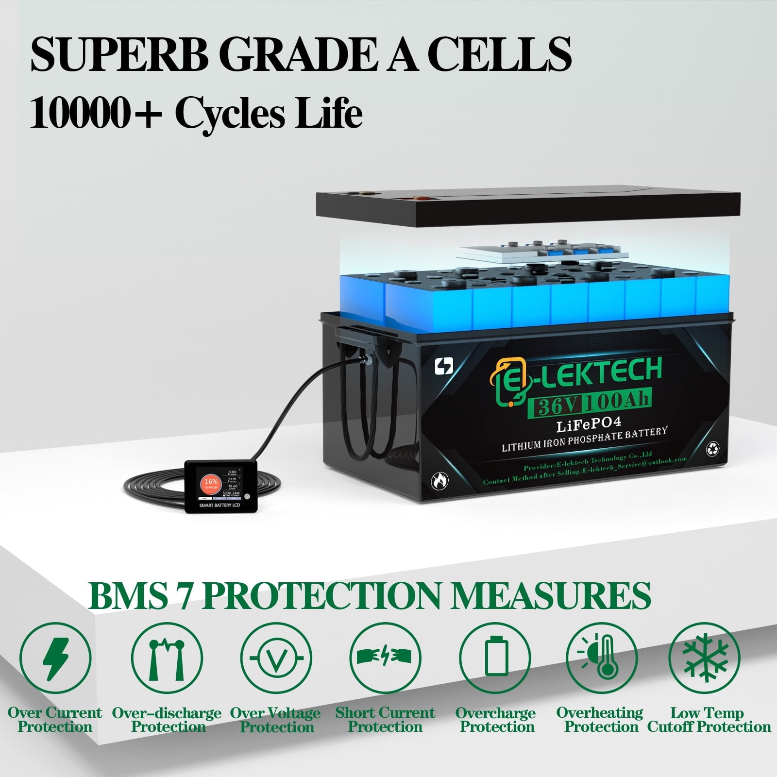 【Lightweight and Portable】Product size: Length 19.52* Width 10.6* Height 8.8 inches. The E-LekTech 36V 100Ah LiFePO4 battery weighs just 58.4 pounds, half the weight of a lead-acid battery, and has twice the capacity of a lead-acid battery, making it easy to move and install. Our 36V 100Ah LiFePO4 batteries provide 100% of the available capacity compared to lead-acid batteries. Both indoor and outdoor, easy to carry.