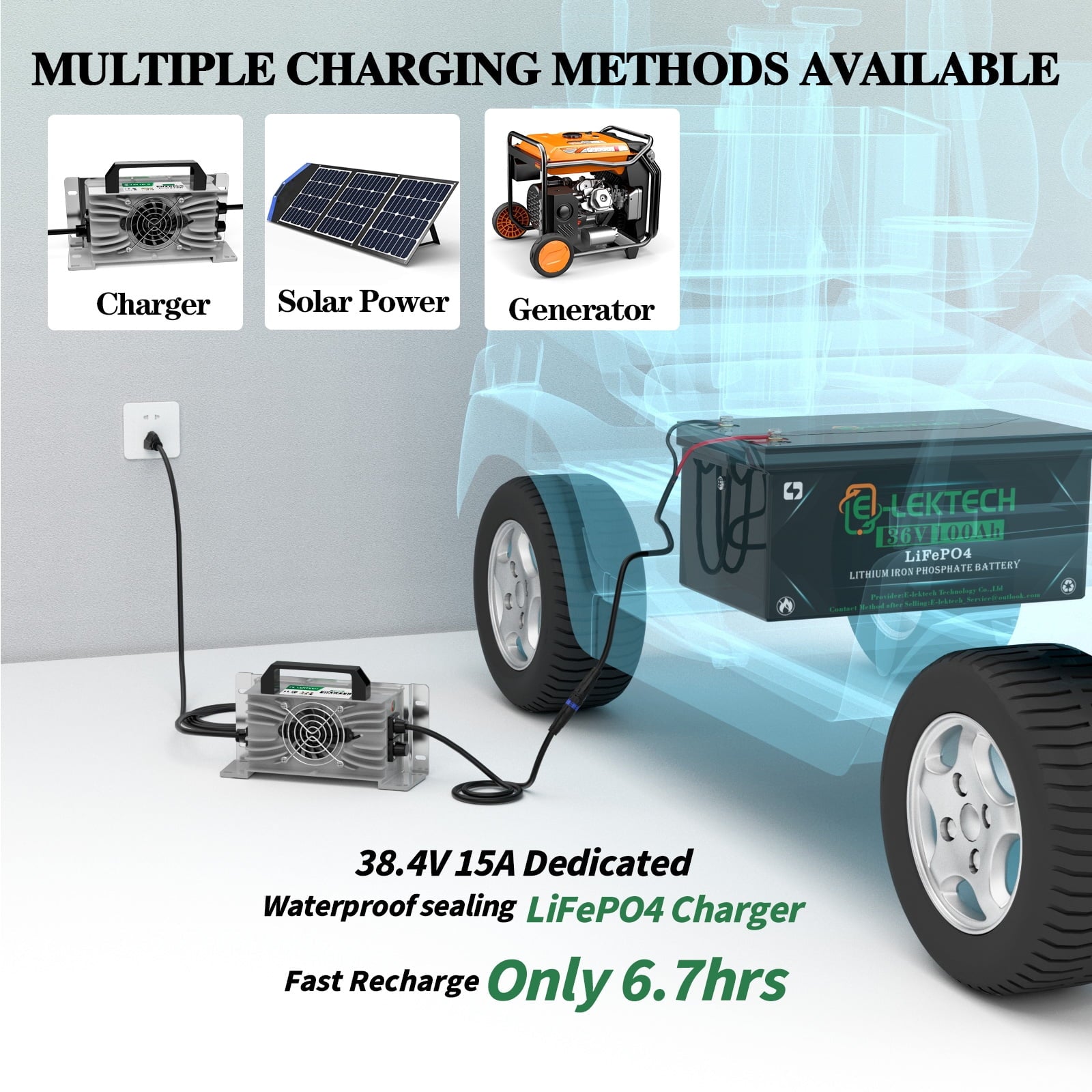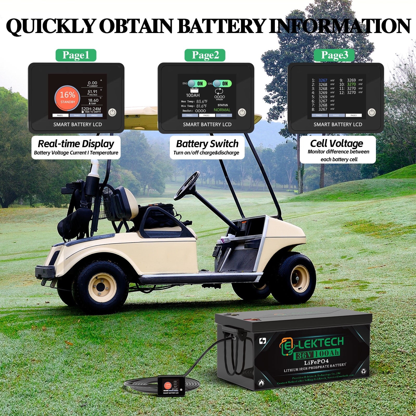• 【LCD Touchscreen & APP】Designed to meet the needs of 36V golf carts, the E-LekTech 36V LiFePO4 lithium battery delivers more power and superior performance and is compatible with most golf carts. It also comes with a 43.8V LiFePO4 battery charger that supports fast charging. Equipped with touch screen and APP, you can view and control the battery in real time on the LCD screen.