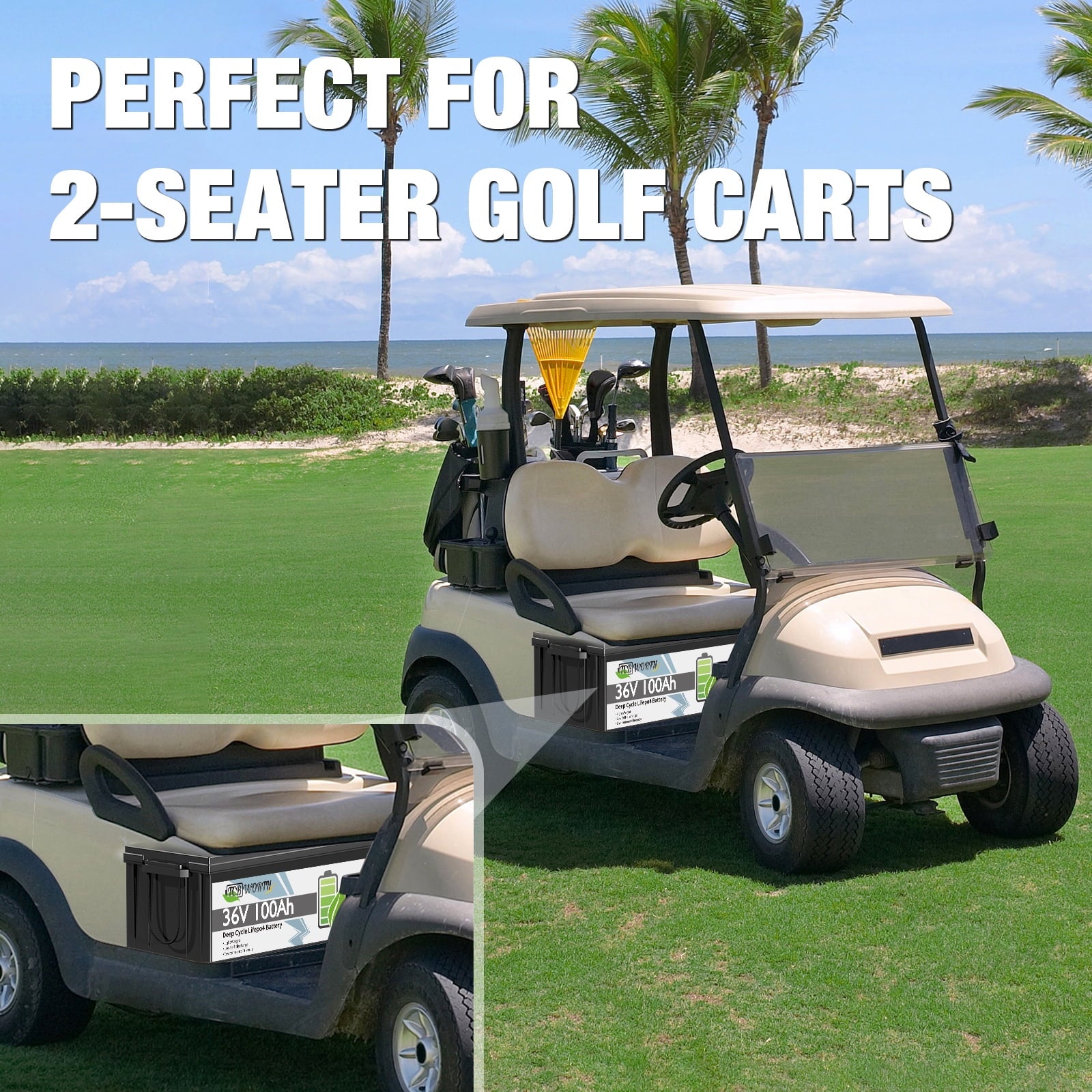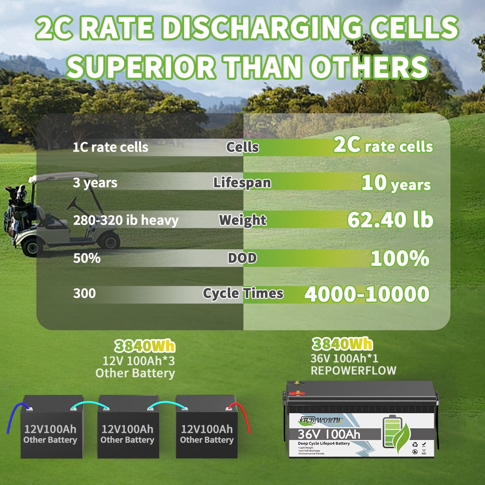 - 【Great for Golf Carts, Easy Installation】The 38.4V 100Ah LiFePO4 battery is designed specifically for golf carts.This 36V 100Ah Lithium battery ensures higher energy density and stability, with a lifespan of up to 10 years and 5000+ deep cycles, easy installation,delivering truly superior performance.Suitable for Club Car, EZGO, ICON and Yamaha golf carts.
