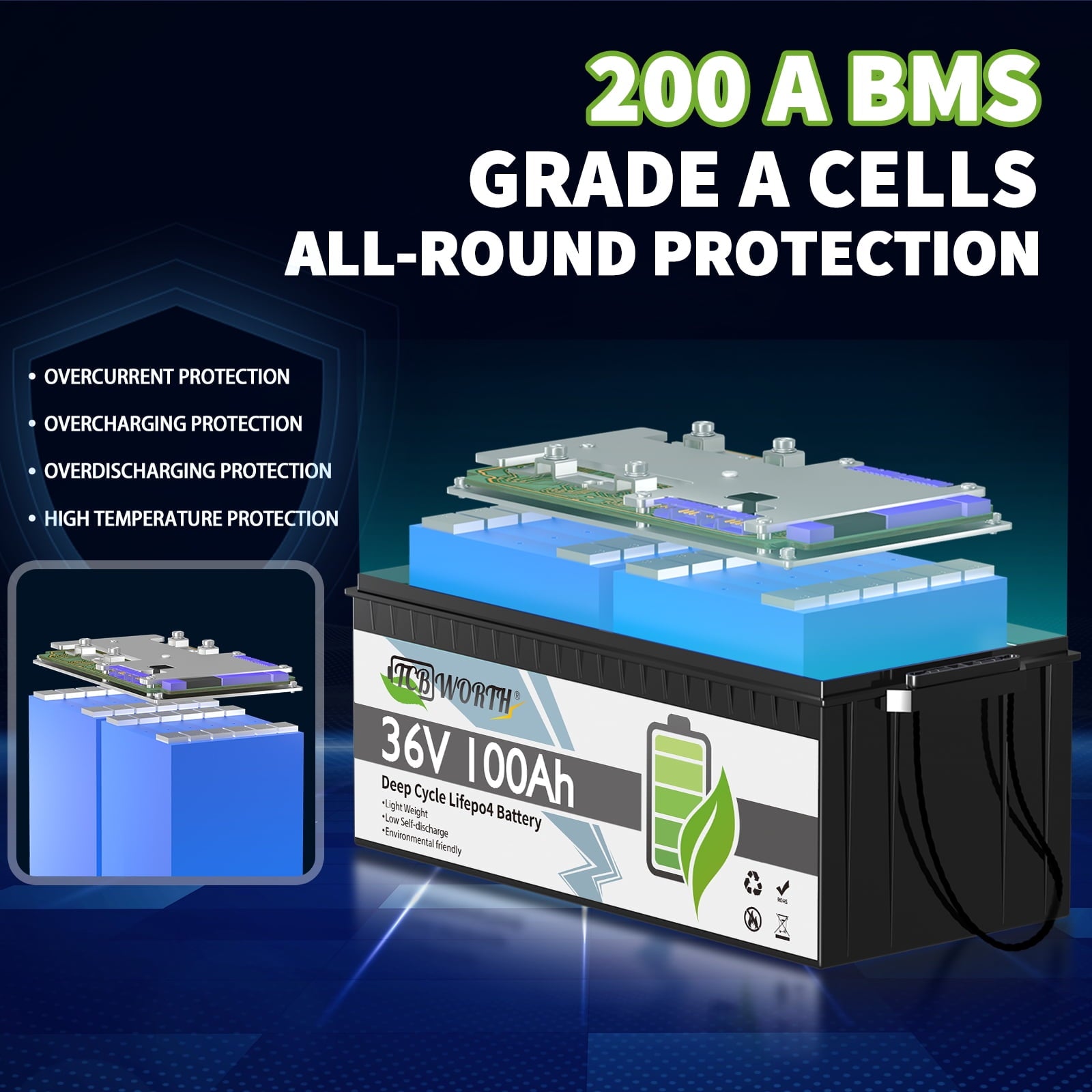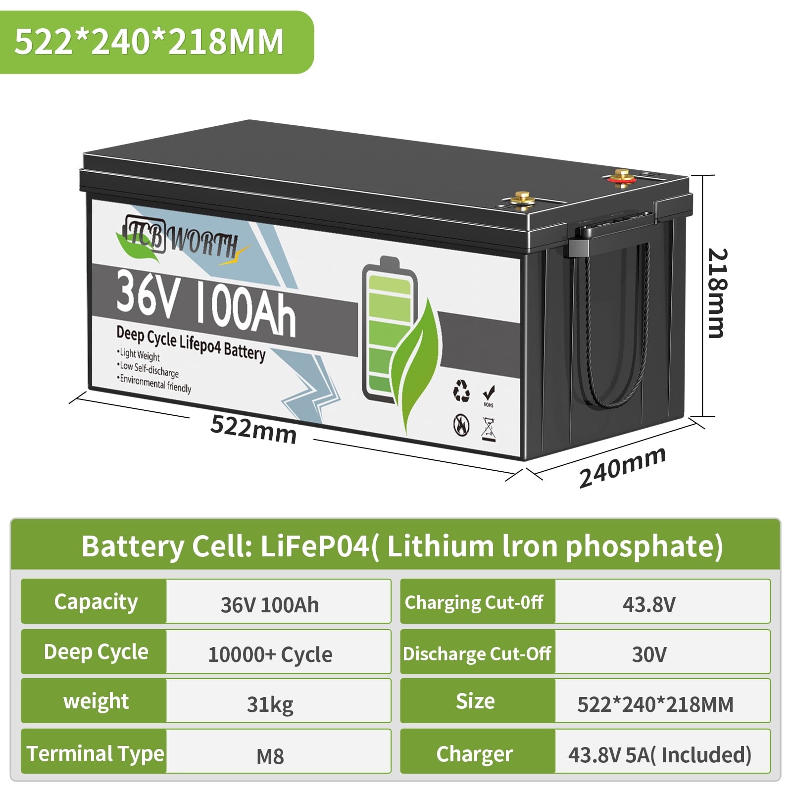 - 【Grade A Cells Lithium Battery】TCBWORTH 36V lithium battery is made from grade A lithium iron phosphate battery cells which is better than those claim automotive grade.it better protects the battery performance and prolongs the cycle times, and the higher voltage makes it more stable.