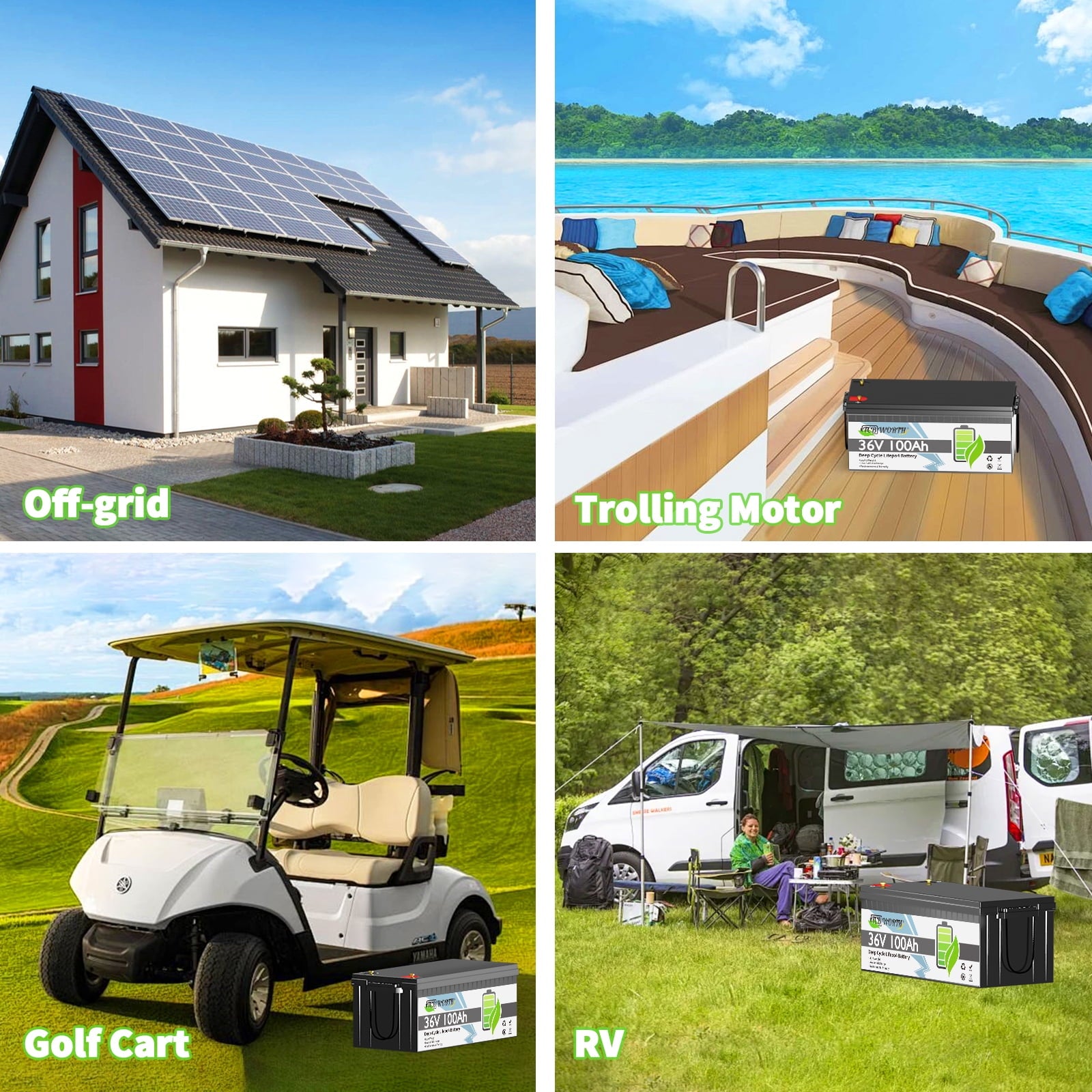 - 【Capacity Expansion & Widely Use 】36V 100Ah Lifepo4 Batteries support parallel connecting. Powerful energy expansion system could be widely used for home storage system (avoiding the effects of power outages), off-grid system, boat, Trolling Motor, Marine, trailer, Solar System, Camping, golf cart,Street legal cart, lawn mower.