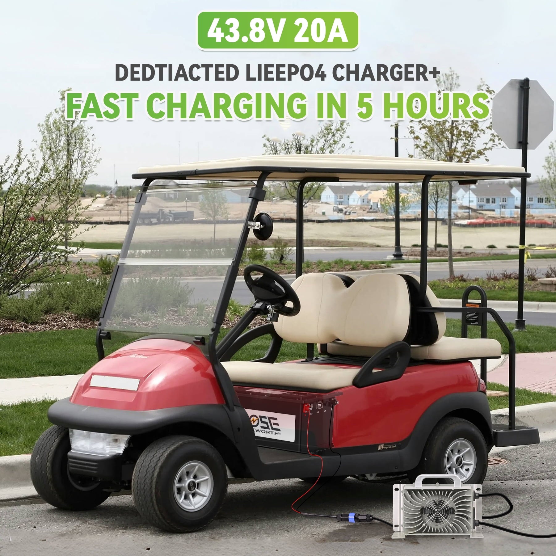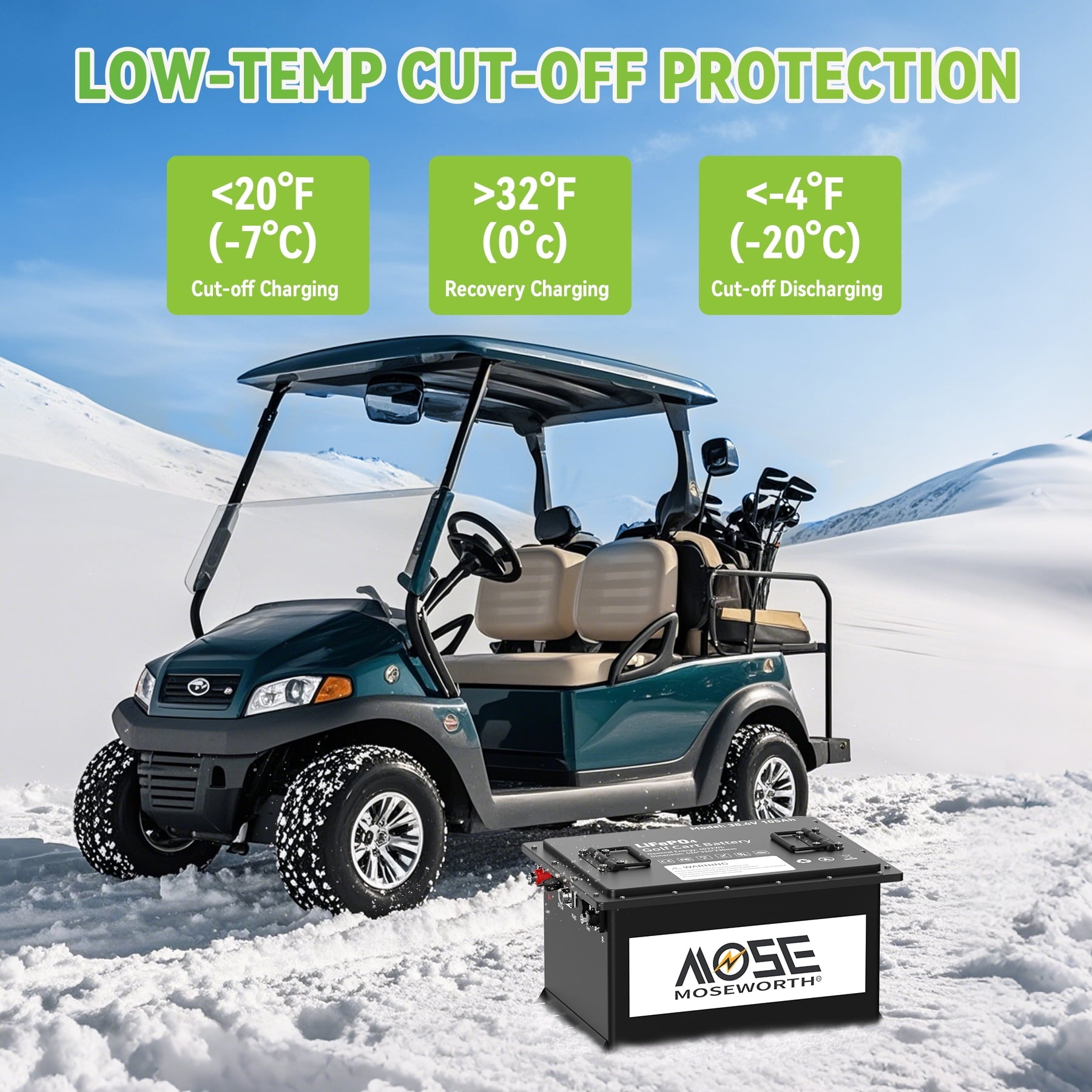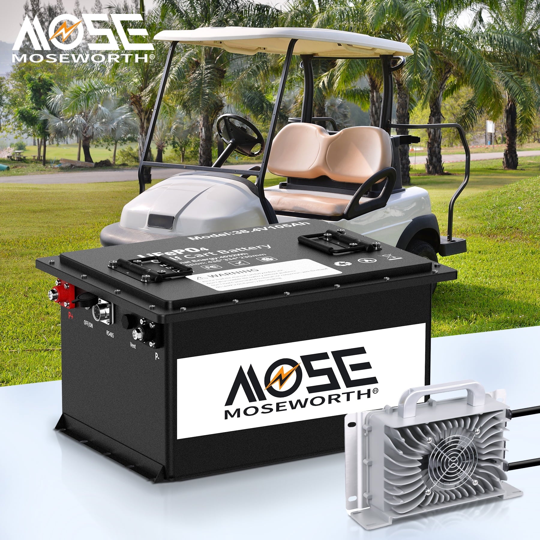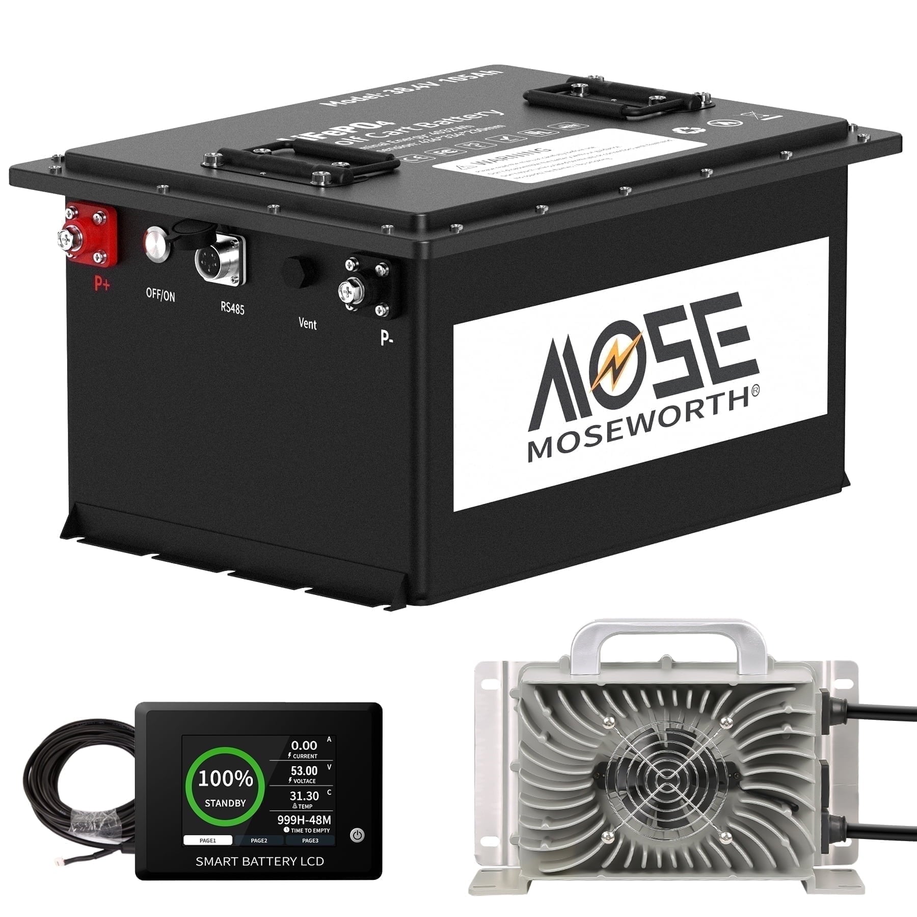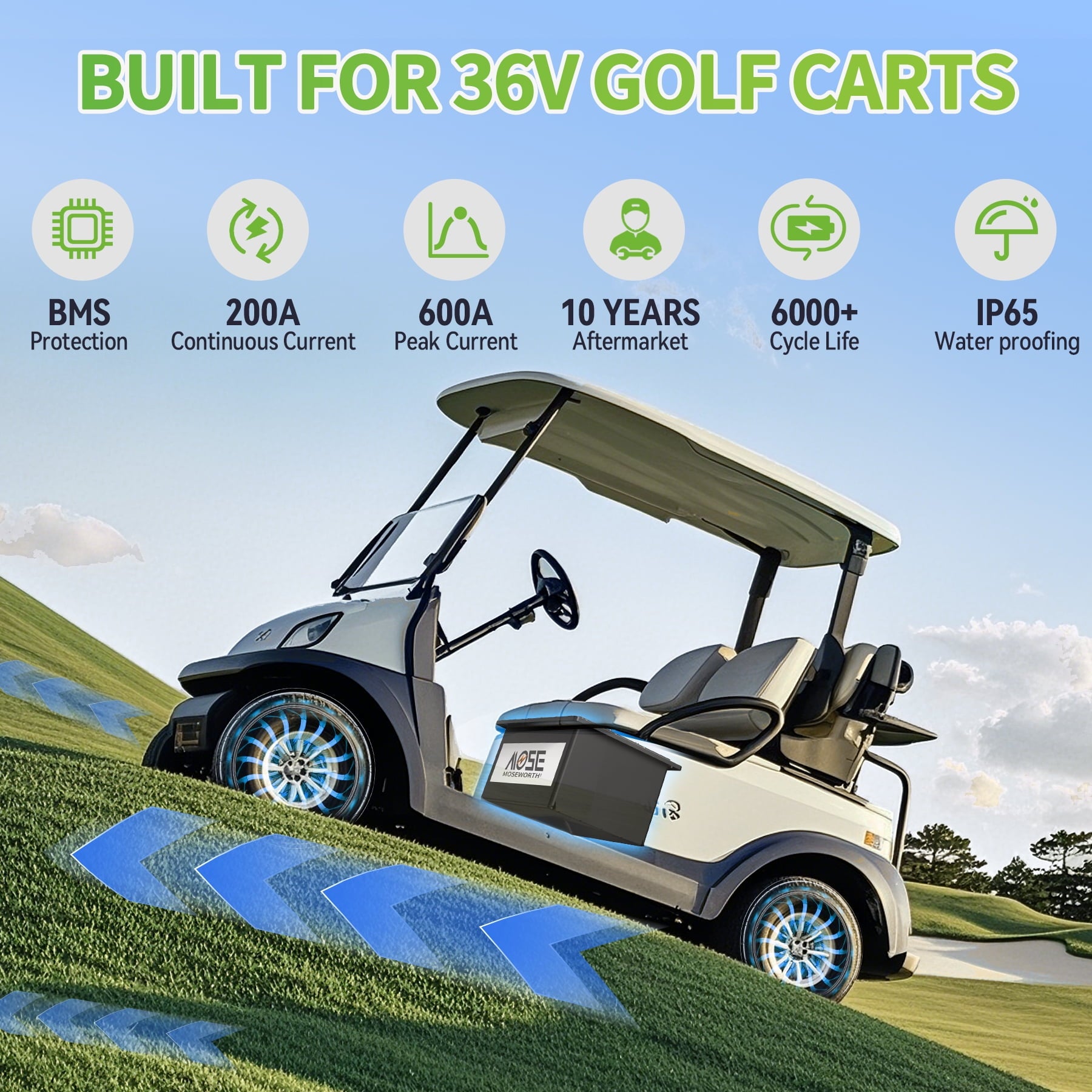 - 【Specially Designed & LCD Display Screen】MOSEWORTH LiFePO4 battery is specially designed for the 36V golf cart industry, with more powerful energy and excellent performance, compatible with the main brand golf cart controllers in the market. It comes with a 43.8V 20A LiFePO4 charger that supports fast charging, 0% to 100% in just 5 hours. The battery also comes with a 2.8-inch touchscreen that displays real-time battery information.