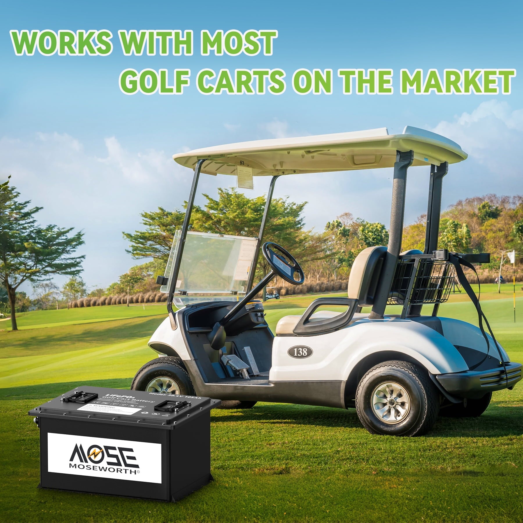 - 【Extended Range & More Powerful 】MOSEWORTH 36V 105Ah lithium golf cart batteries with 4.03kWh capacity, enabling your golf cart to cover 30-50 miles on a single charge, ensuring you enjoy uninterrupted rides with robust, consistent power.