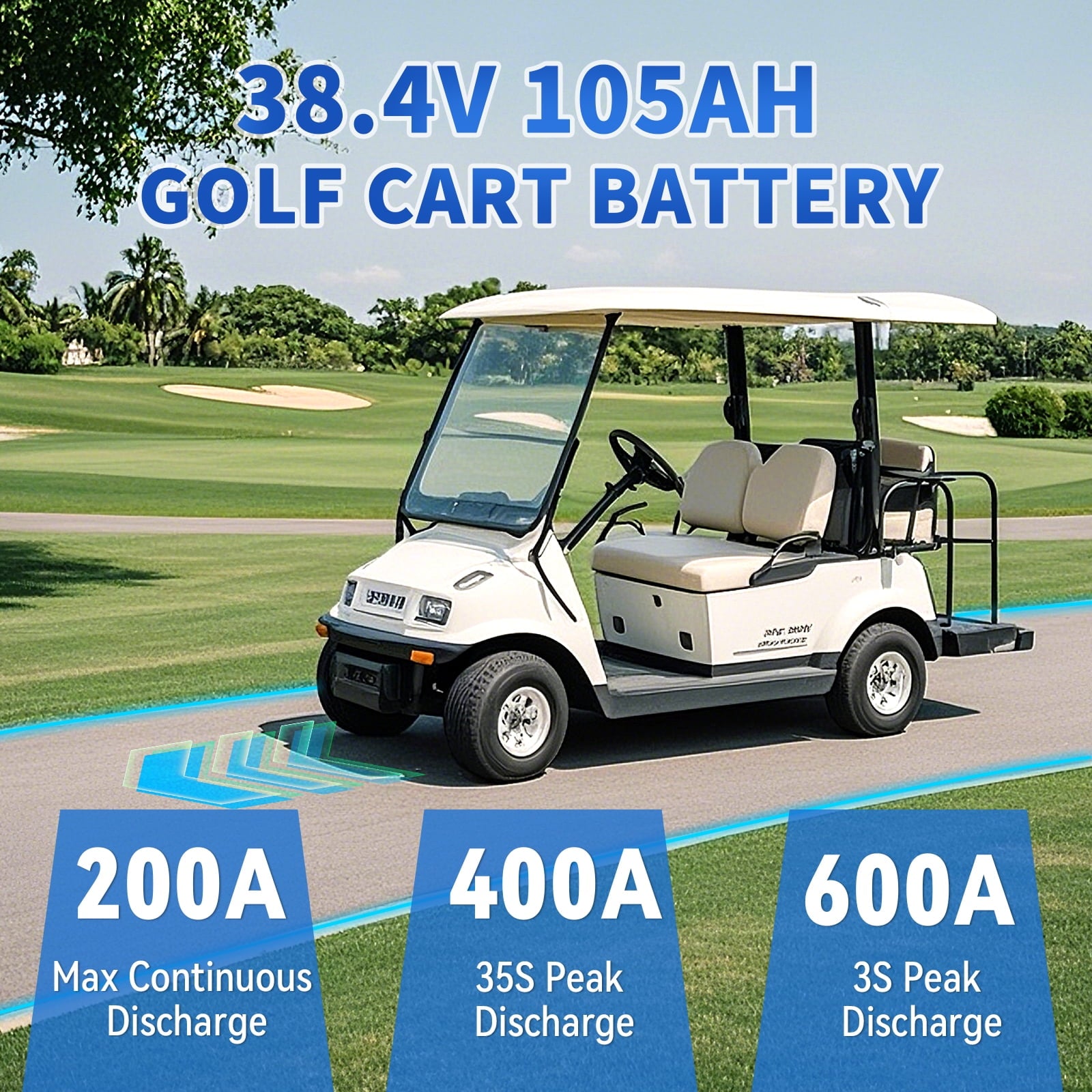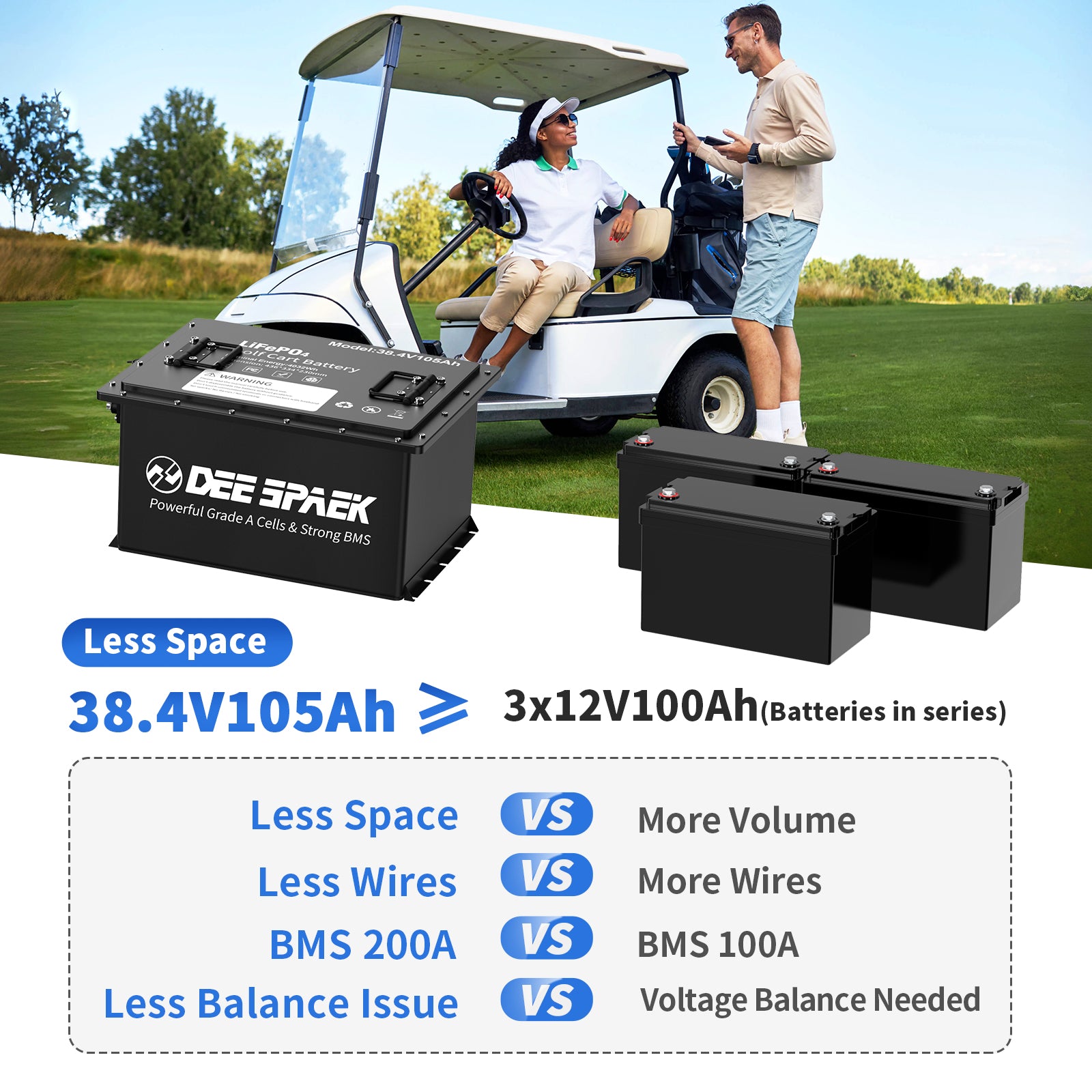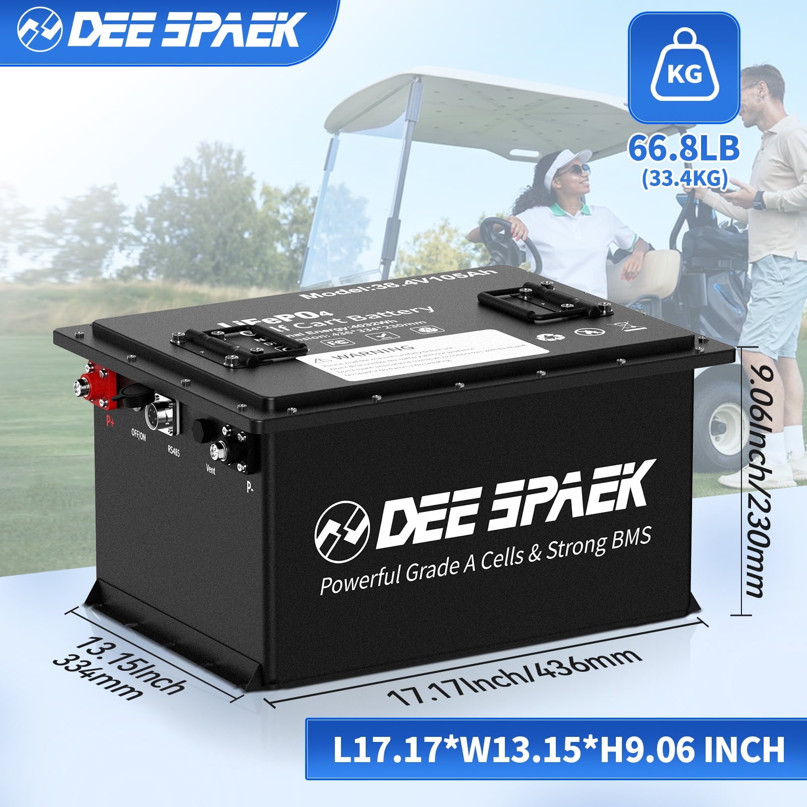 【Get Rid of Lead-acid 】DEESPAEK Power 38.4V105Ah lithium golf cart battery unleashes an impressive surge of power, delivering exceptional acceleration and performance. Conquer even the toughest terrains with ease and take your golf game to new heights. Say goodbye to range anxiety! Allowing you to enjoy continuous golfing for 30-50 miles on a single charge.