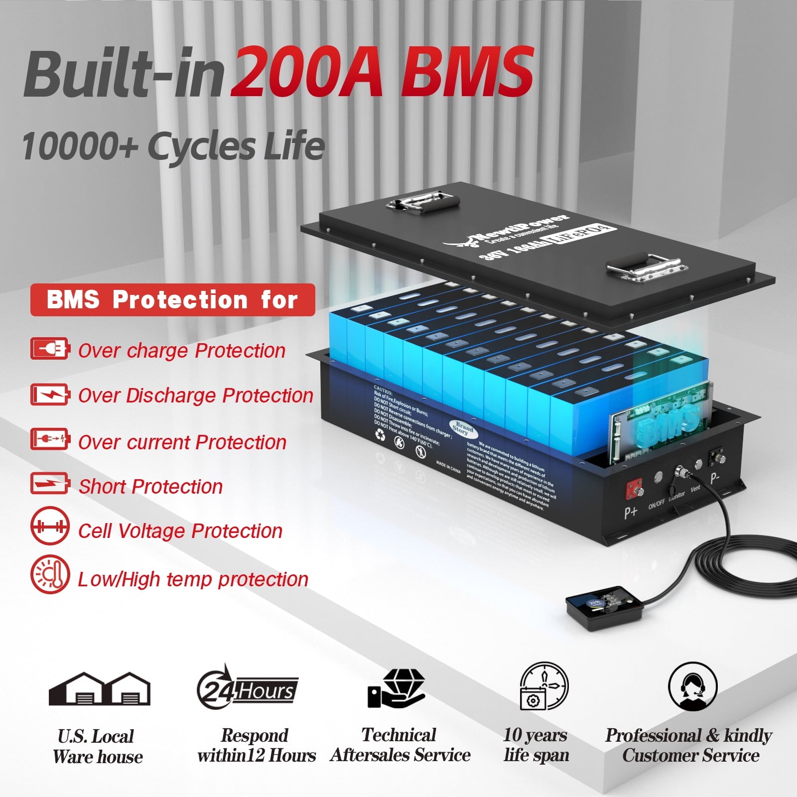 - 【Intelligent Charging Protection】NewtiPower LiFePO4 battery has built-in BMS (battery management system) to protect the battery from overcharge, overdischarge, overcurrent and short circuit with excellent self discharge rate. Built in temperature protection function, BMS cuts off charging 32℉ (0℃). High temperature cut-off can prevent charging from exceeding 158 ℉ (70 ℃).Our BMS supports parallel connections, but we recommend not exceeding 6 batteries.
