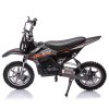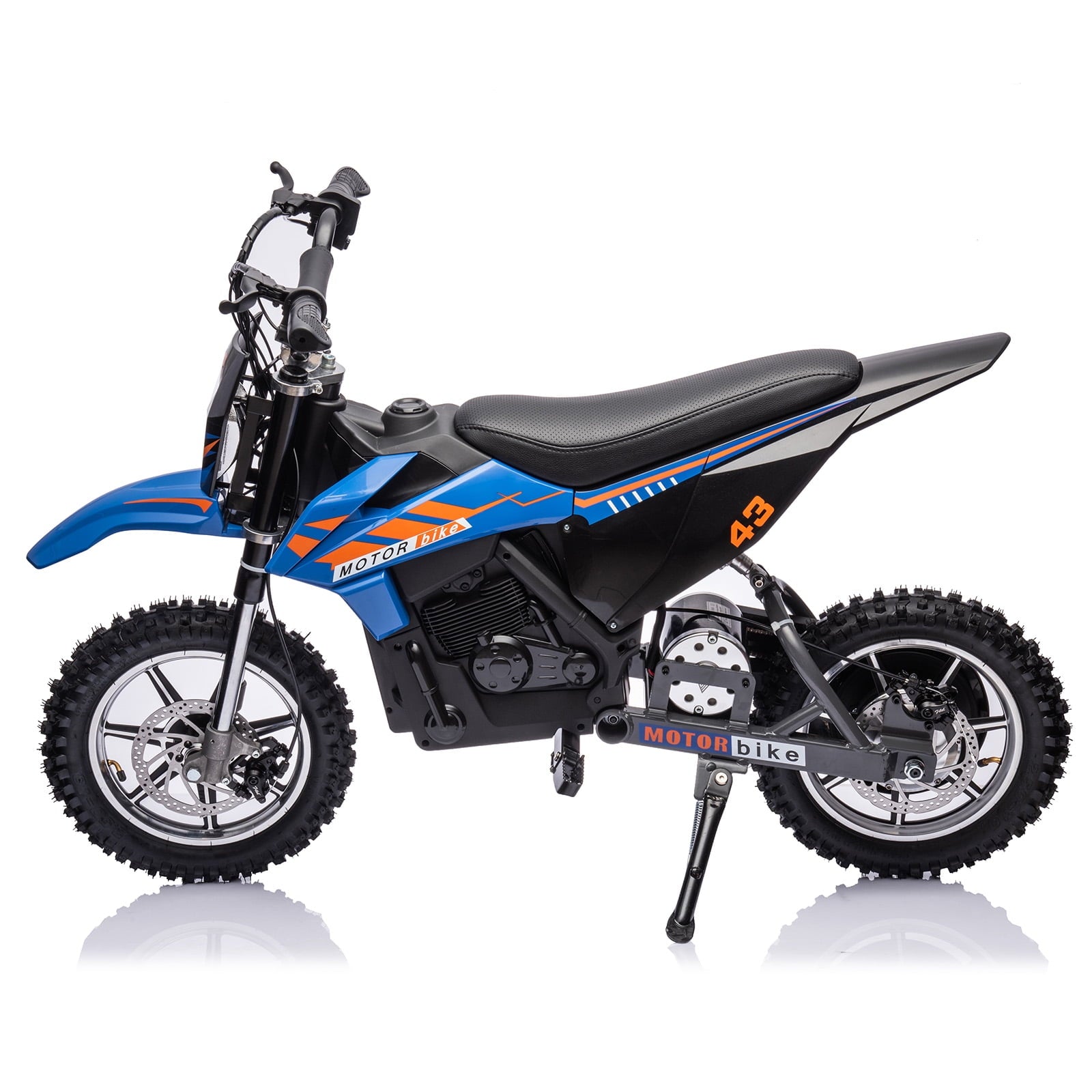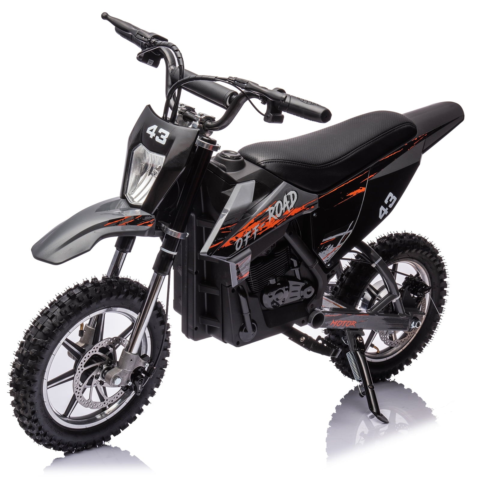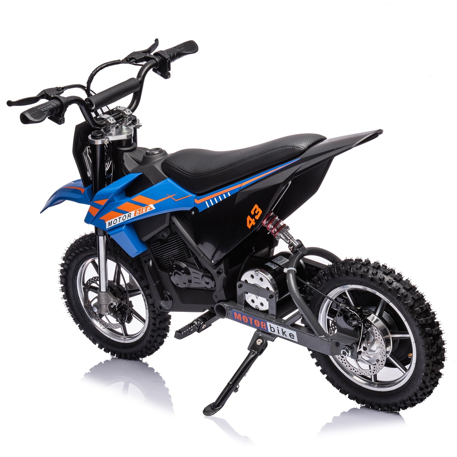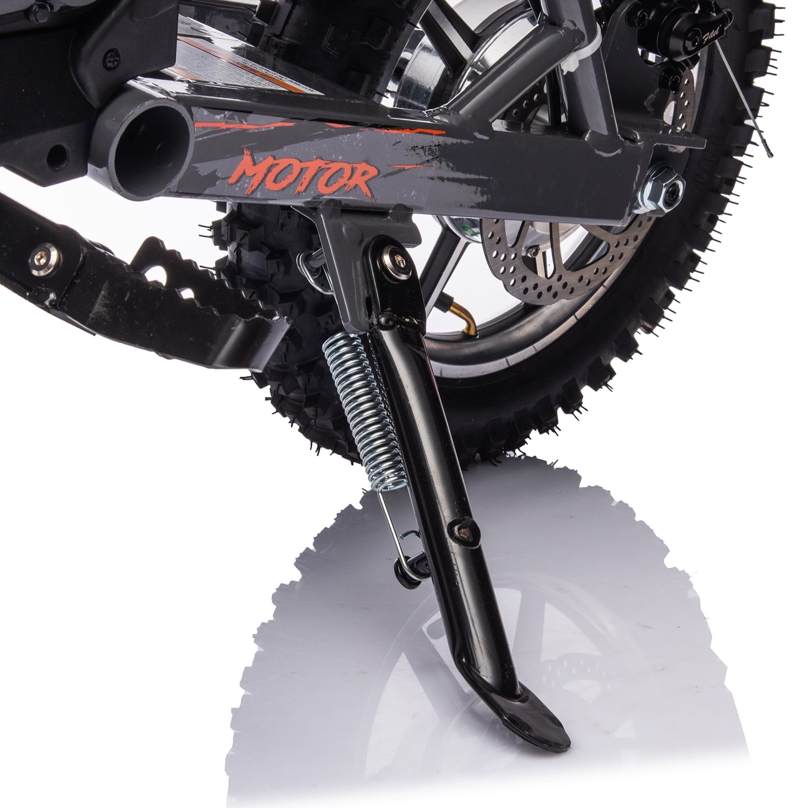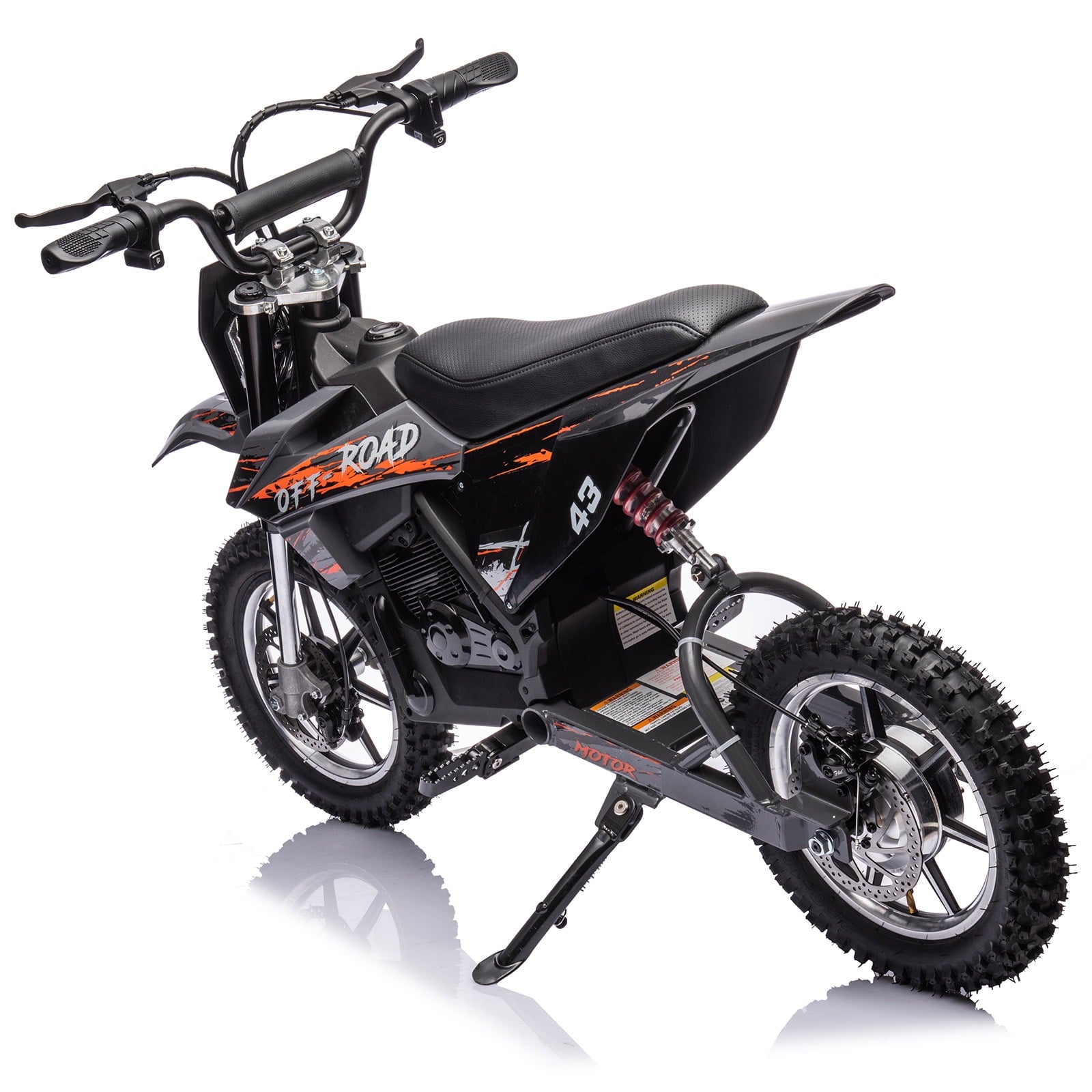 - This electric off-road motorcycle for kids is cool in shape, equipped with twist-grip throttle, full metal spring suspension, pneumatic tires, leather seat, disc brakes.