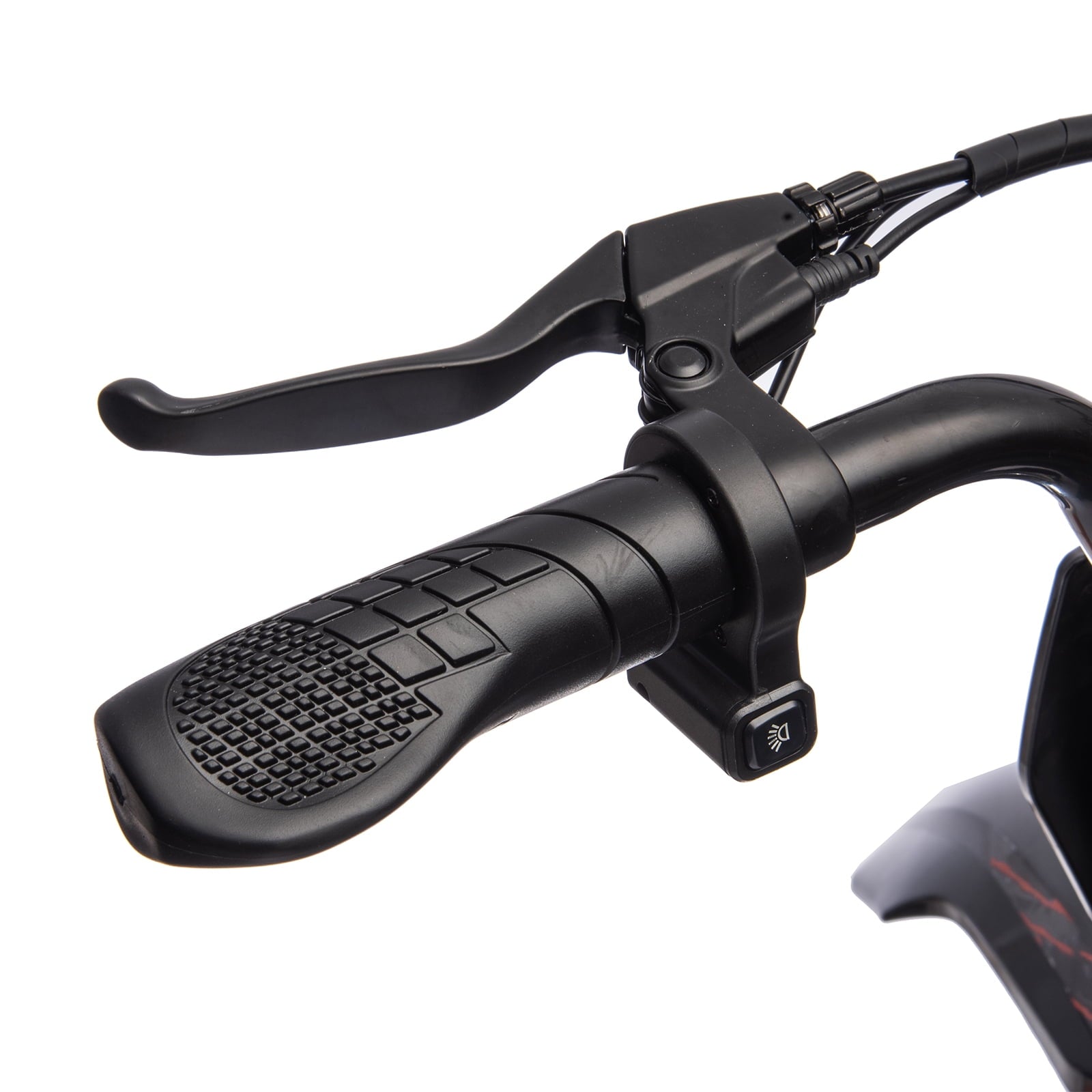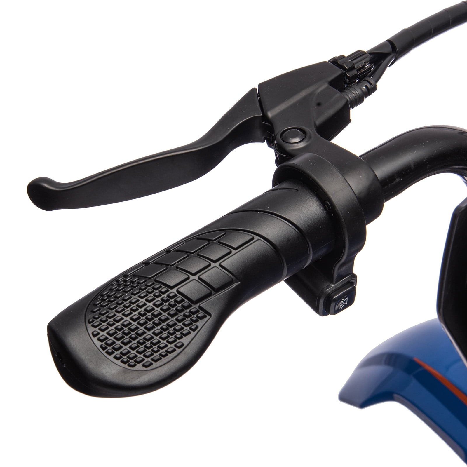 The motorcycle features a twist-grip throttle on the right-hand side, allowing kids to control the speed with ease. The left-hand side is equipped with a brake system, including disc brakes, ensuring safe and reliable stopping power. The rechargeable battery system and power display make operating the motorcycle simple and safe.