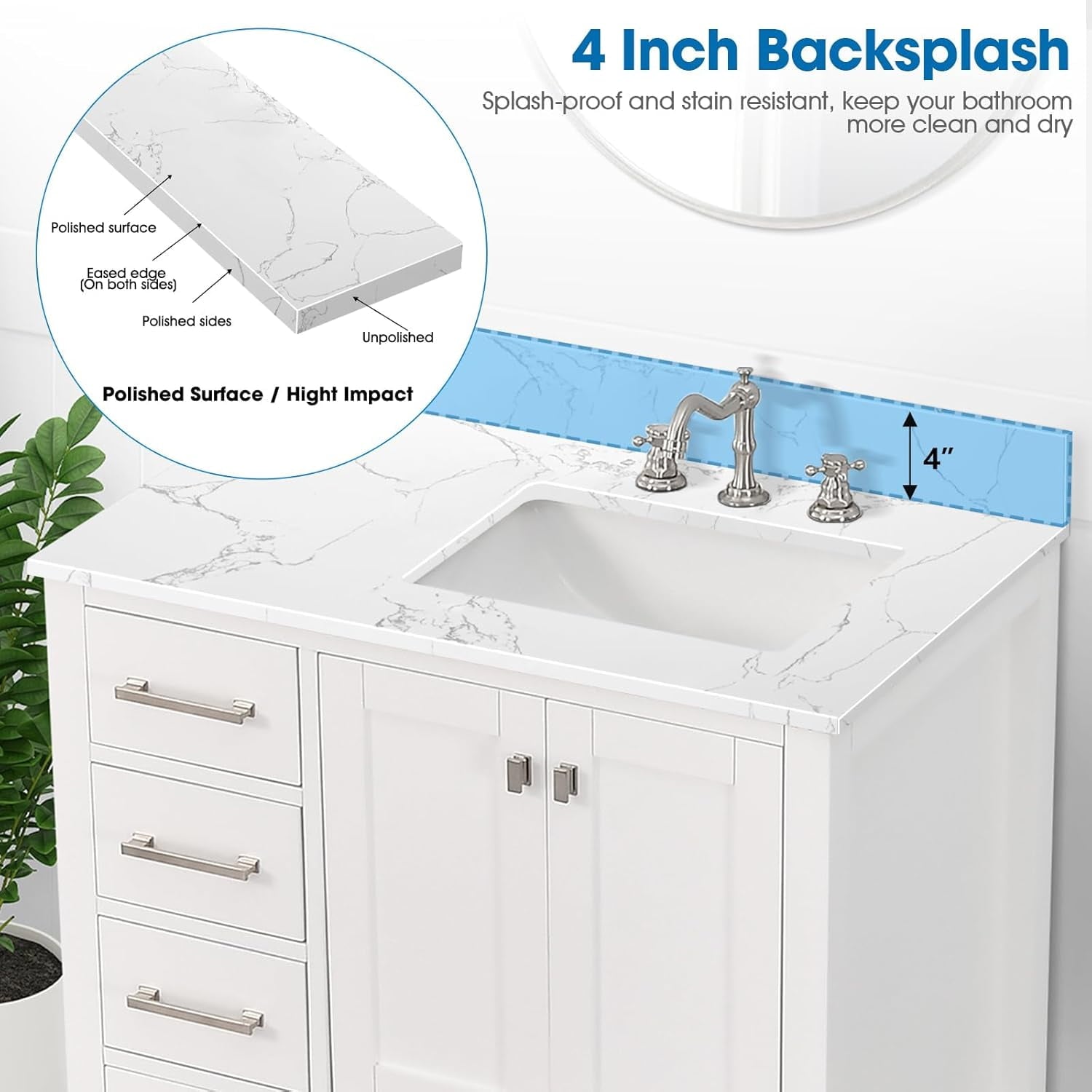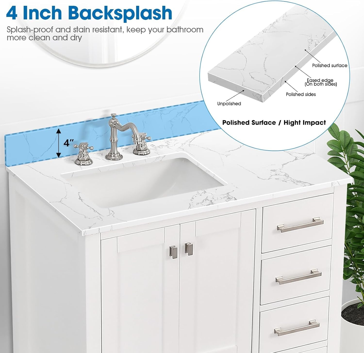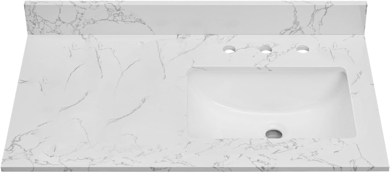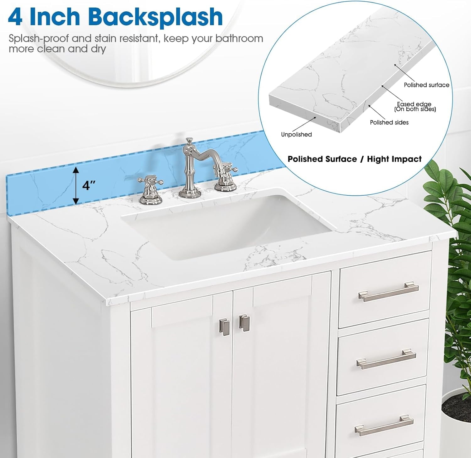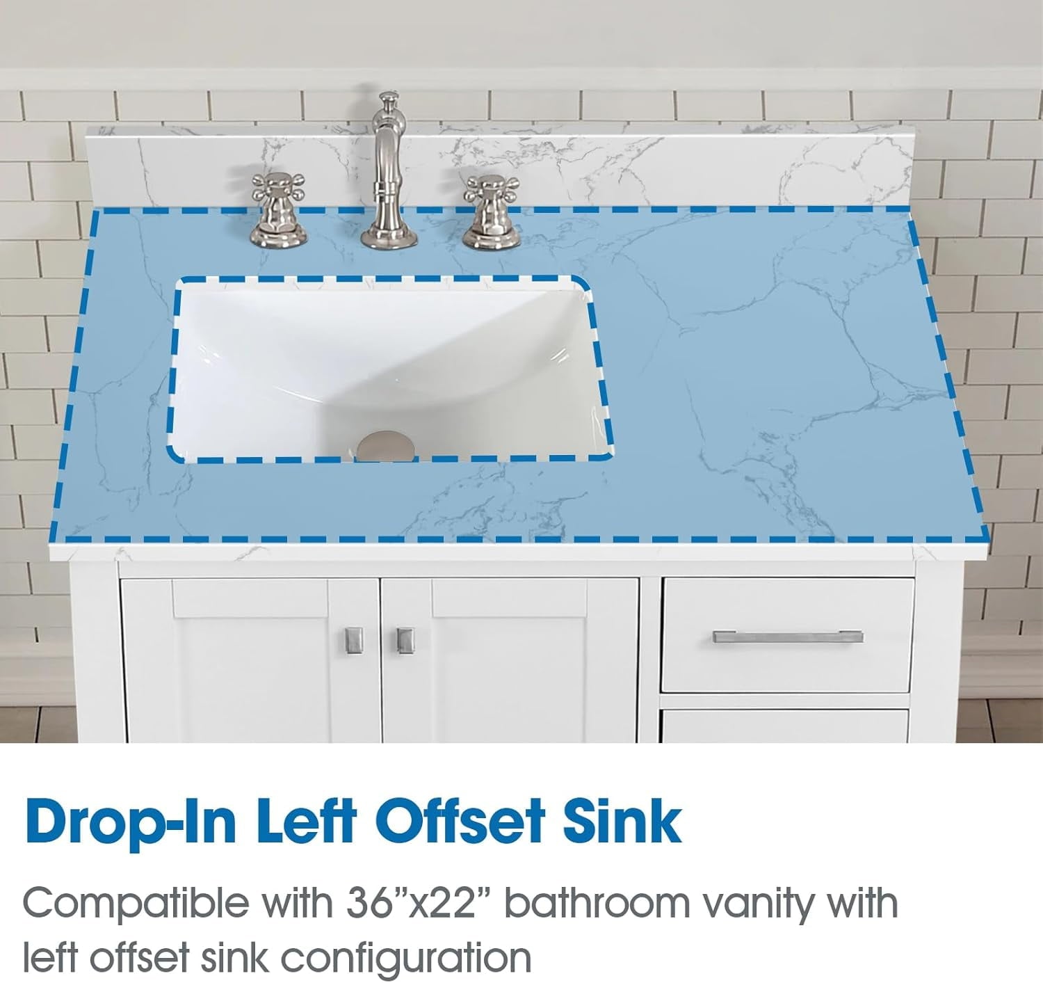 - Universal Fit: Designed for standard 36″ W x 21″ D vanity cabinets, this 36″ x 22″ countertop features a 3/4″ thick surface and a 4″ backsplash for a seamless, built-in look.Luxurious & Durable: Made from high-quality engineered stone, this vanity top combines the elegance of marble with superior strength. Waterproof, scratch-resistant, and easy to maintain for long-lasting beauty.Spill Protection: The built-in 4″ backsplash and overflow sink hole help contain water splashes, keeping your bathroom cleaner and drier.Easy Installation: Pre-drilled for an 8″ widespread faucet and includes a pre-installed rectangular undermount ceramic sink (left-side placement) for a quick, hassle-free upgrade.Ready to Install: Includes the vanity top, ceramic sink, and 4″ backsplash. Ships in damage-resistant packaging for secure delivery.